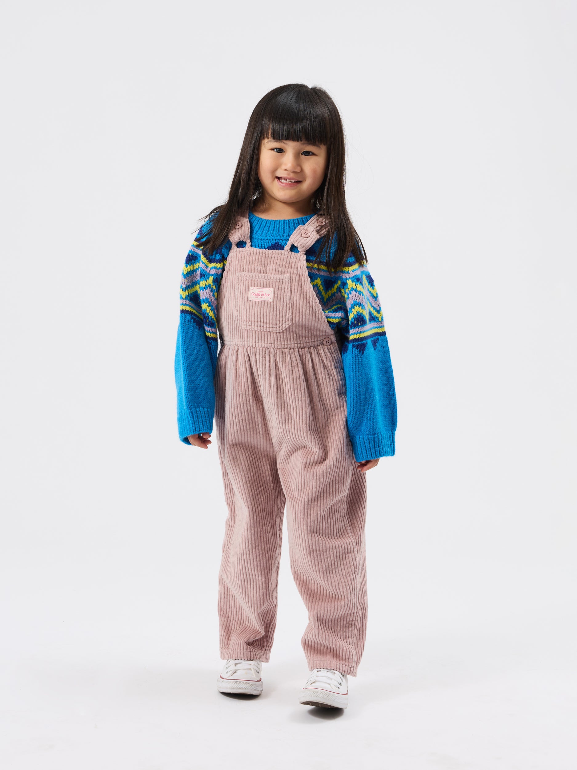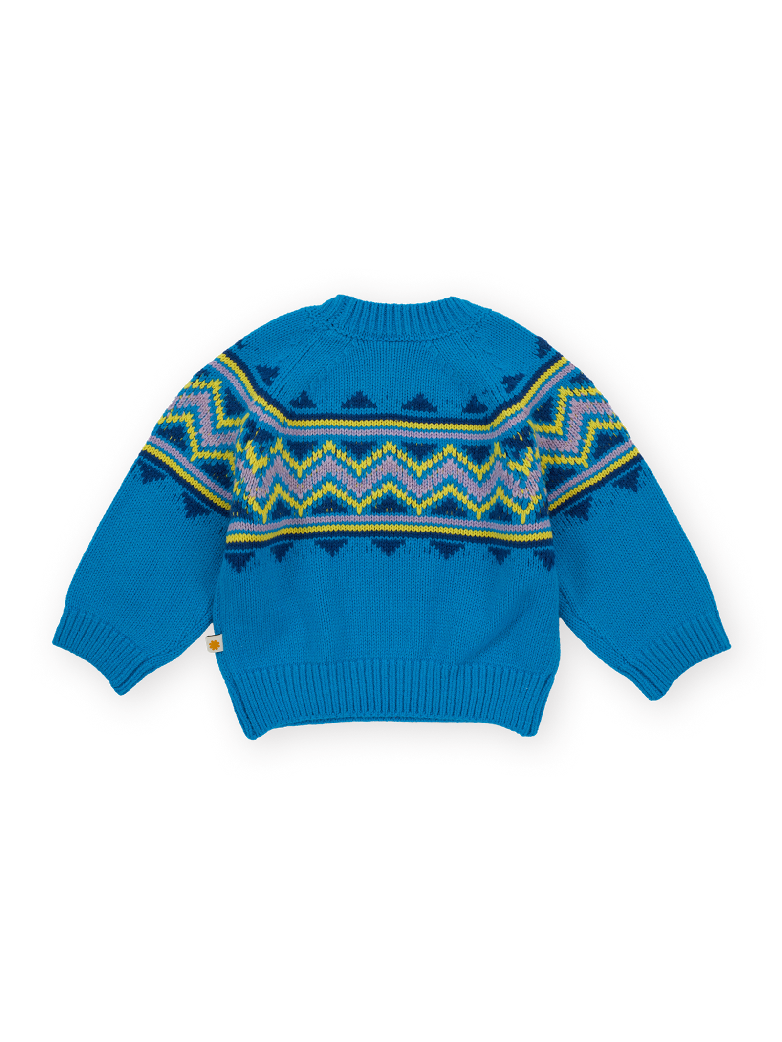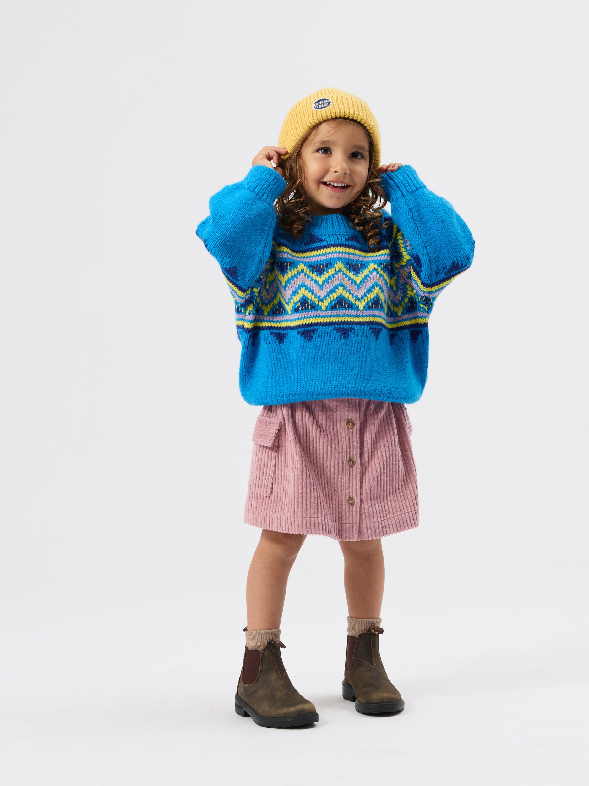 Chunky blue knit, with playful intarsia panels straight from a ski lodge circa 1990. Warm, cosy, and snug as a bear hug—perfect for snowy adventures or bringing serious retro energy to the playground.