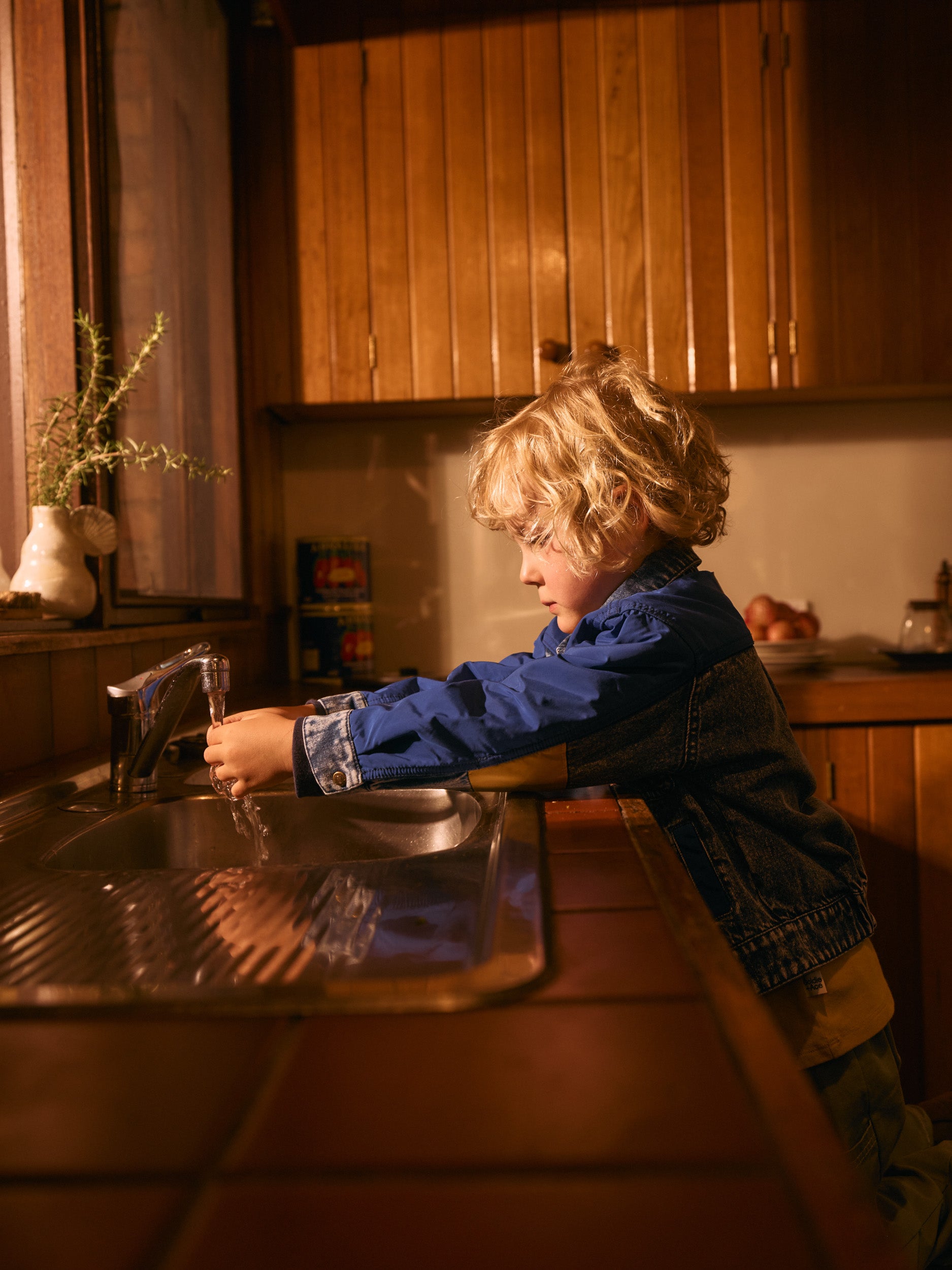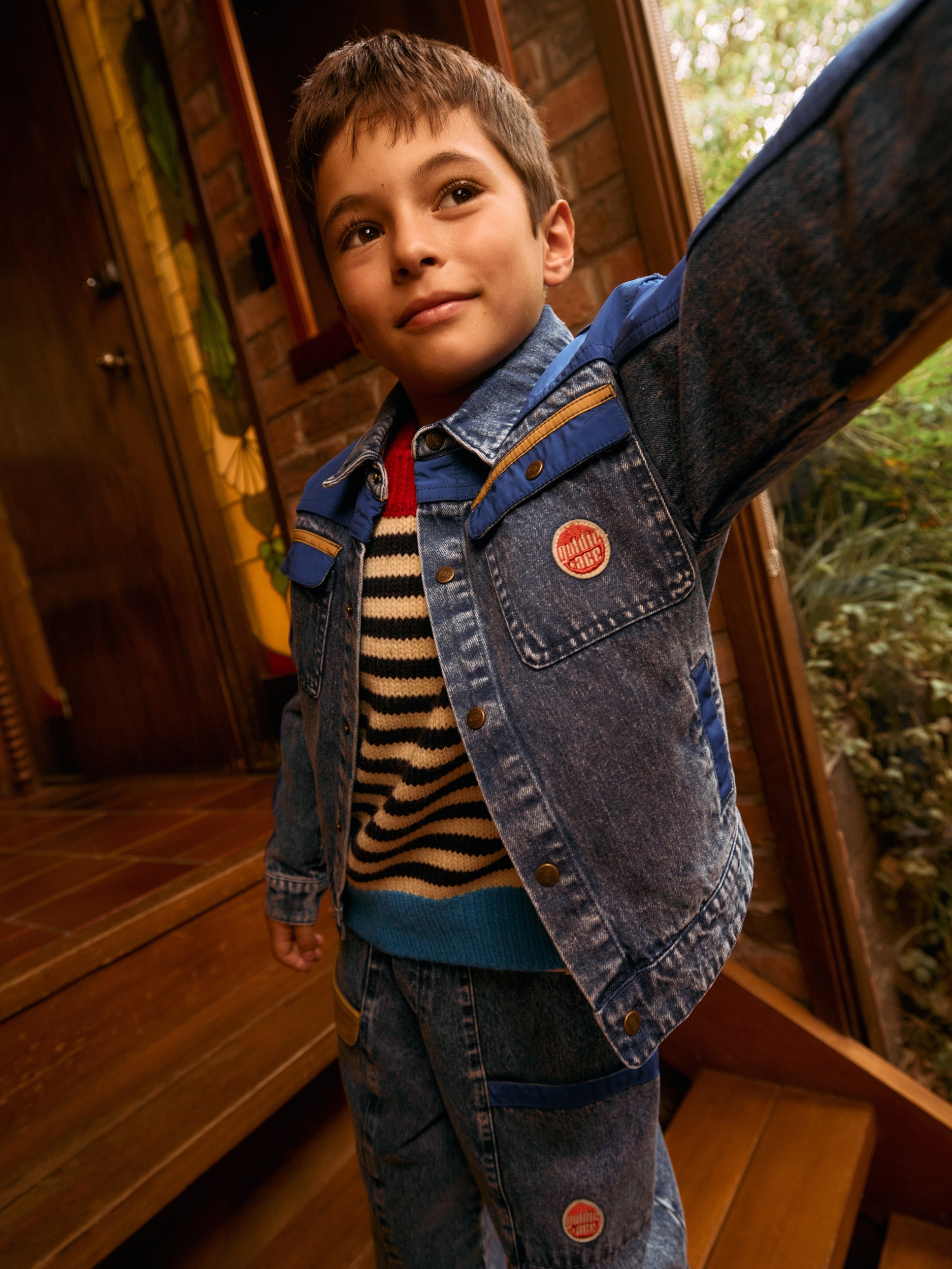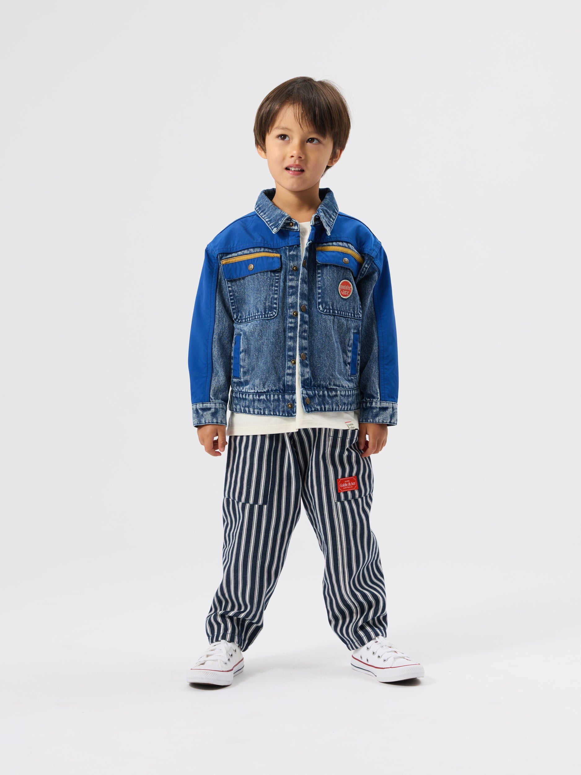The denim jacket your kid will catch you trying to squeeze into—heavyweight indigo with bold colour-block trims, snaps on the front, and functional pockets. Vintage-washed with serious retro energy. The one you’ll want to frame after.