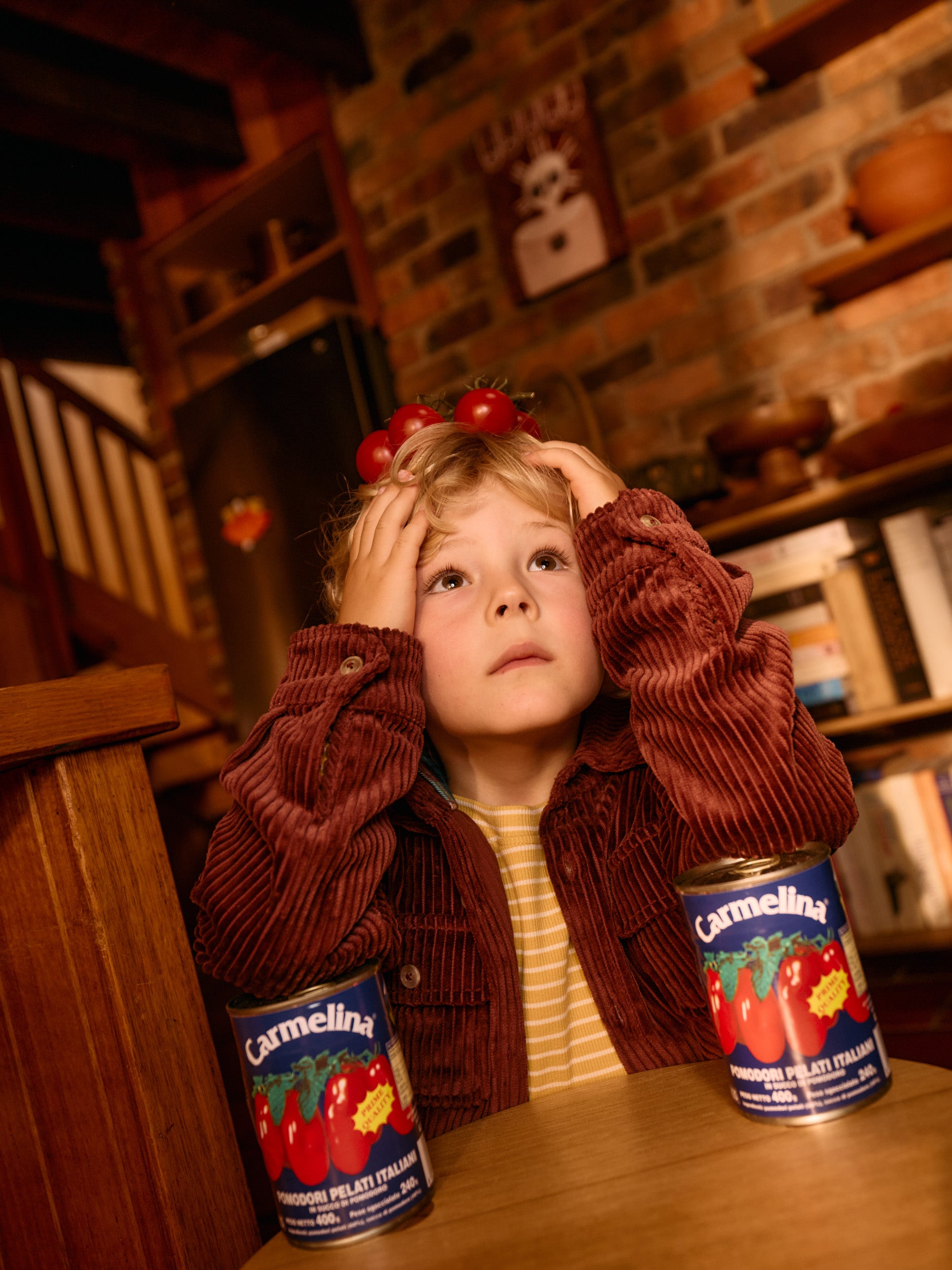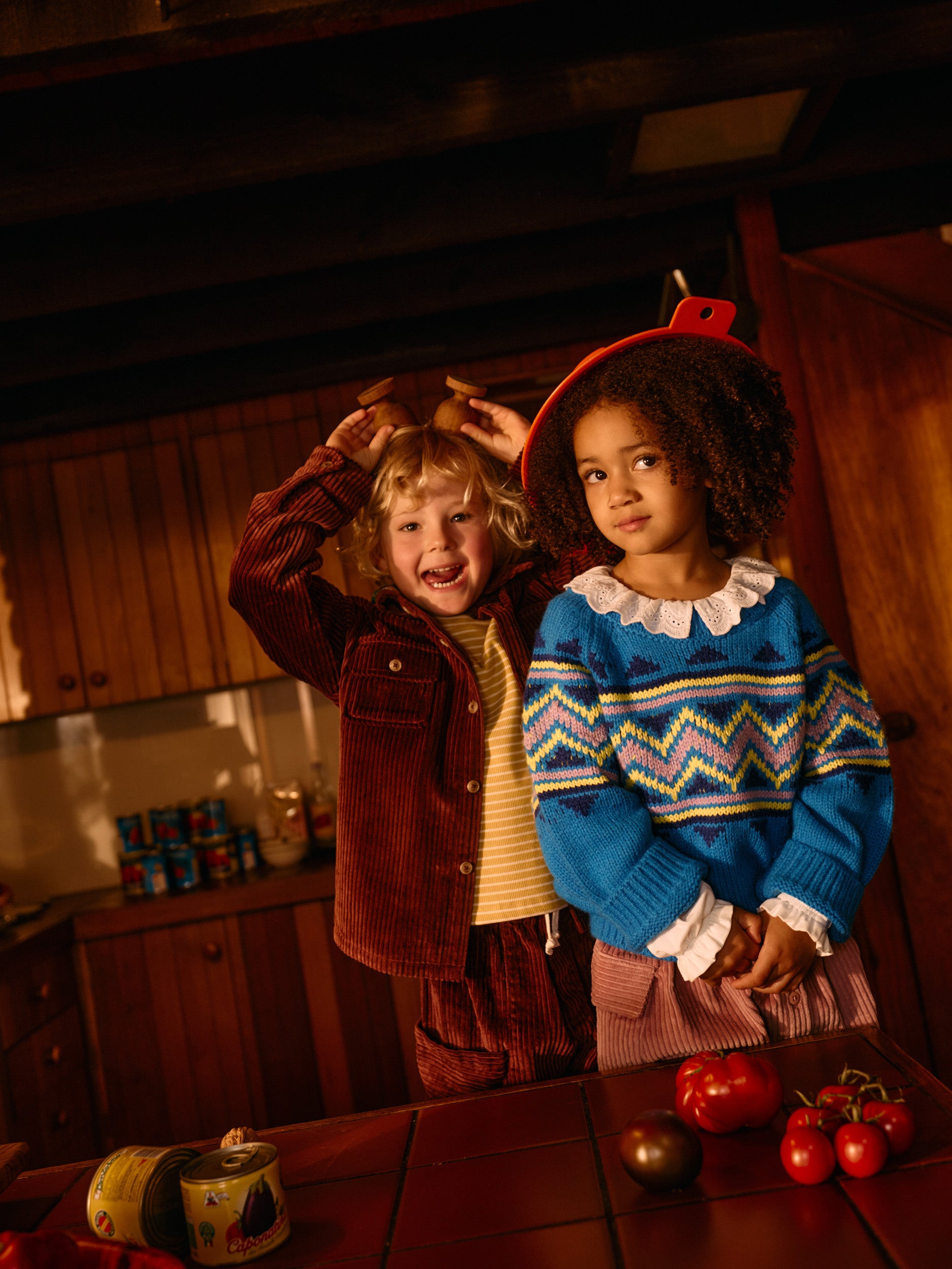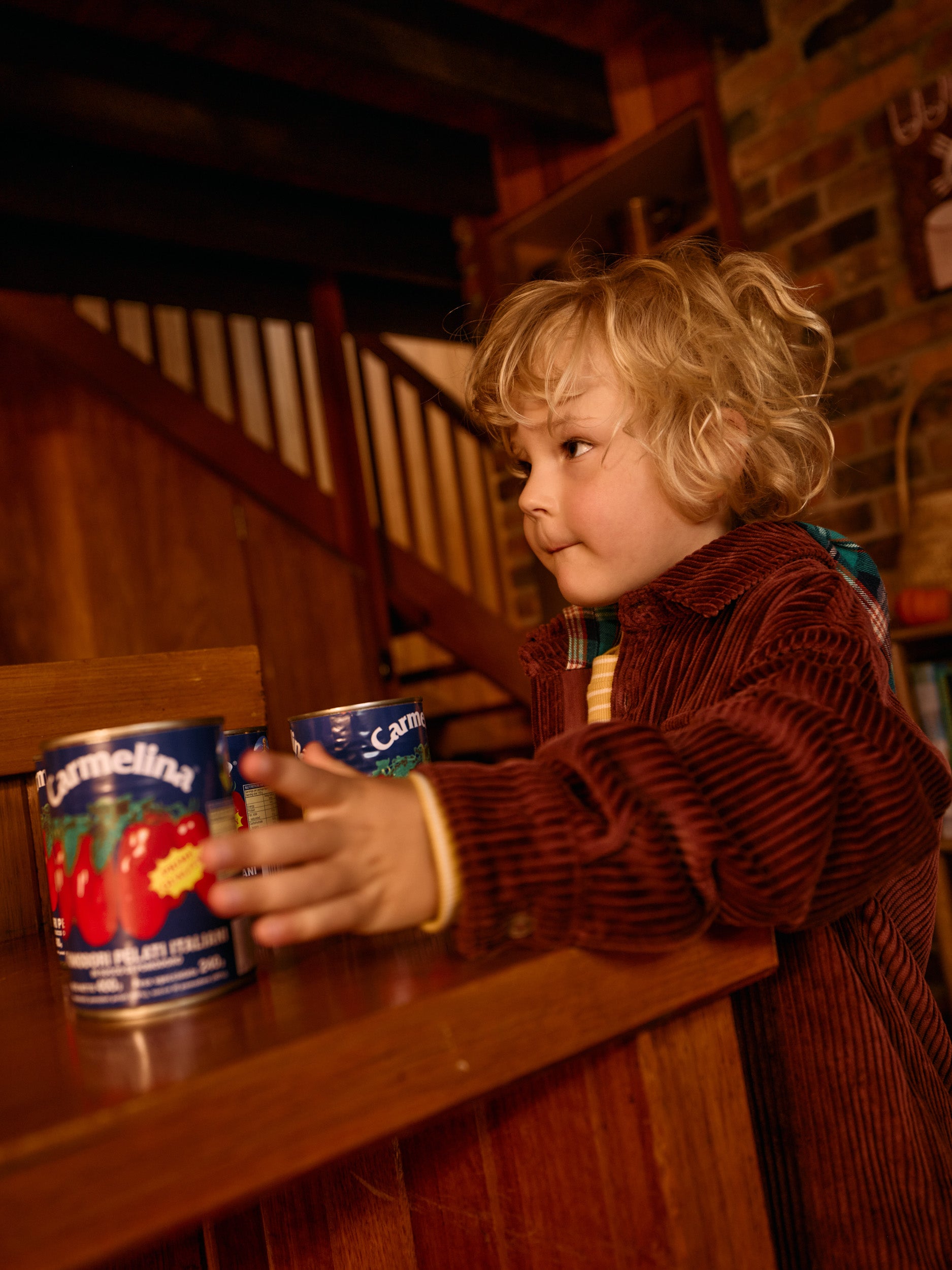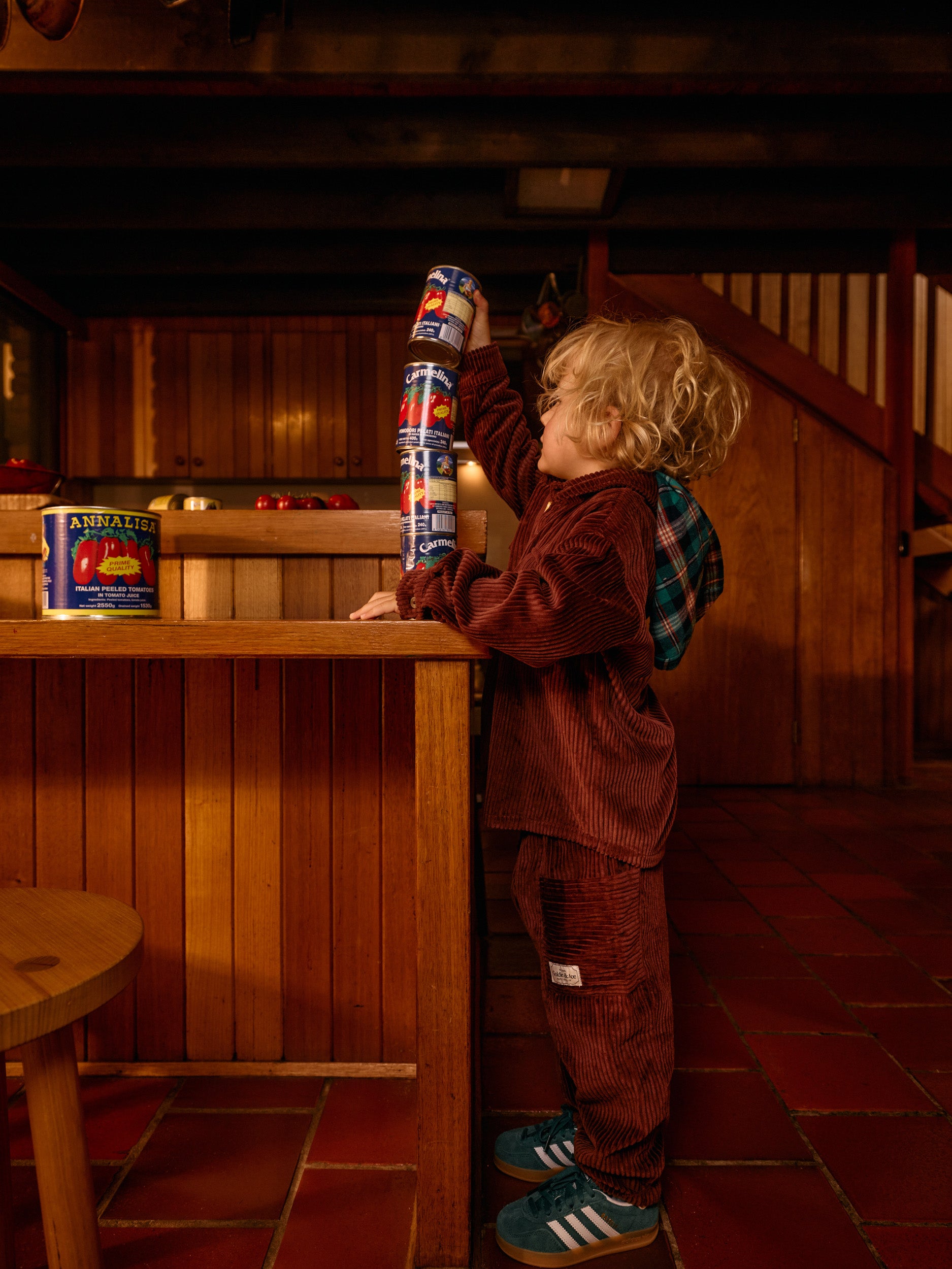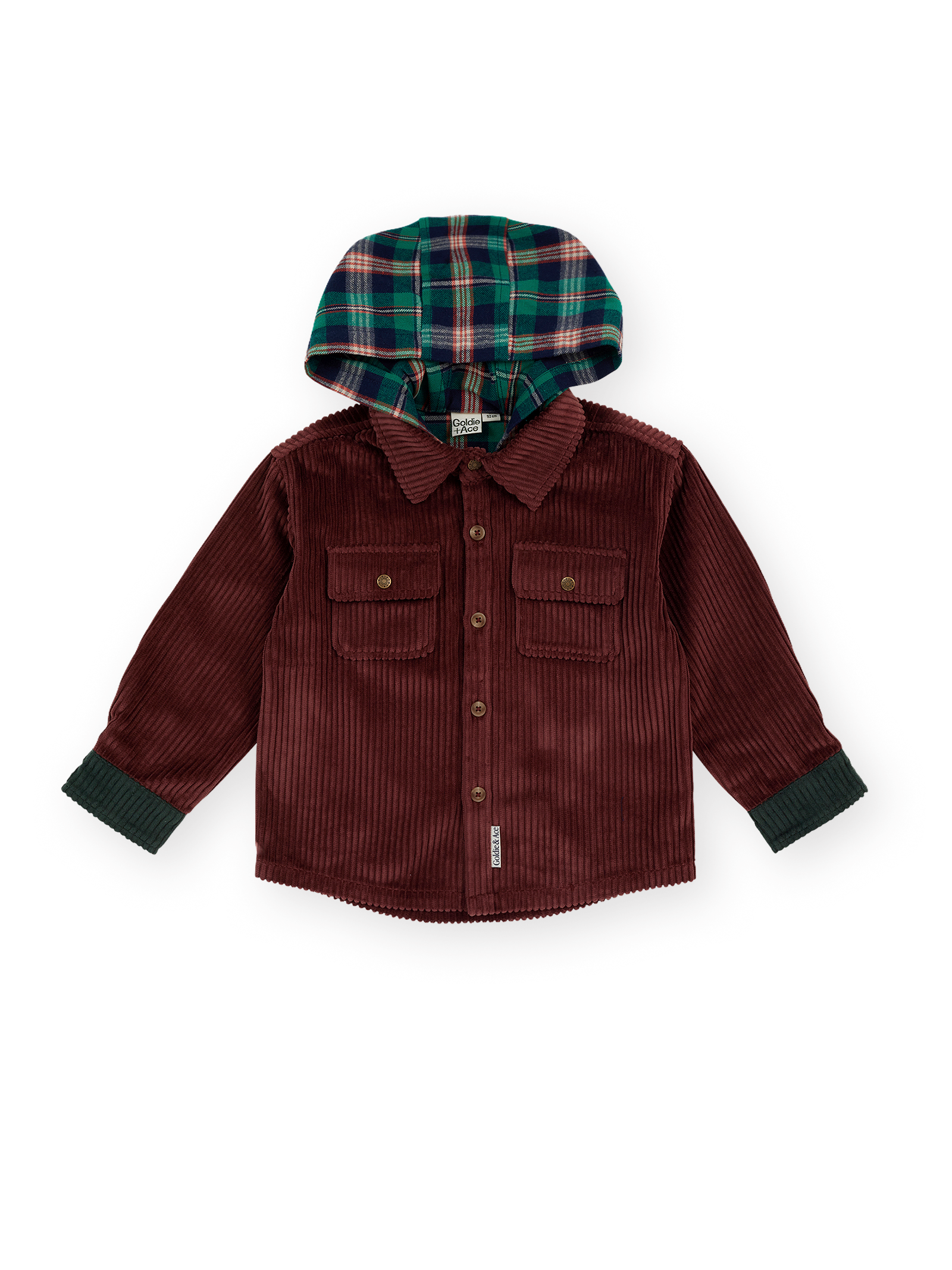 Brown corduroy hooded shirt with a lined yoke, snap buttons, and a gingham-print hood – ultra warm, ultra cosy, and ultra easy to layer with on cooler days and nights.
