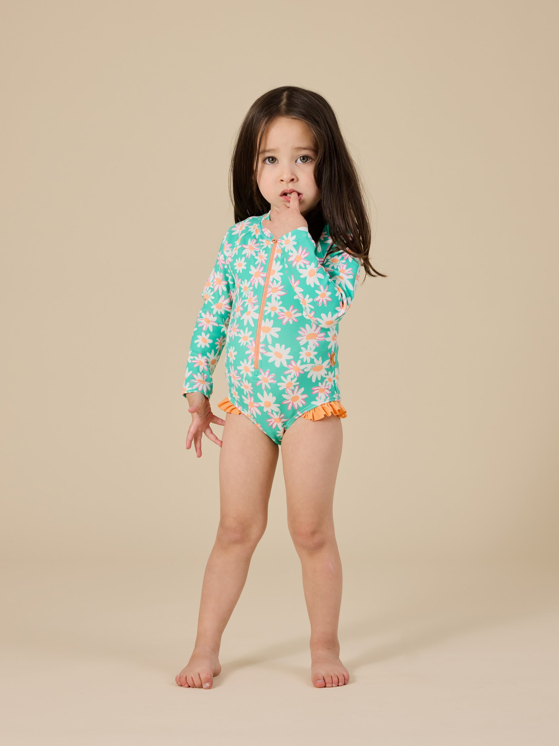 Turquoise, daisies, and a pop of orange frill – long sleeves to keep the sun off while they pretend to be mermaids (or just splash everywhere).