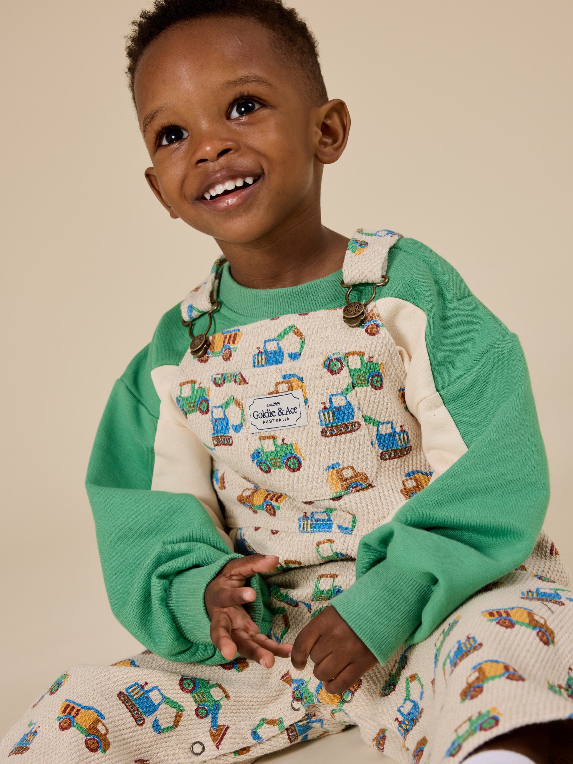 The Austin Overalls are the Official Daylight Dept. Uniform: but now with a truckload of charm. Featuring all-over digger trucks printed on a woven cotton linen blend – these overalls are built for big plans, bigger messes, and whatever detours the day brings.