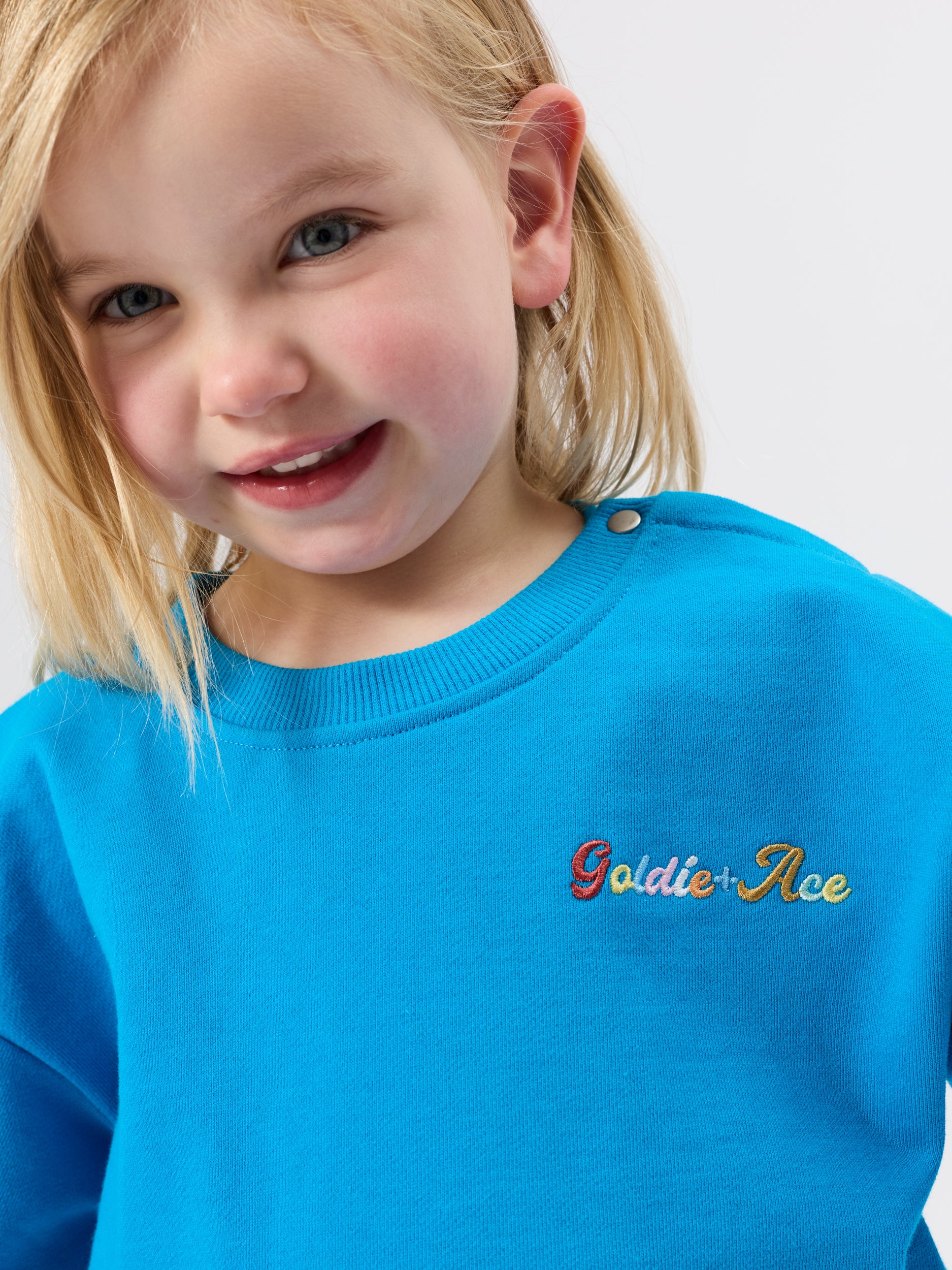 Classic sweater in bright blue – perfect for spotting them across the bike track, with a cute rainbow Goldie + Ace embroidery on the front and comfy loop-back terry cotton to keep up with every twist and zoom.