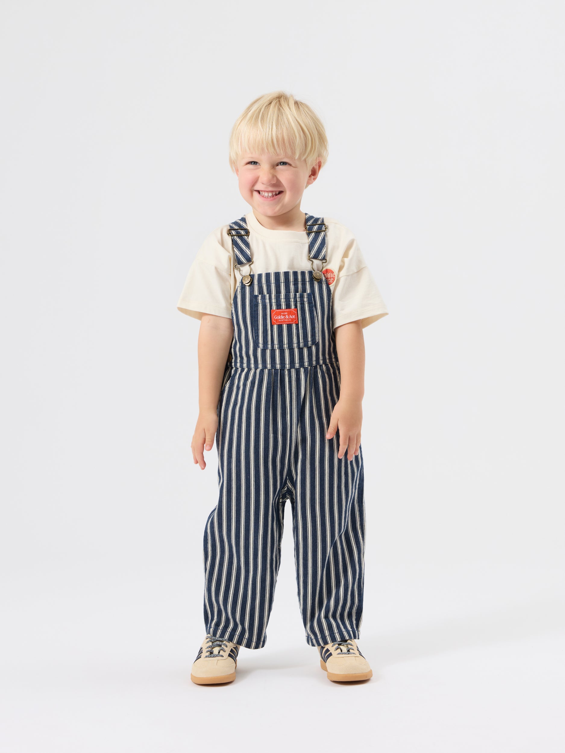 A classic white cotton tee with a vintage-style Goldie + Ace badge – a simple and soft essential tee, ready to wear on it's own or layered for endless playground fun.