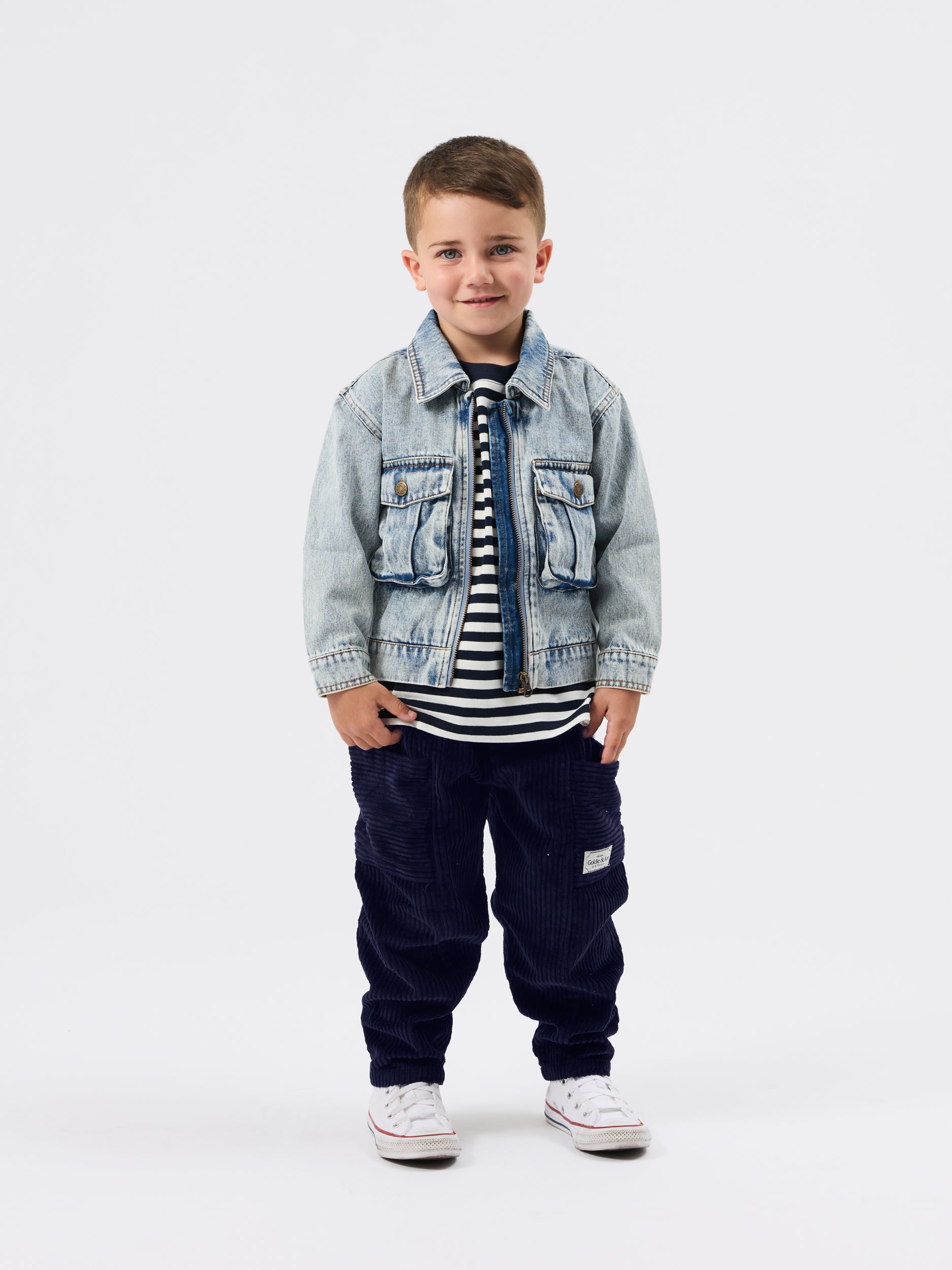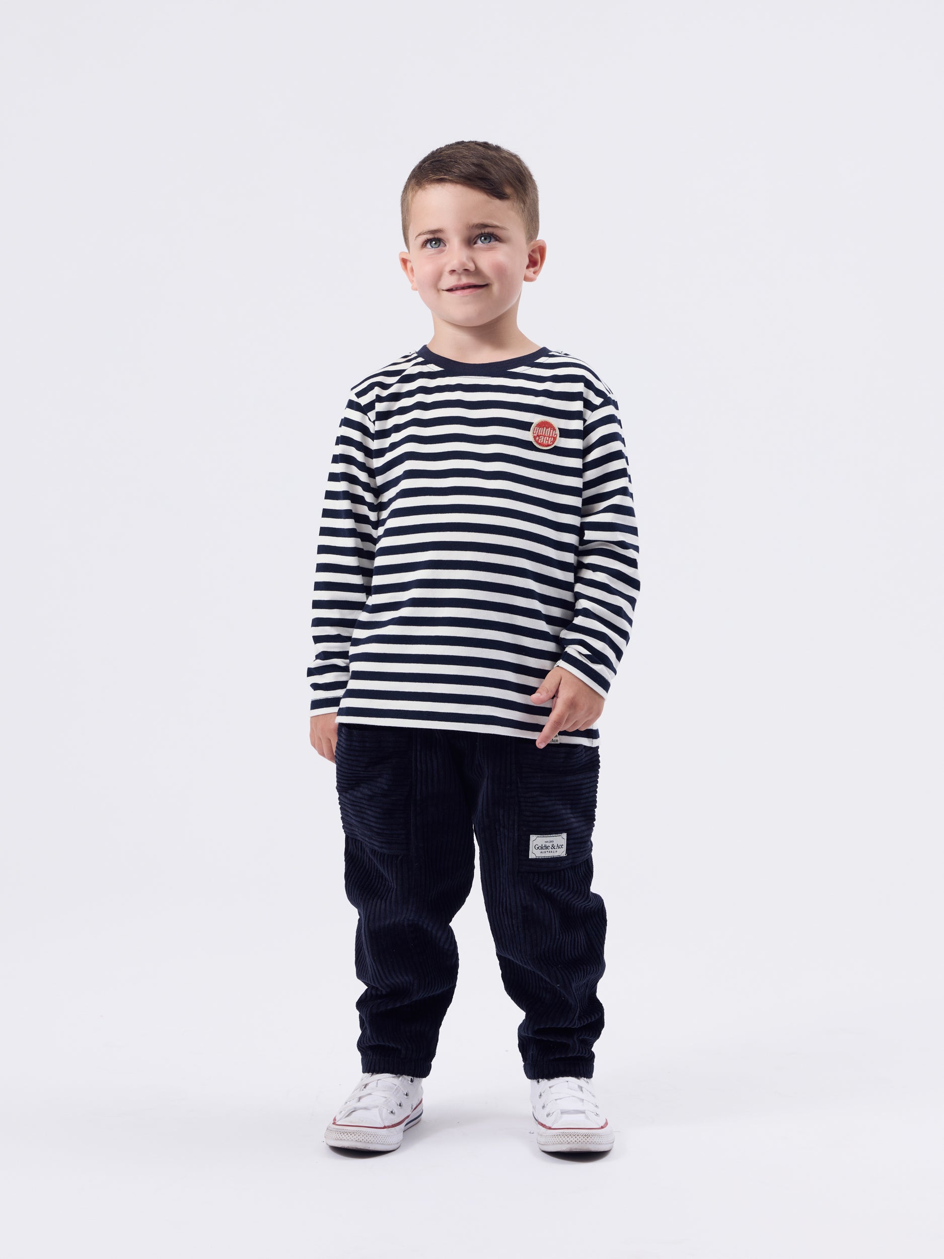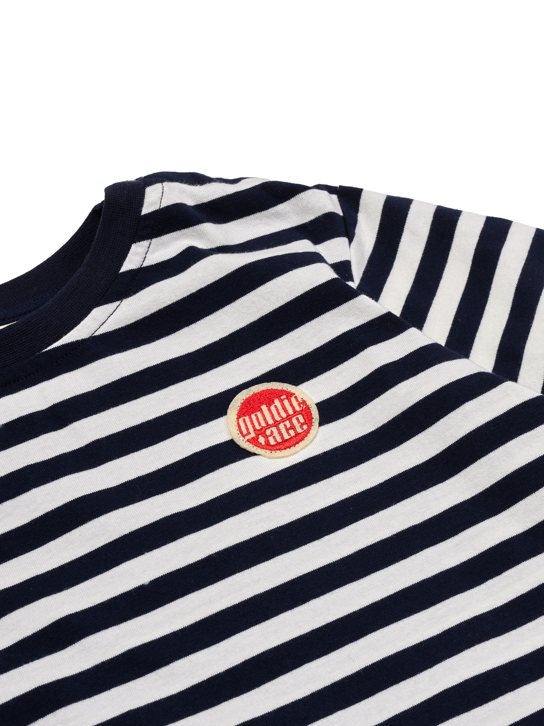 Navy and white striped long-sleeve tee with a vintage-style Goldie + Ace patch – soft, stretchy, and built for mini explorers who move fast, get messy, and never slow down. Perfect for layering or as a standalone tee.