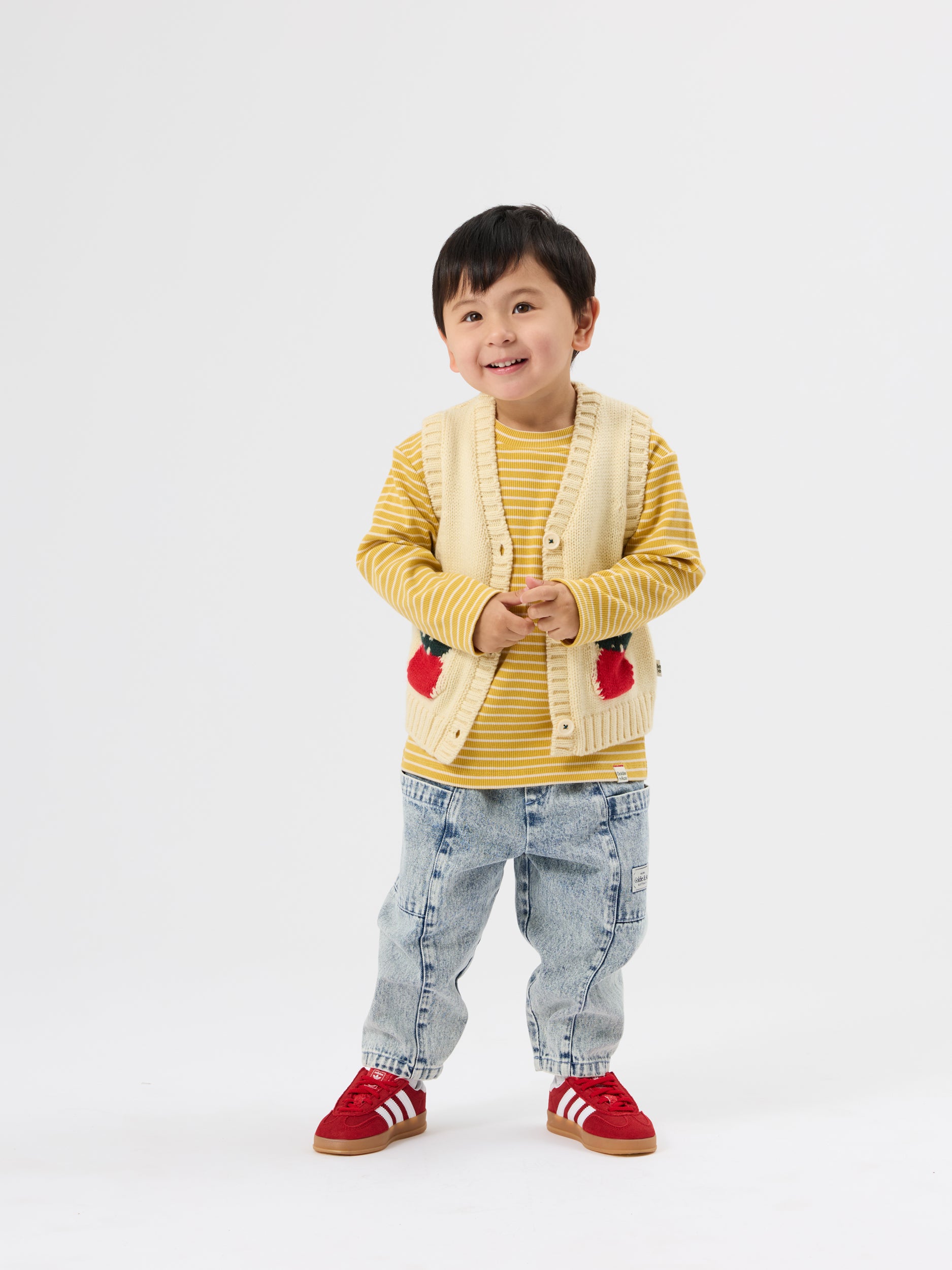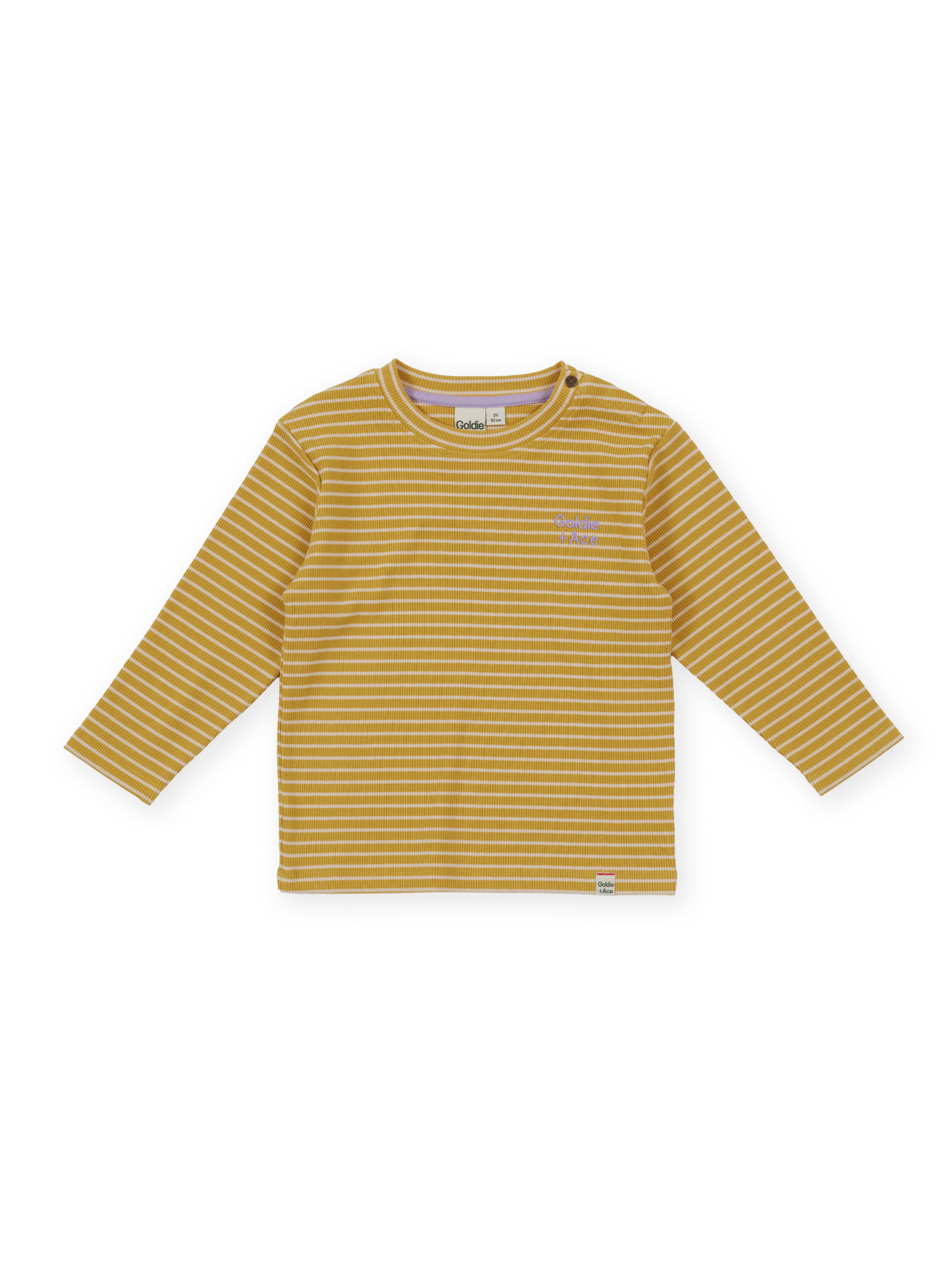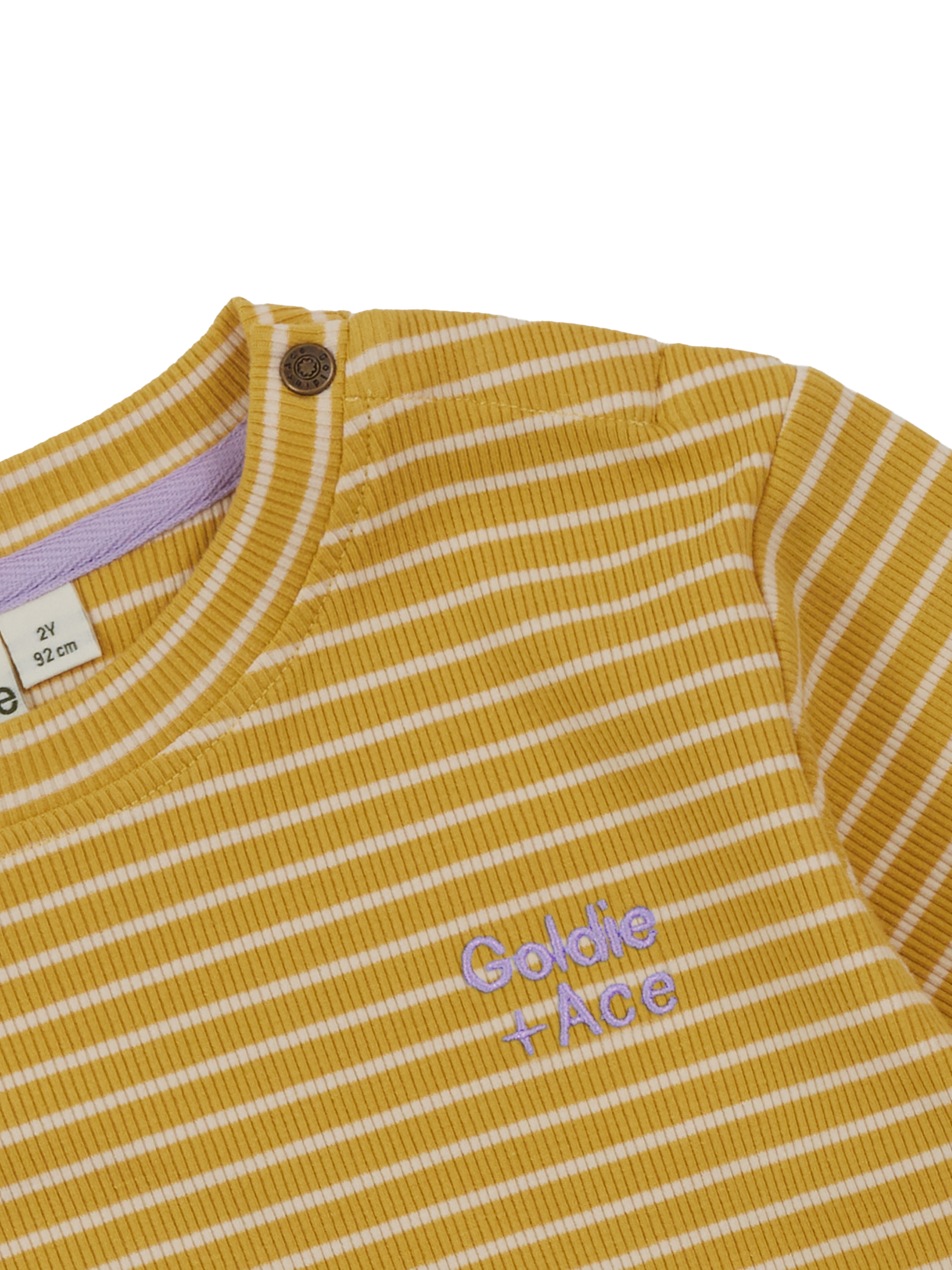 Say hello to sunshine stripes! Soft yellow and white ribbed cotton with a subtle Goldie + Ace embroidery – perfect layered under our overalls or pinafores, or worn solo for easy every day wear.