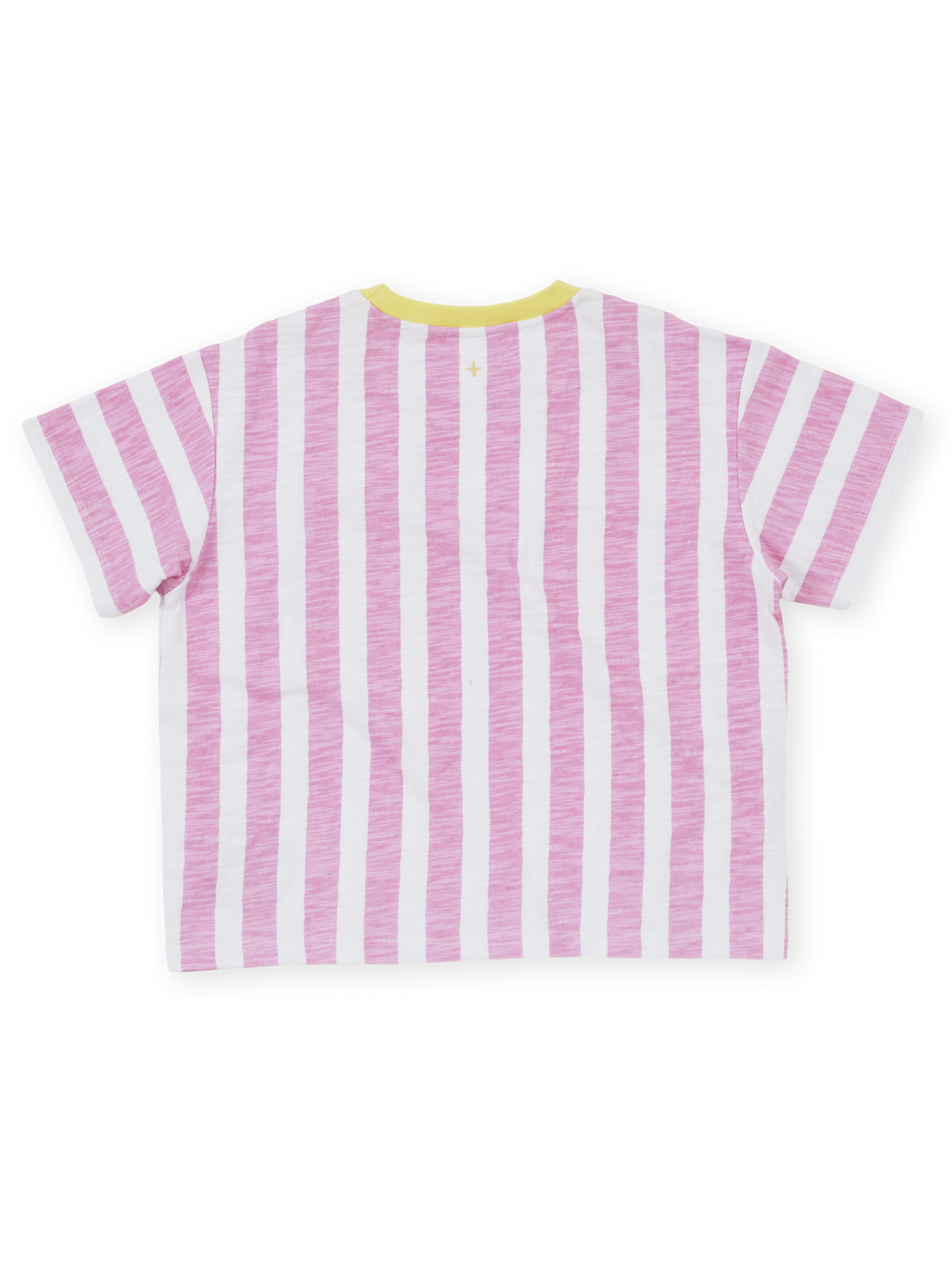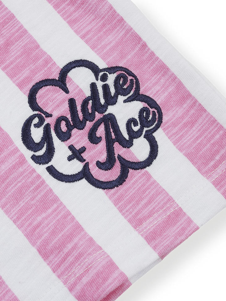Pink stripes that pack a punch. Comfy enough for cartwheels, cute enough for grandma’s photo album, and finished with a little embroidered wink from us.