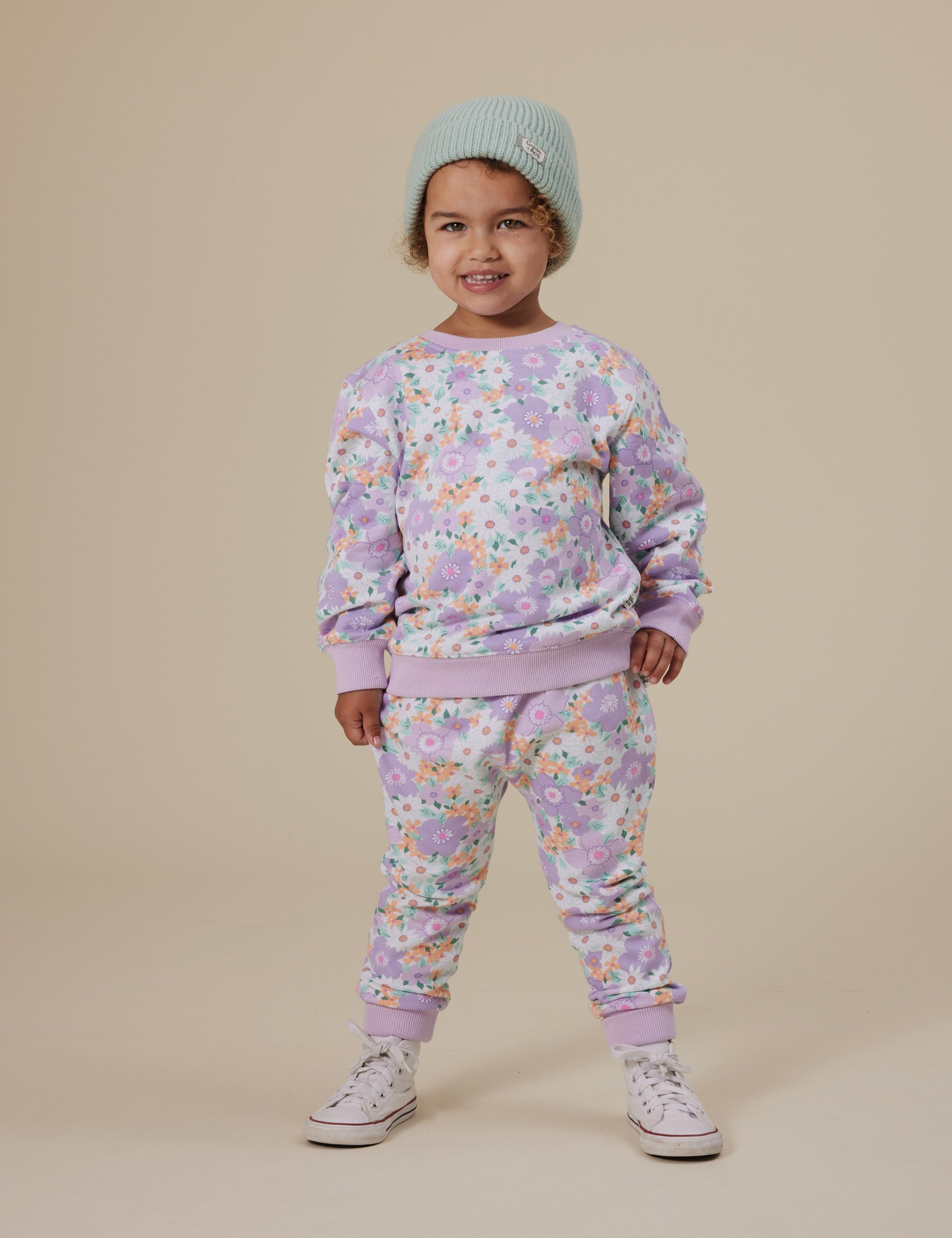 Cozy cotton terry sweatpants featuring a charming lilac floral design.