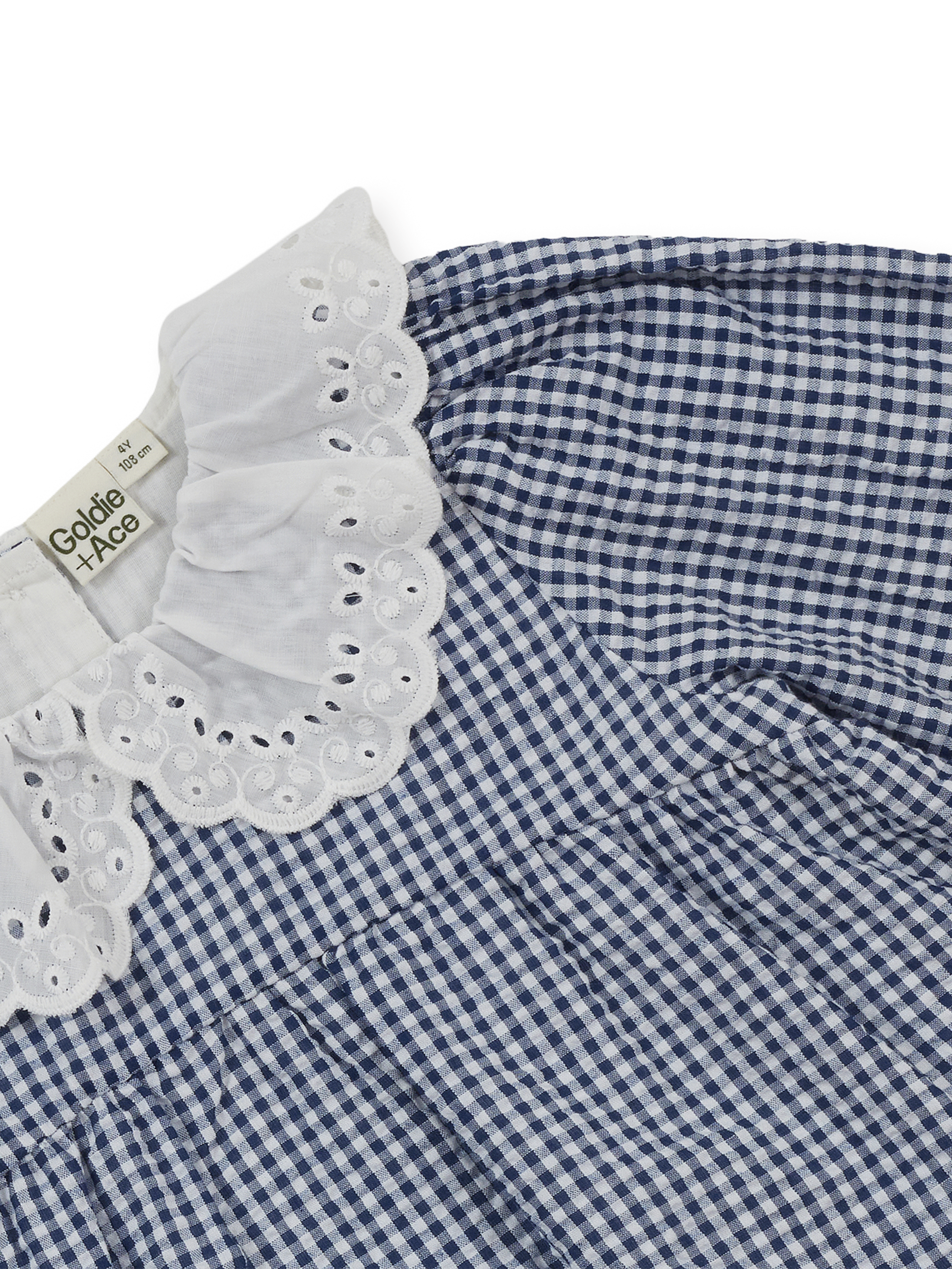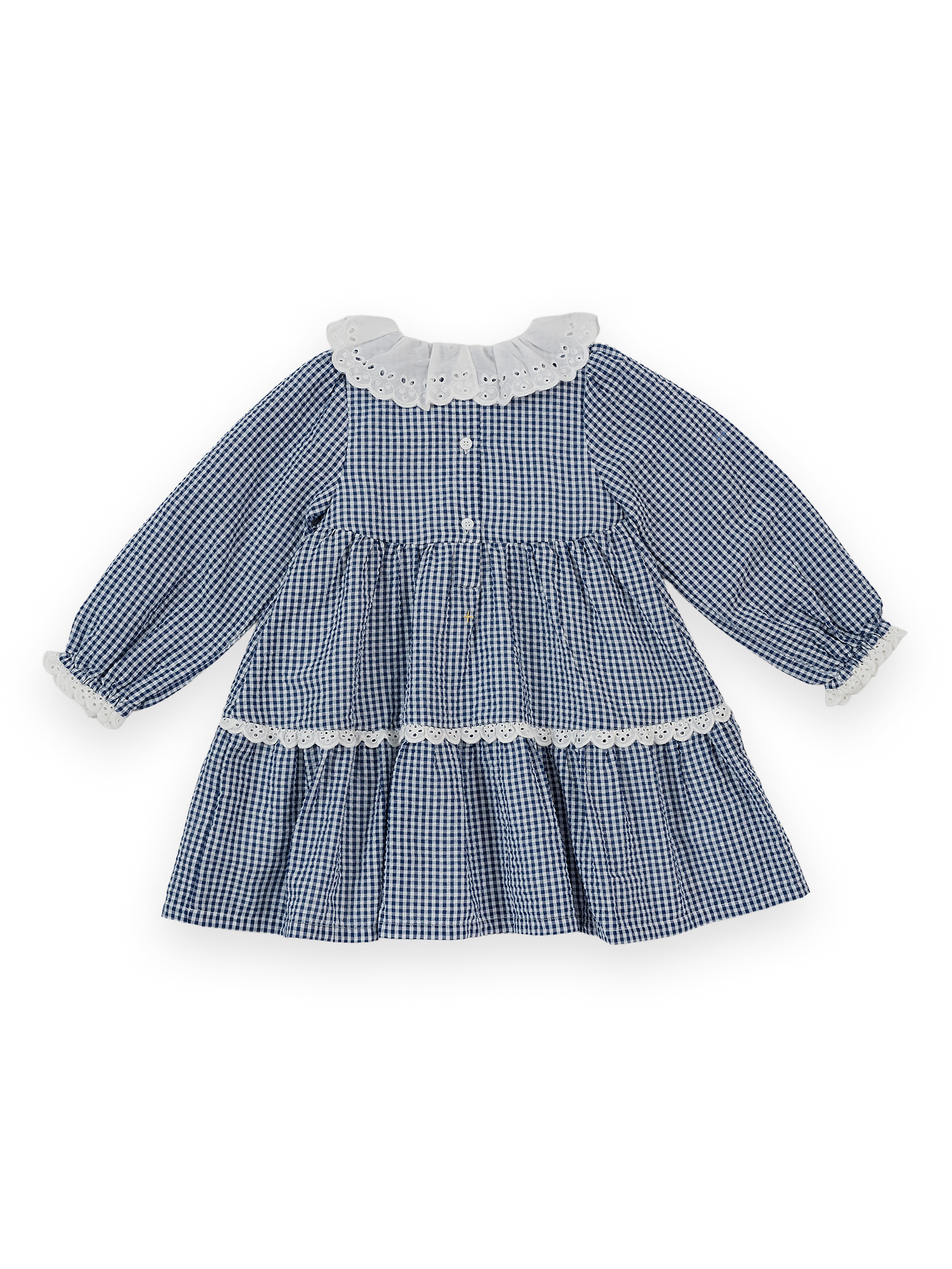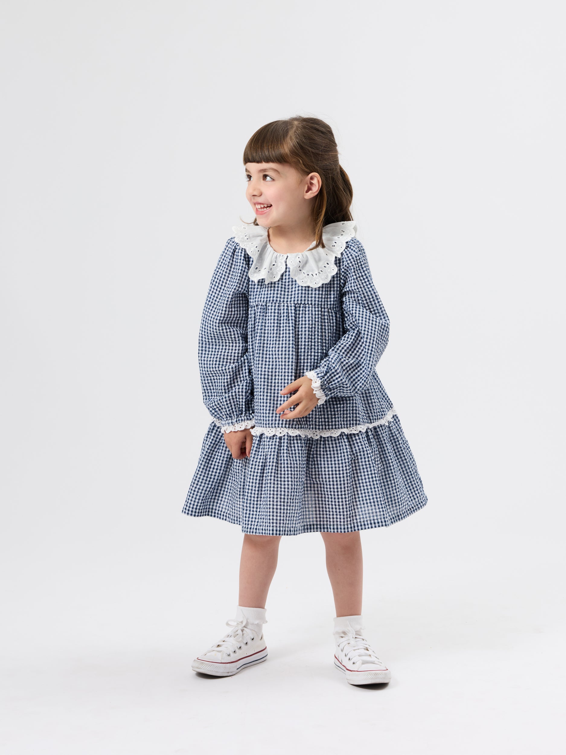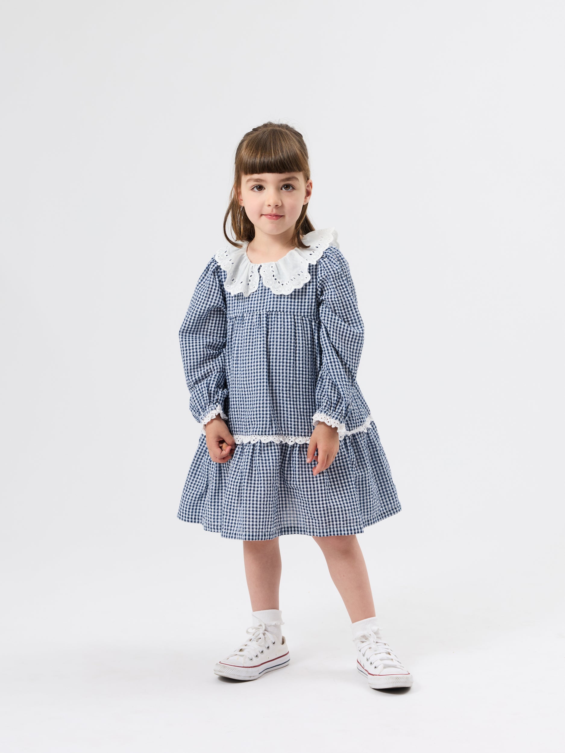 Navy gingham dress with a broderie anglaise collar and soft cuffs – the sweetest heritage-inspired piece, easy to layer, twirl in, and pass down for years to come.