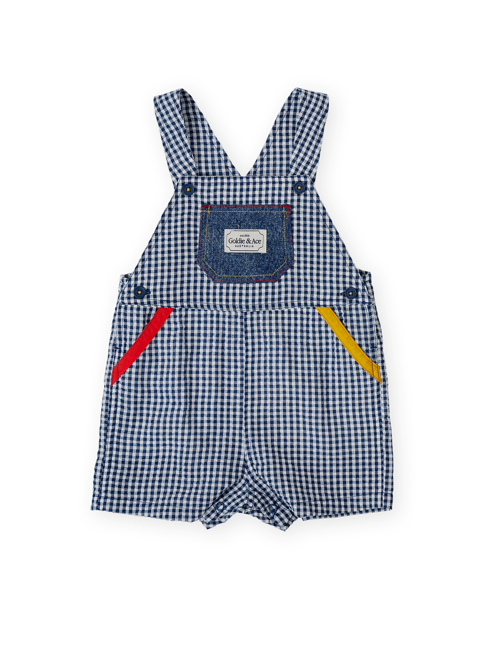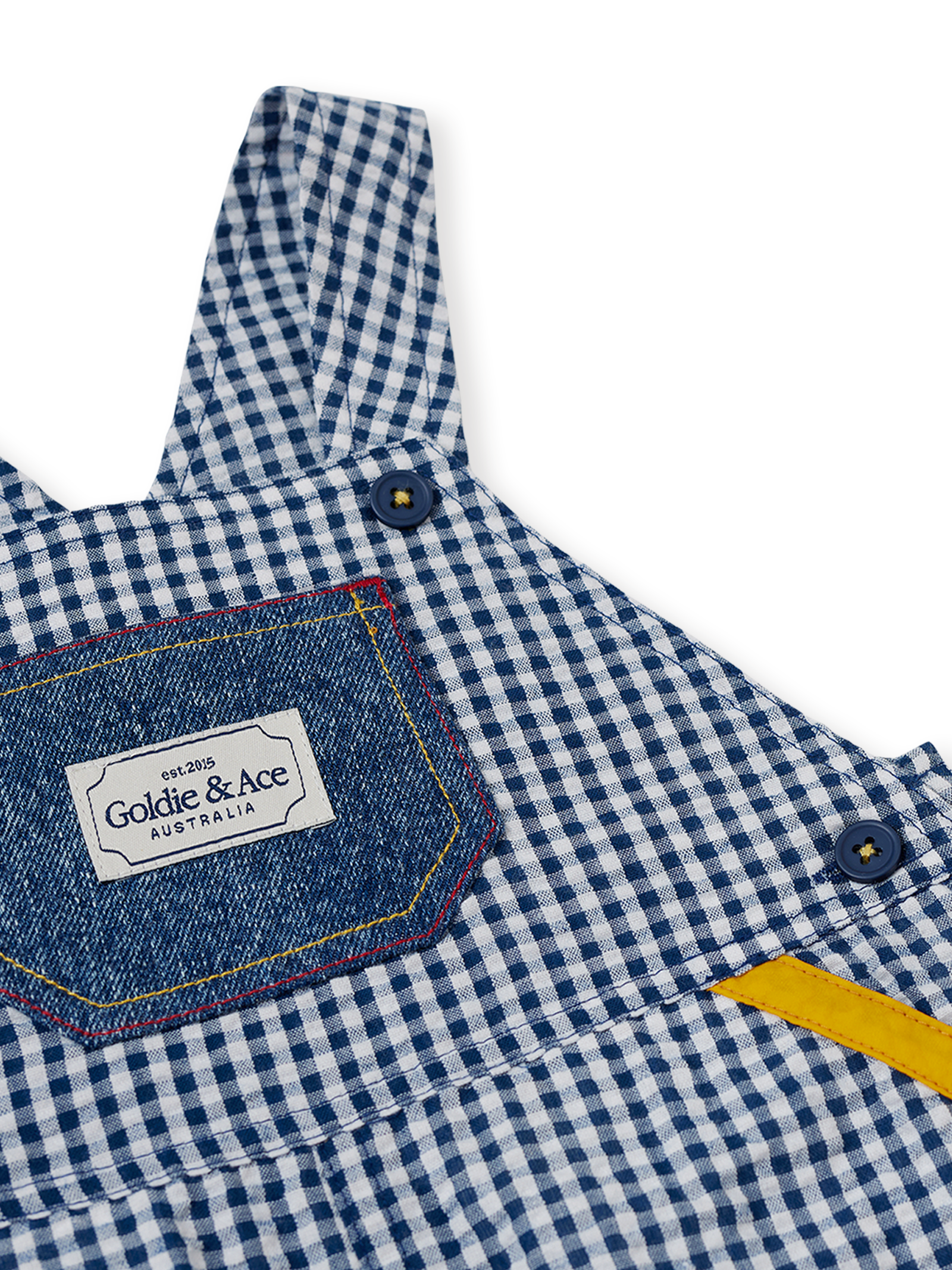 Classic blue gingham with playful pops of red and yellow trim - a little vintage, a lot of fun. Relaxed, easy to wear and perfect for digging, drawing, or just twirling in the sun.