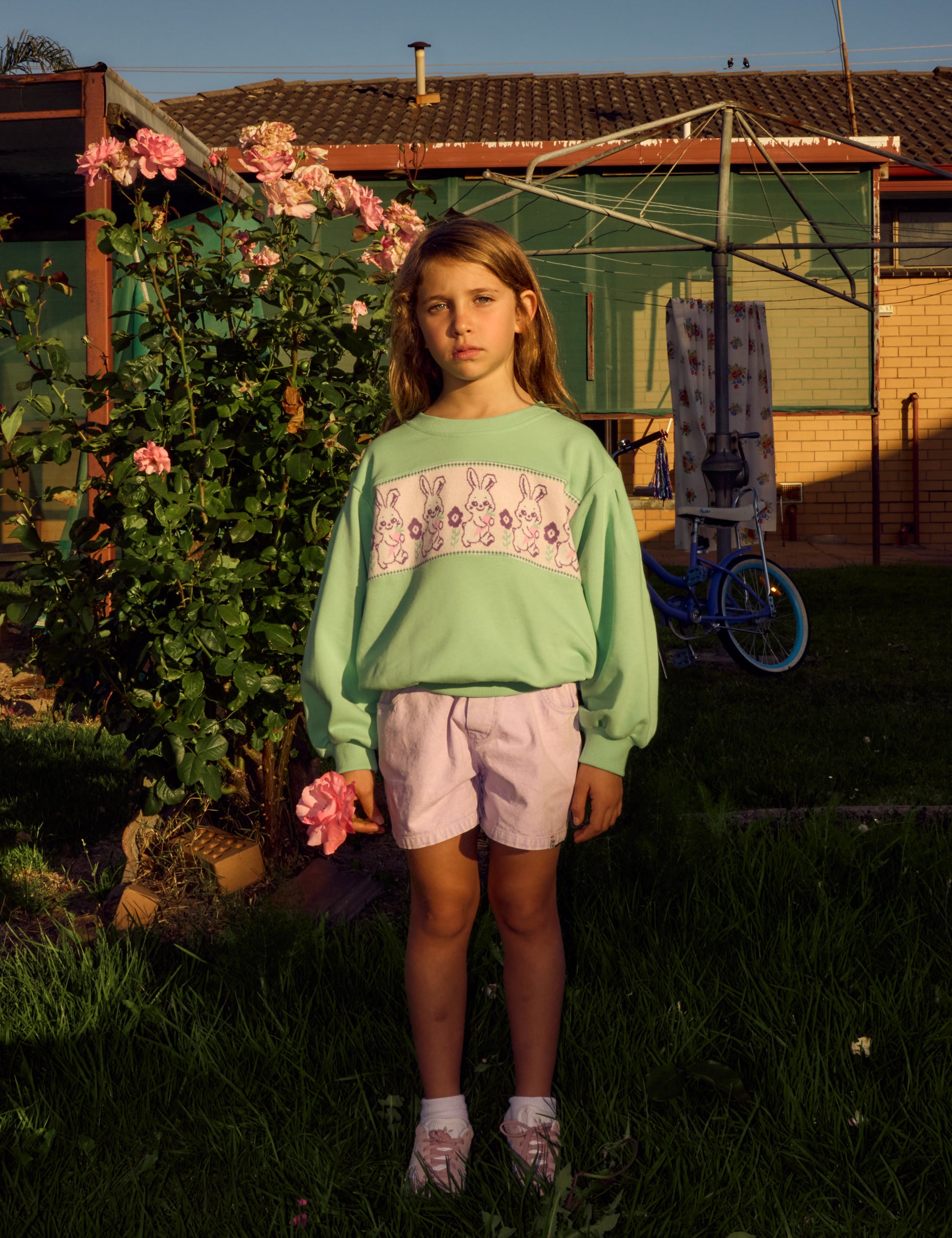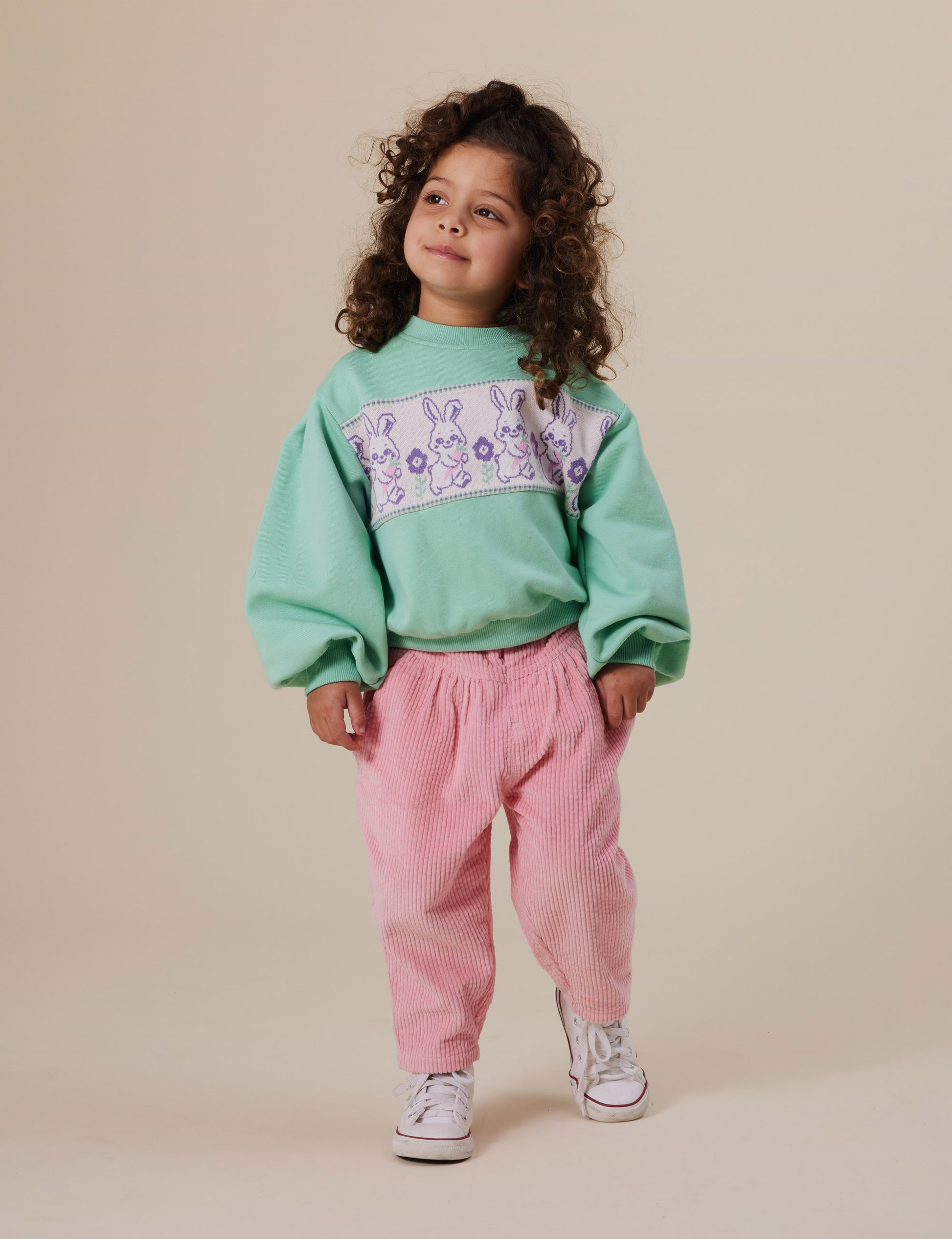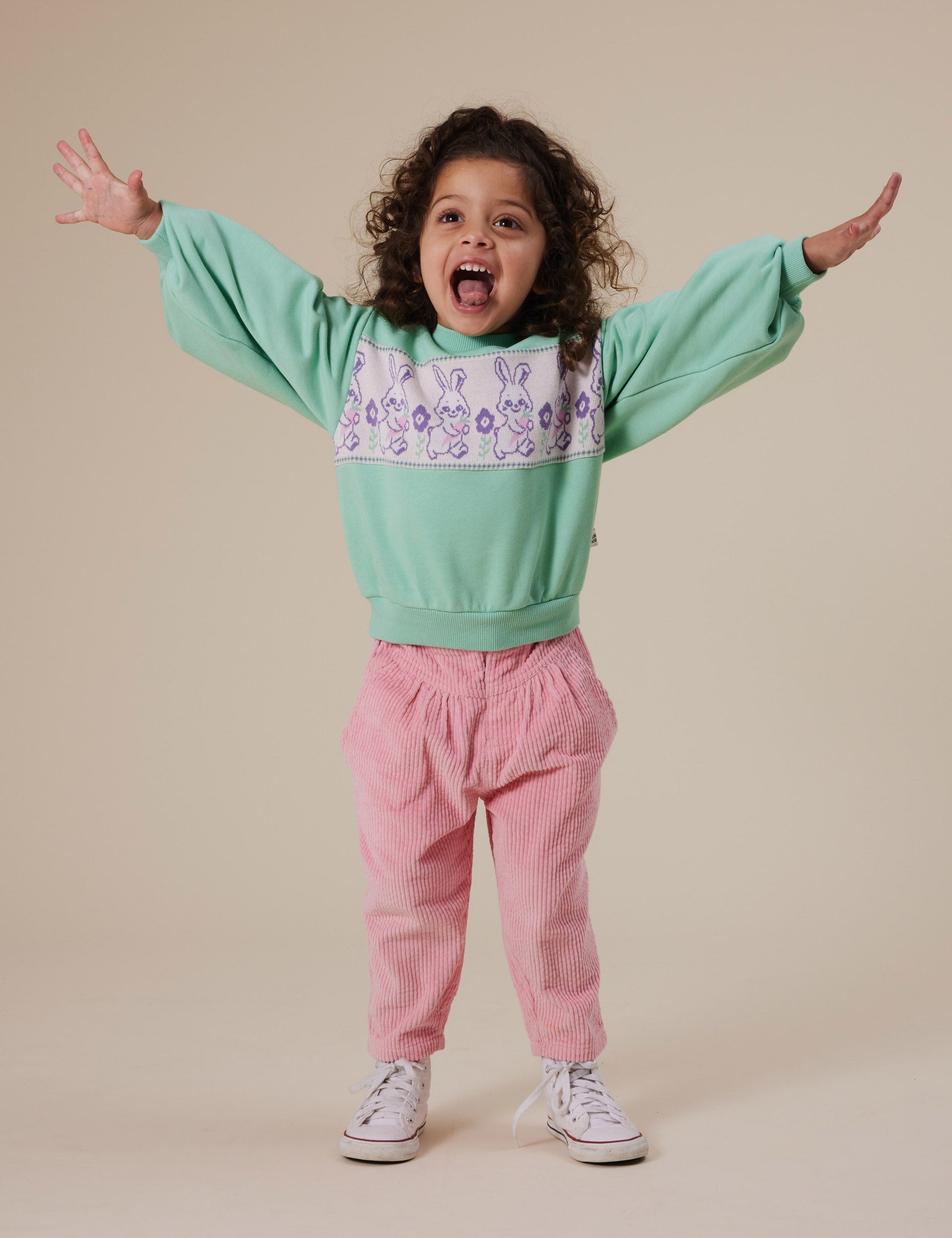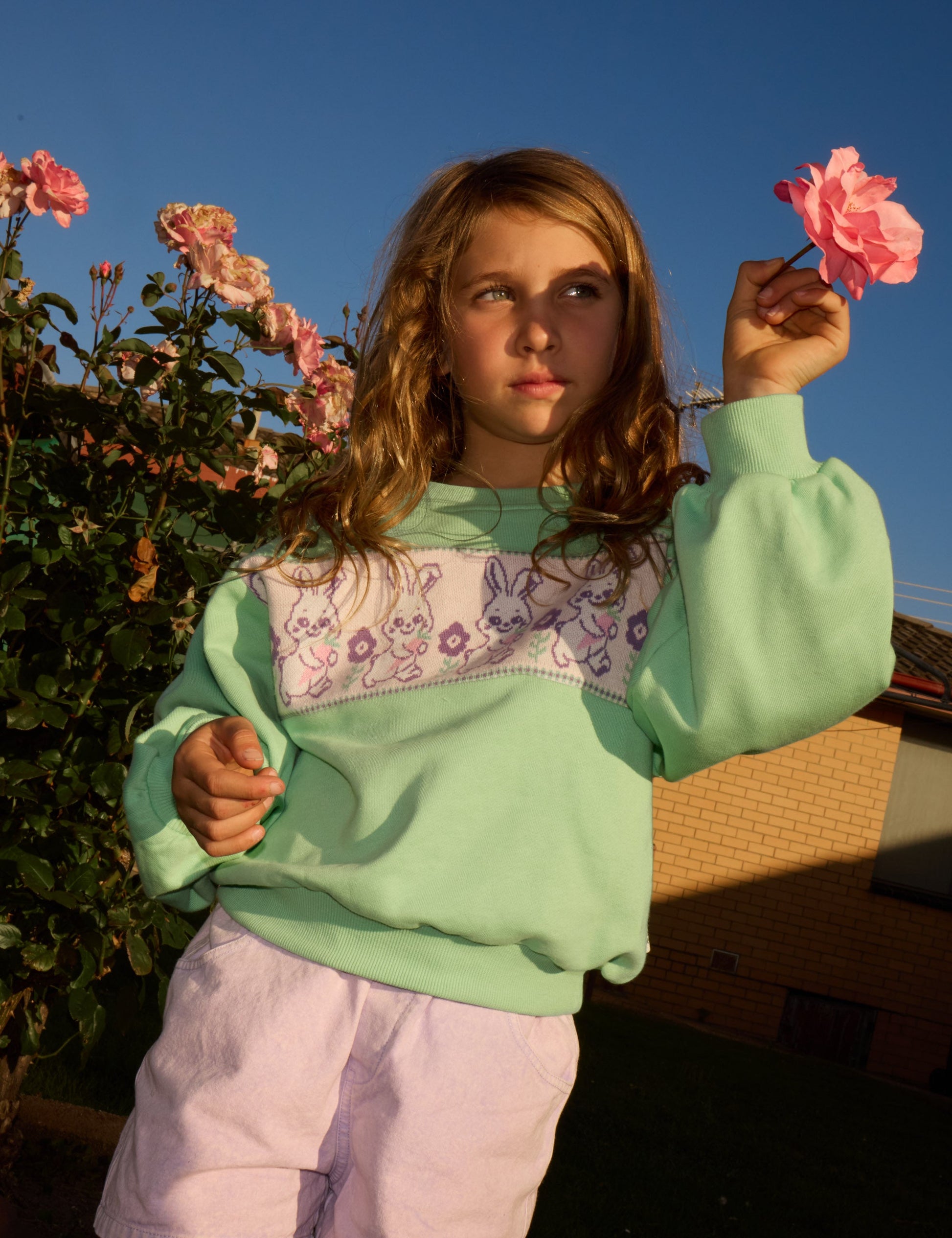 A cozy, mint-hued sweater with charming puff sleeves and an adorable panelled bunny pattern.