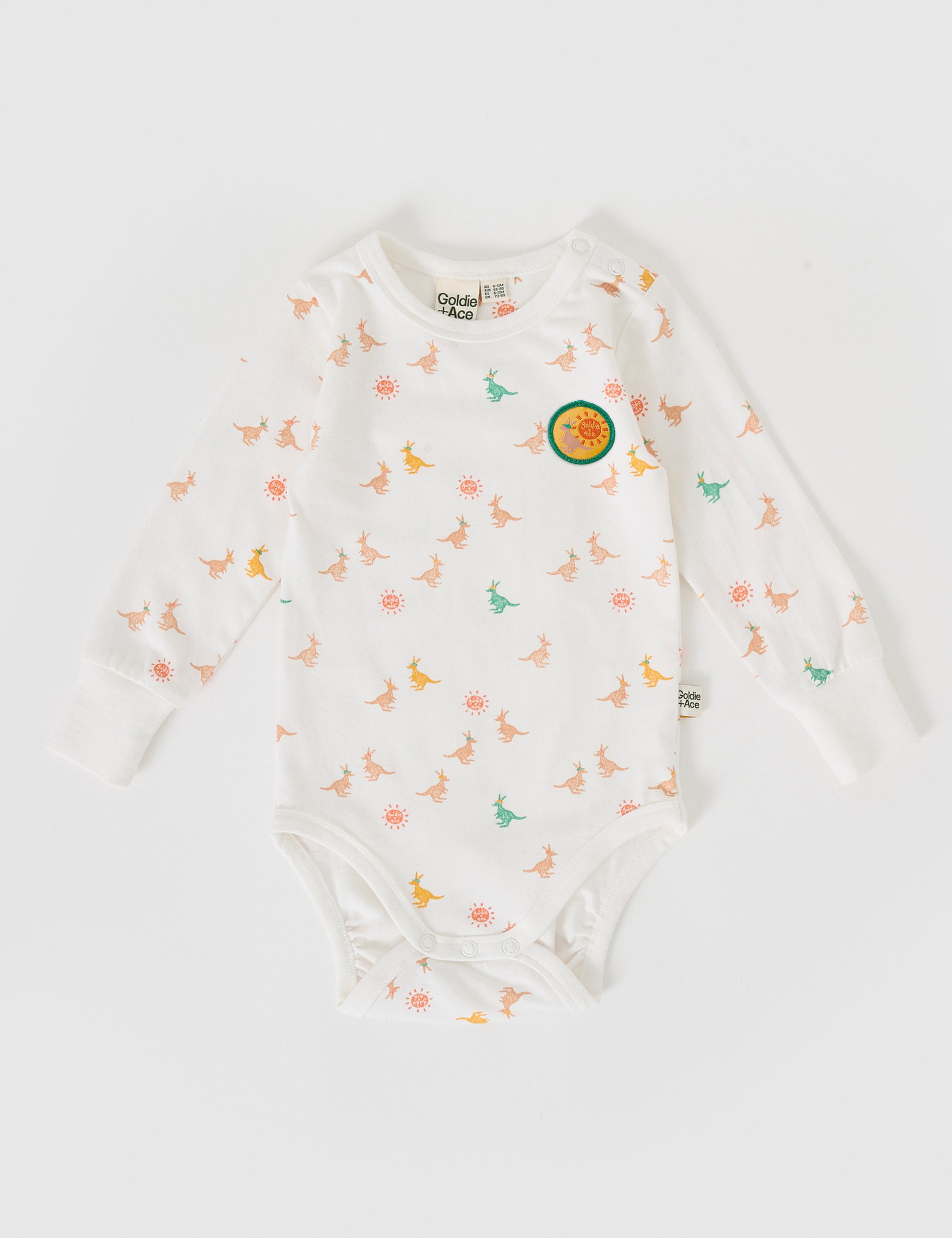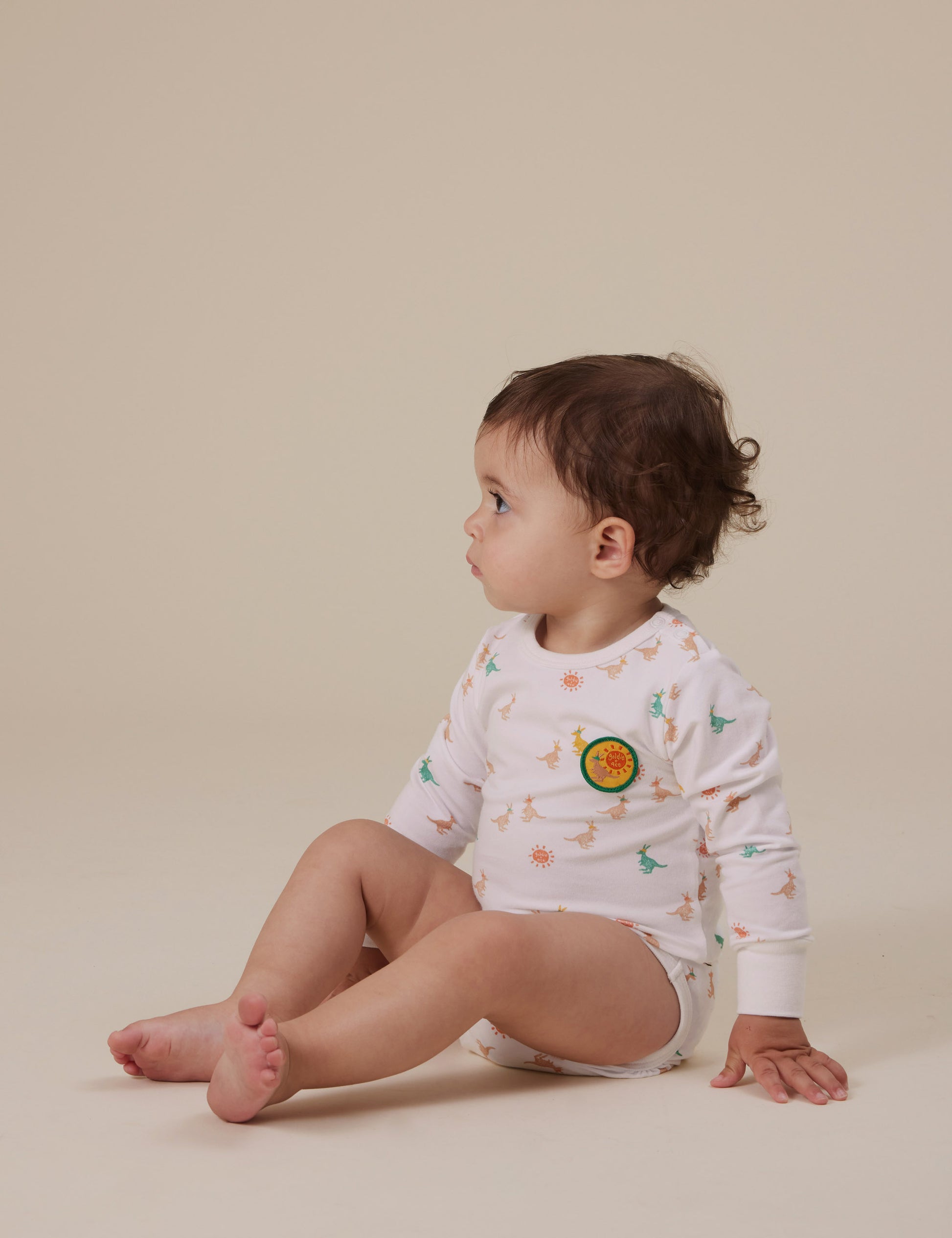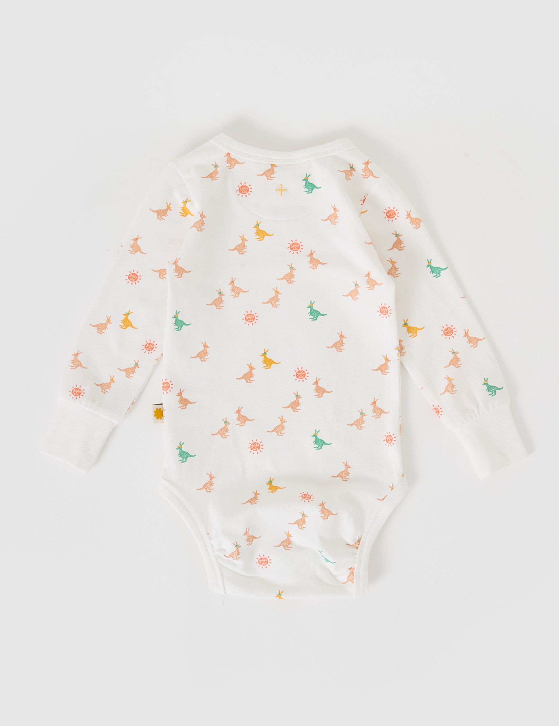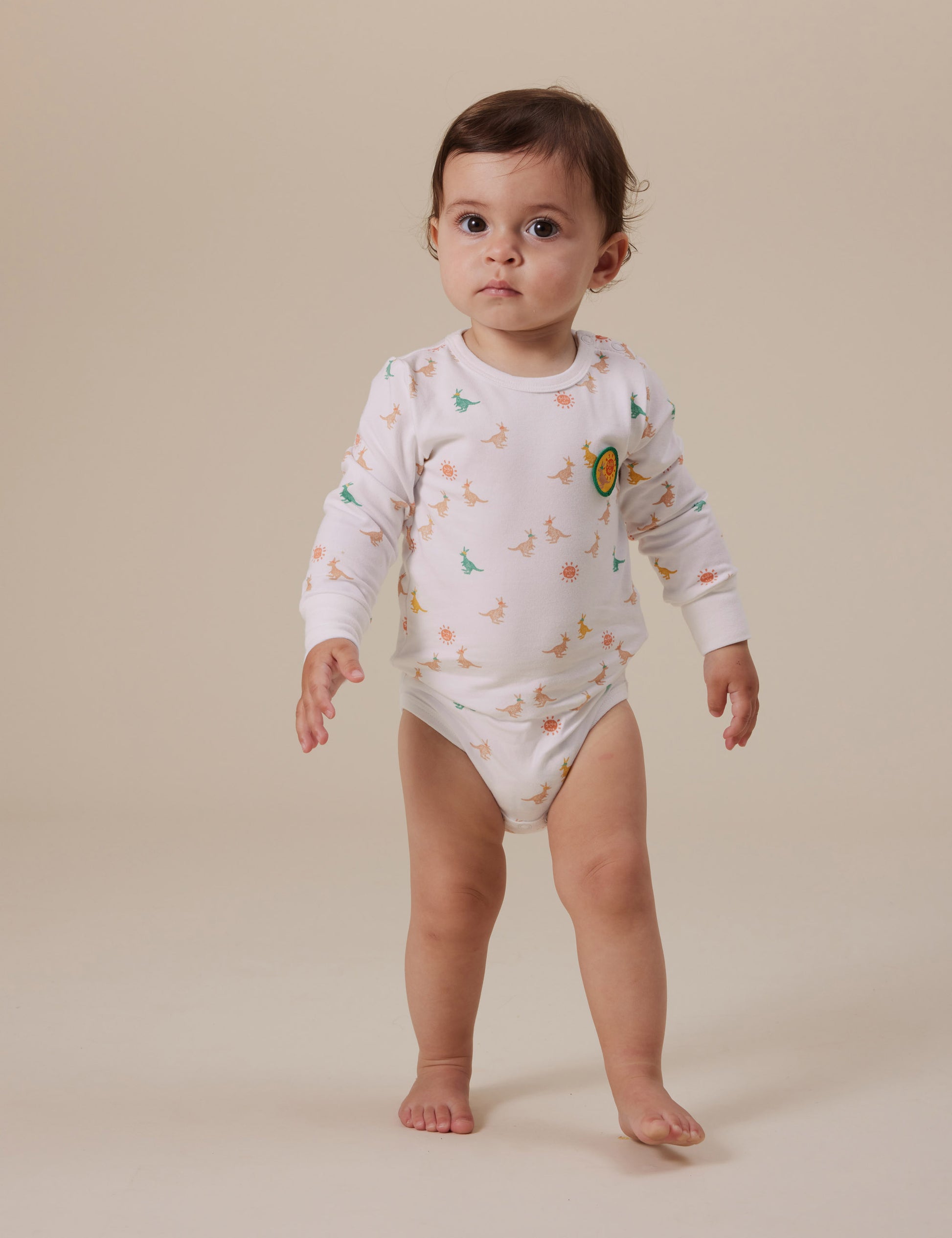 A cozy, soft cotton elastane bodysuit featuring charming Australiana animal prints.