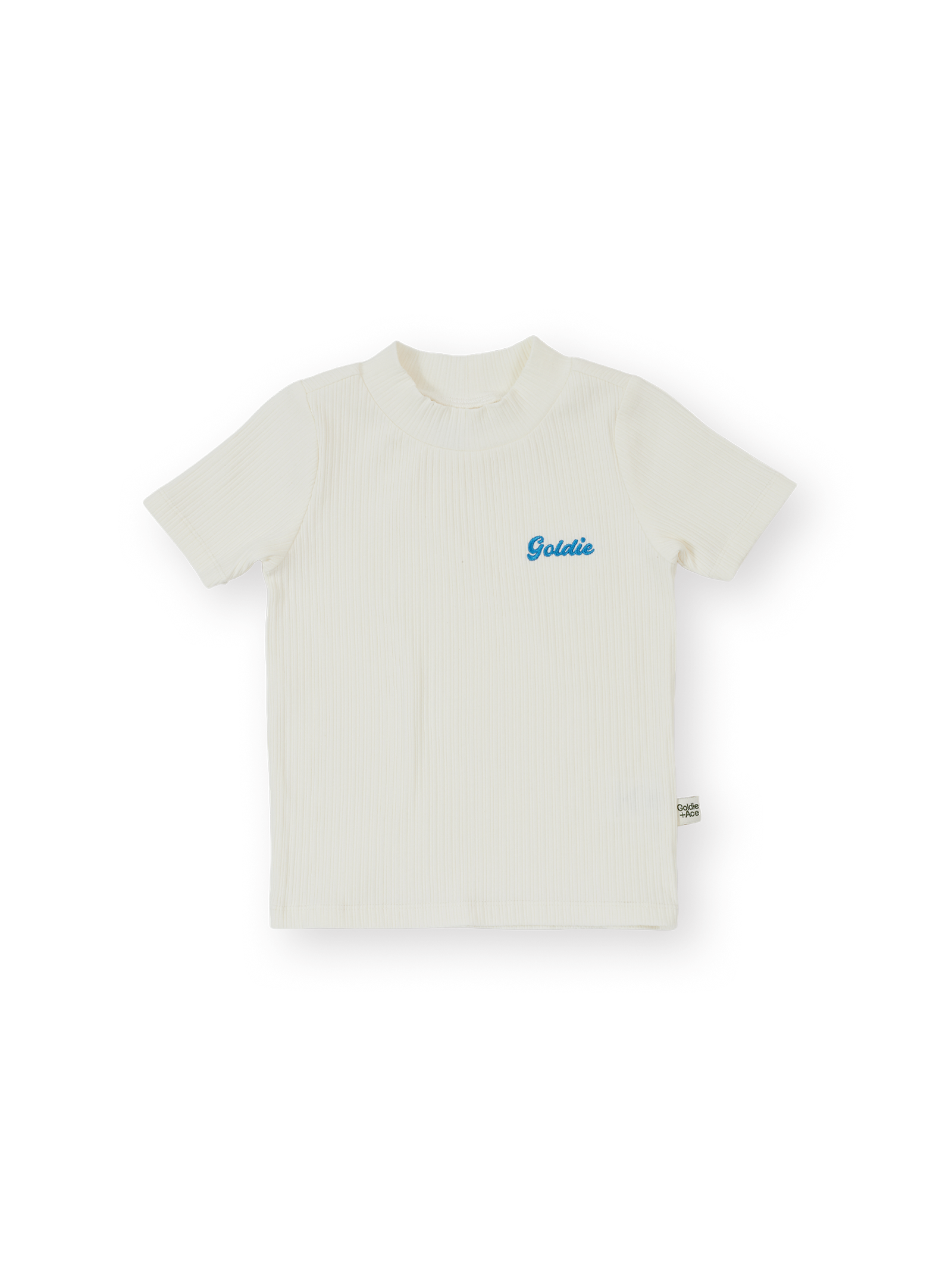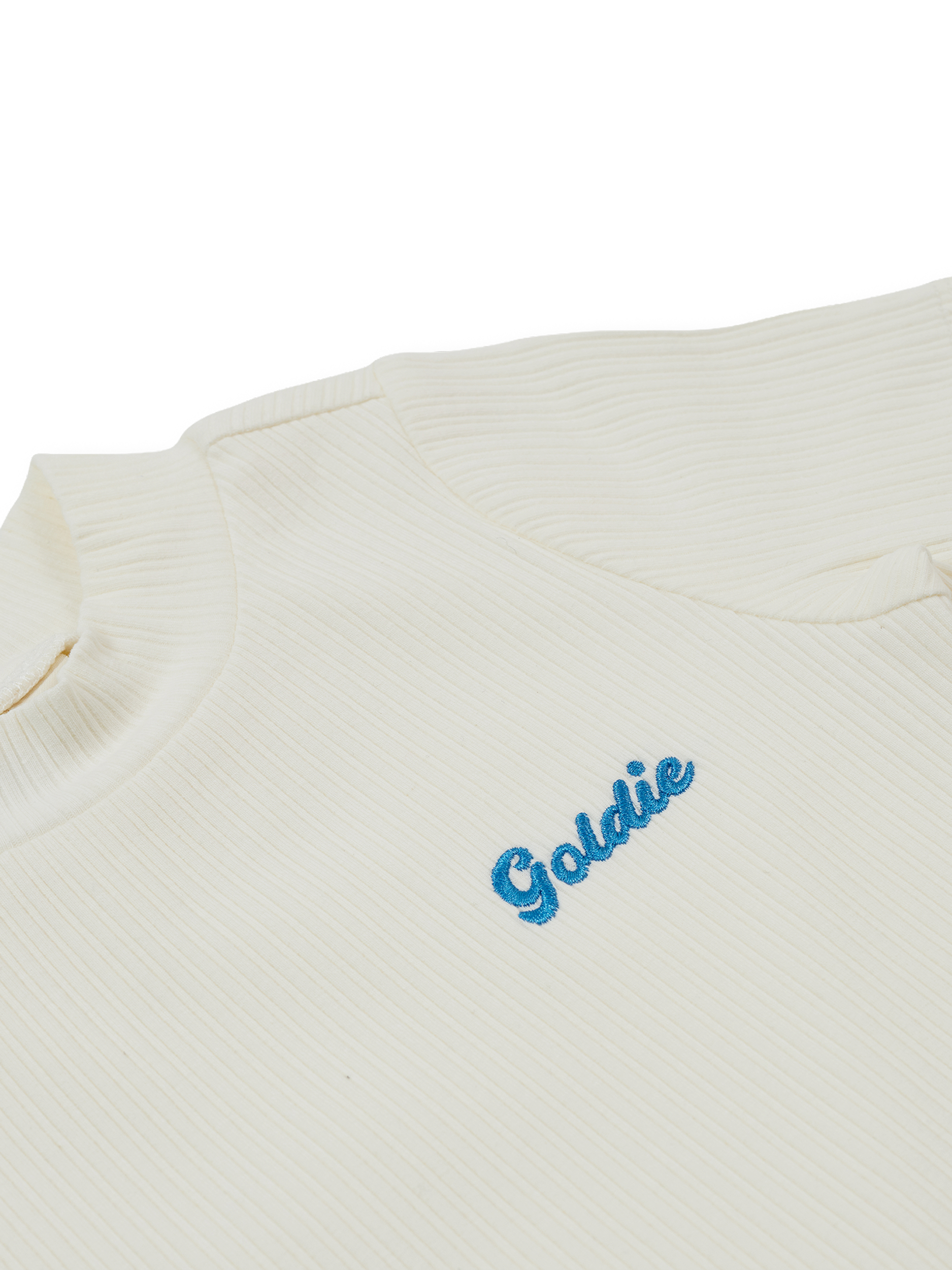 This soft white rib tee goes well with everything – skirts with frills, pinafores with pockets, knees with grazes... you name it. In a stretch-rib material for all-day comfort, our signature Goldie logo adds a vintage vibe too. This one? It’s a quiet achiever.