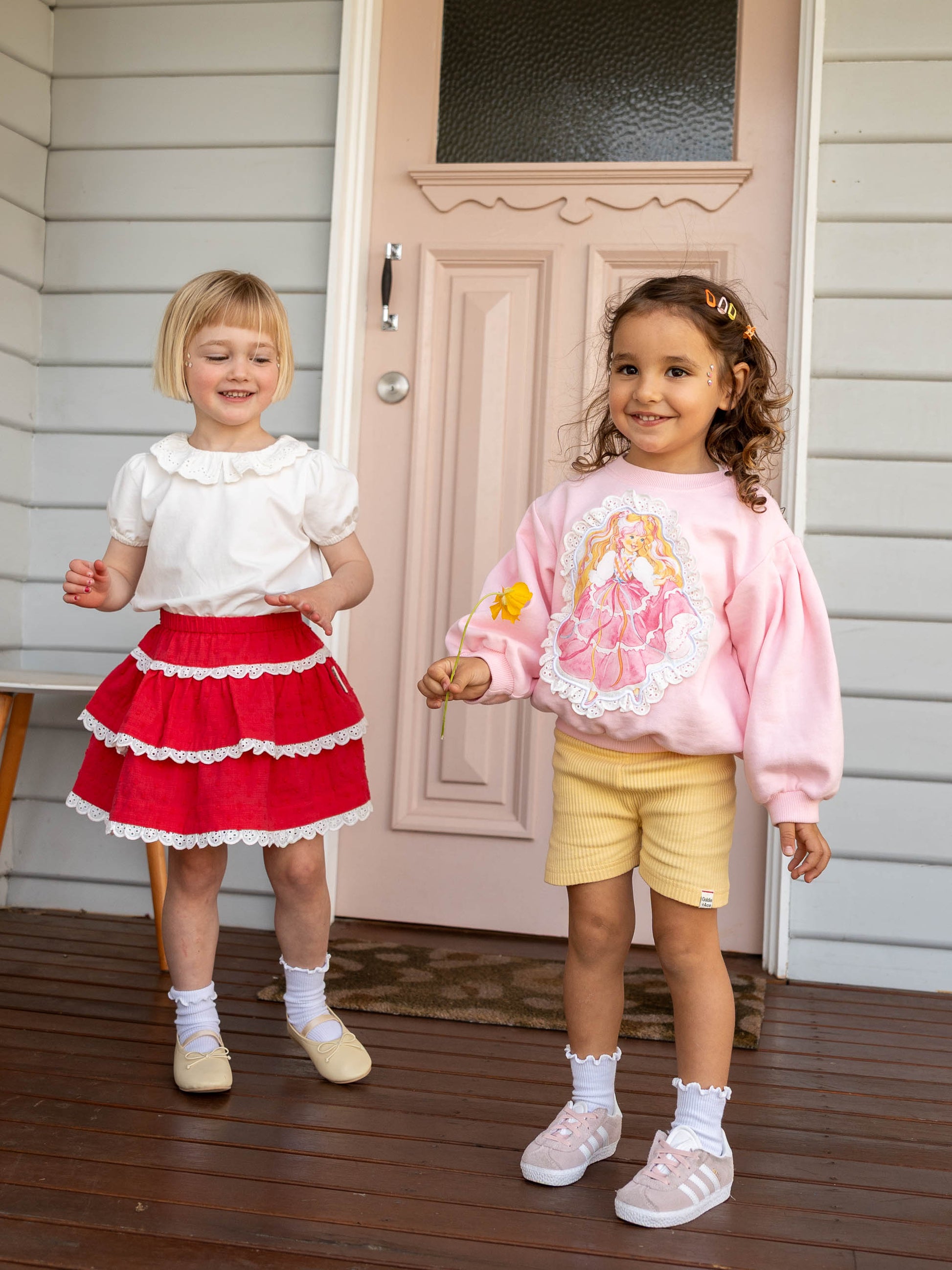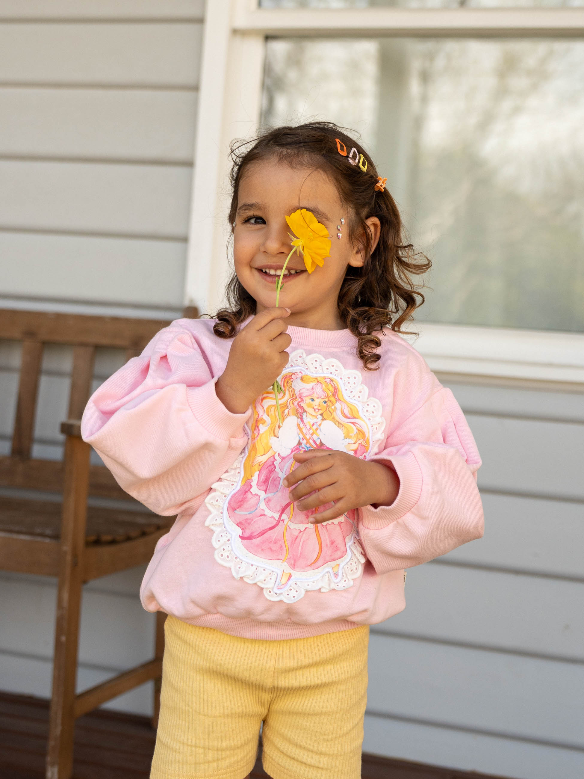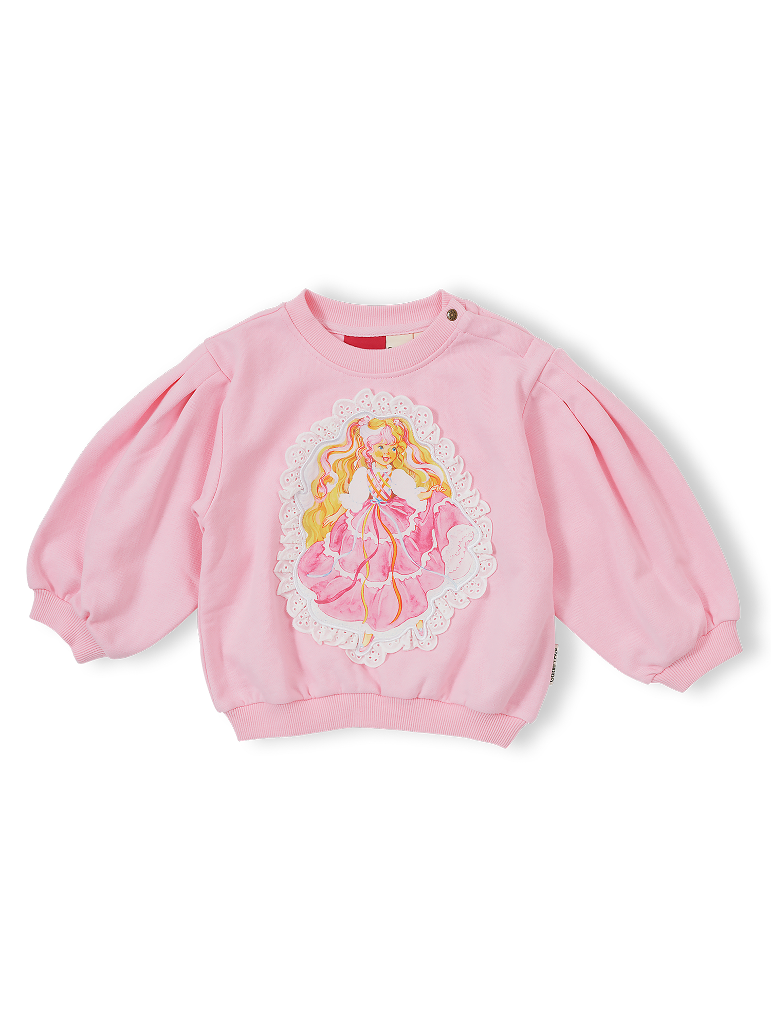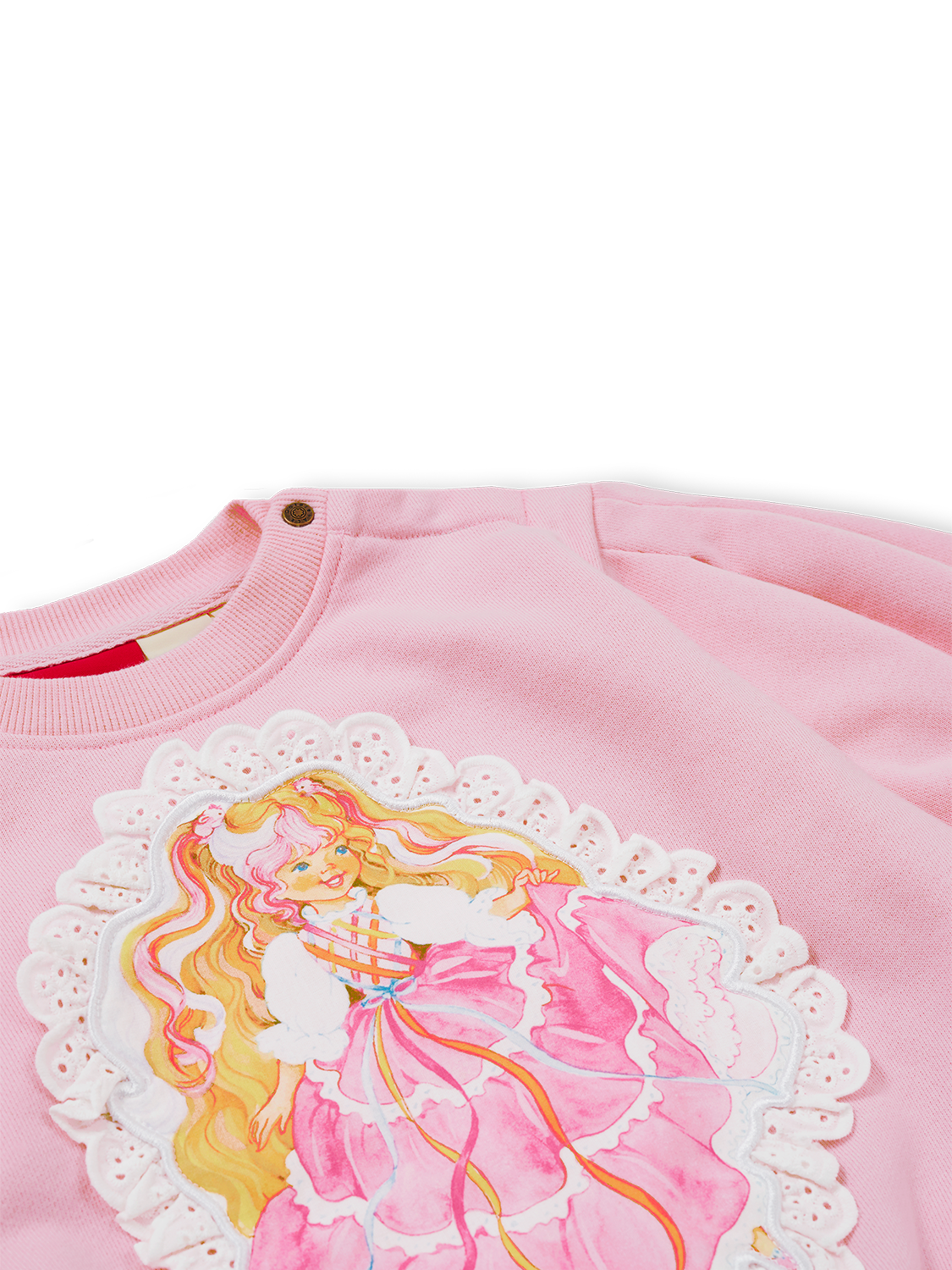 This soft cotton sweater features balloon sleeves with cuffs for a perfect oversized silhouette, and a perfect print of Lady Lovely Locks framed by delicate white broderie anglaise trim, blending the Lady Lovely Locks magic with just the right amount of kitsch.