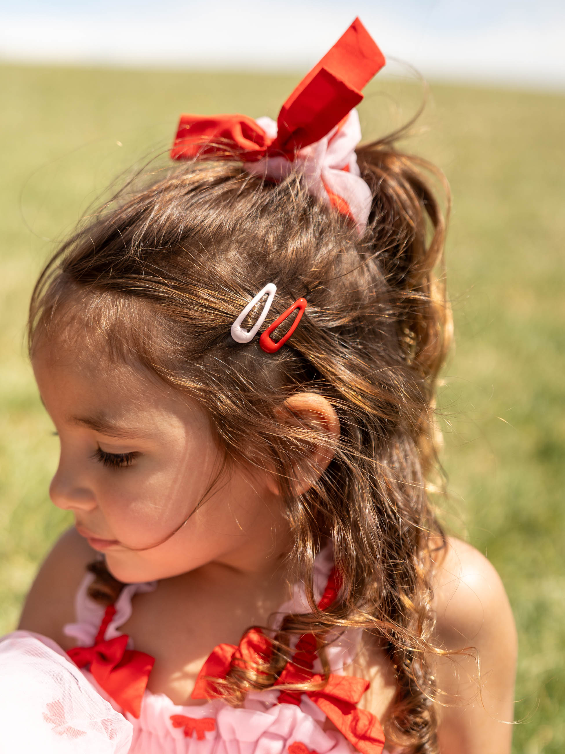 The ribbon-bow detail can be positioned above or below their ponytail – the perfect cherry-red on top of their sweet summer outfit!