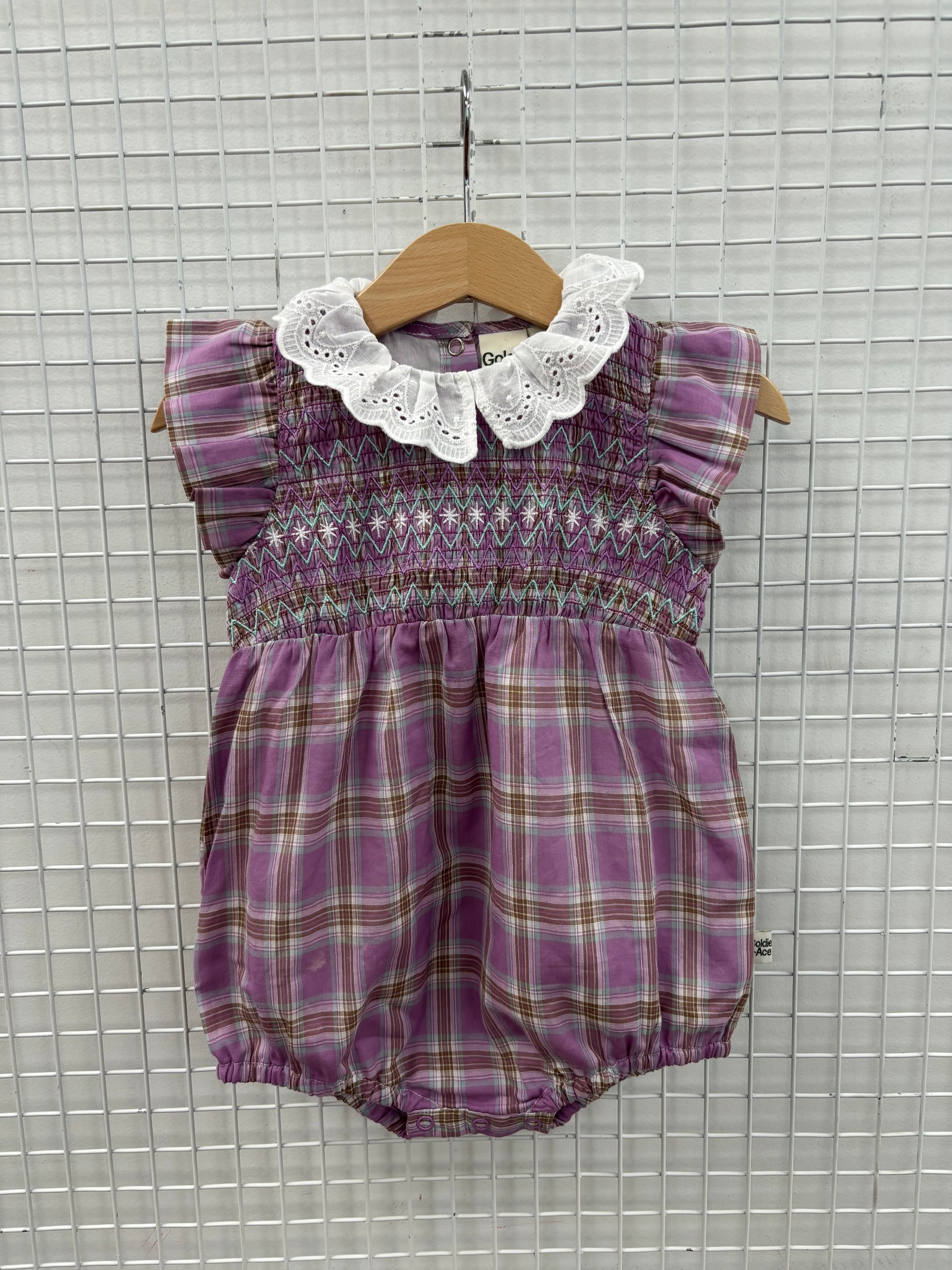LANI SMOCKED ROMPER MAUVE CHECK - 6-12M (WHITE MARK ON FRONT)