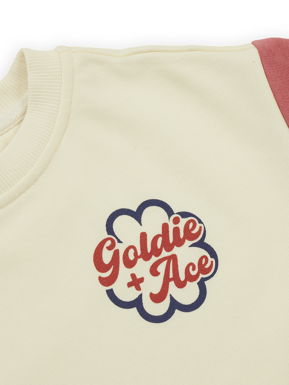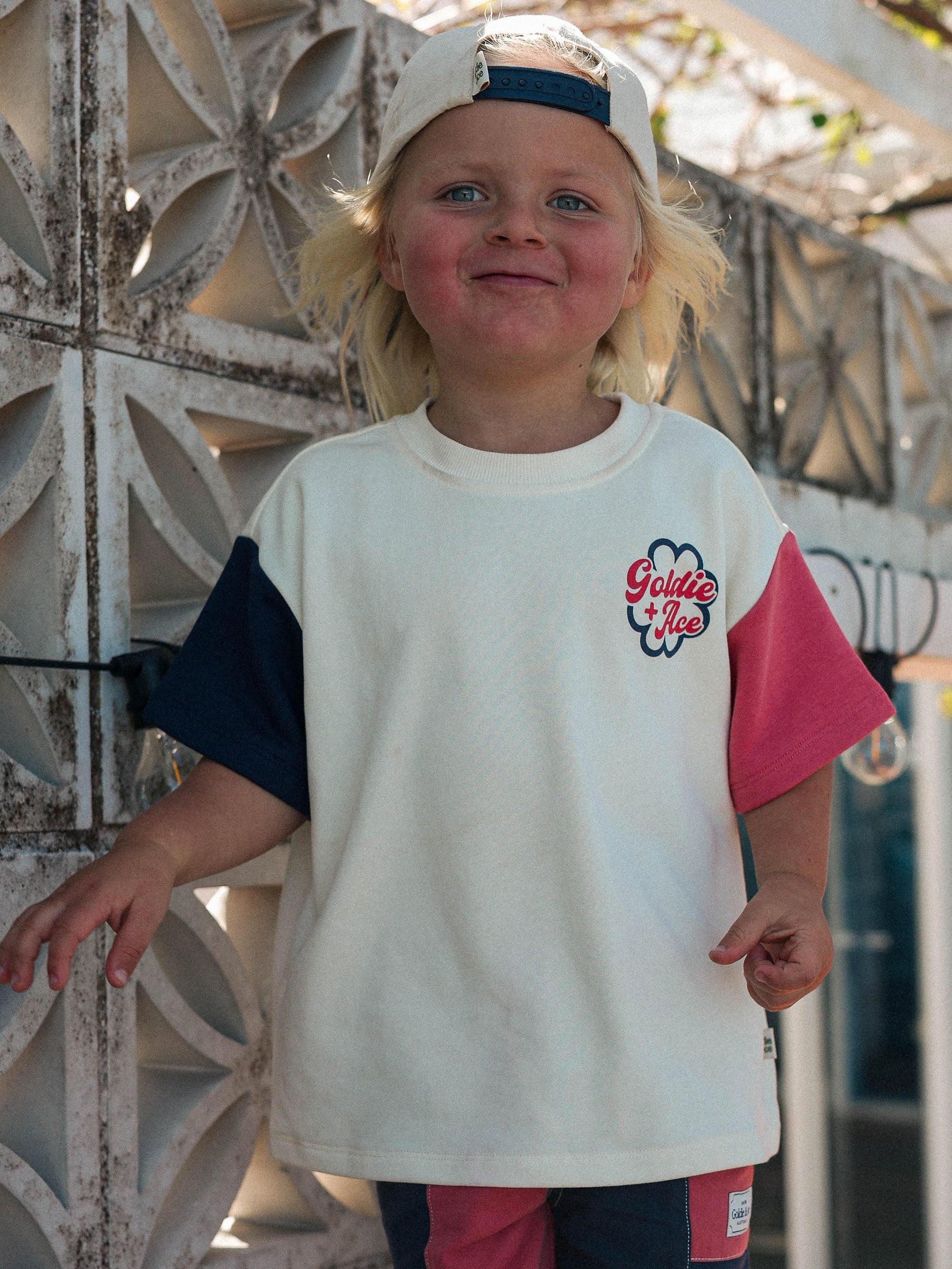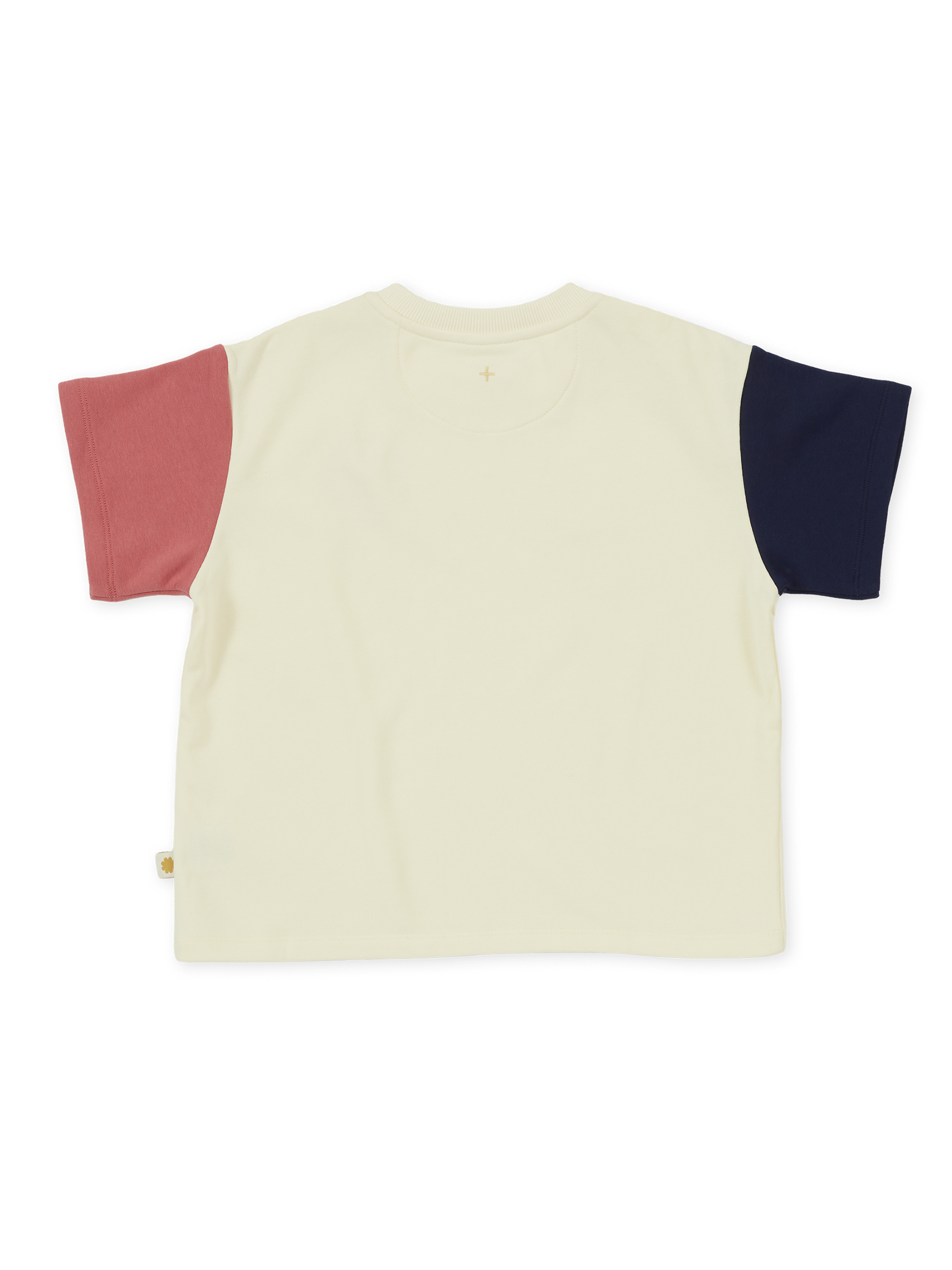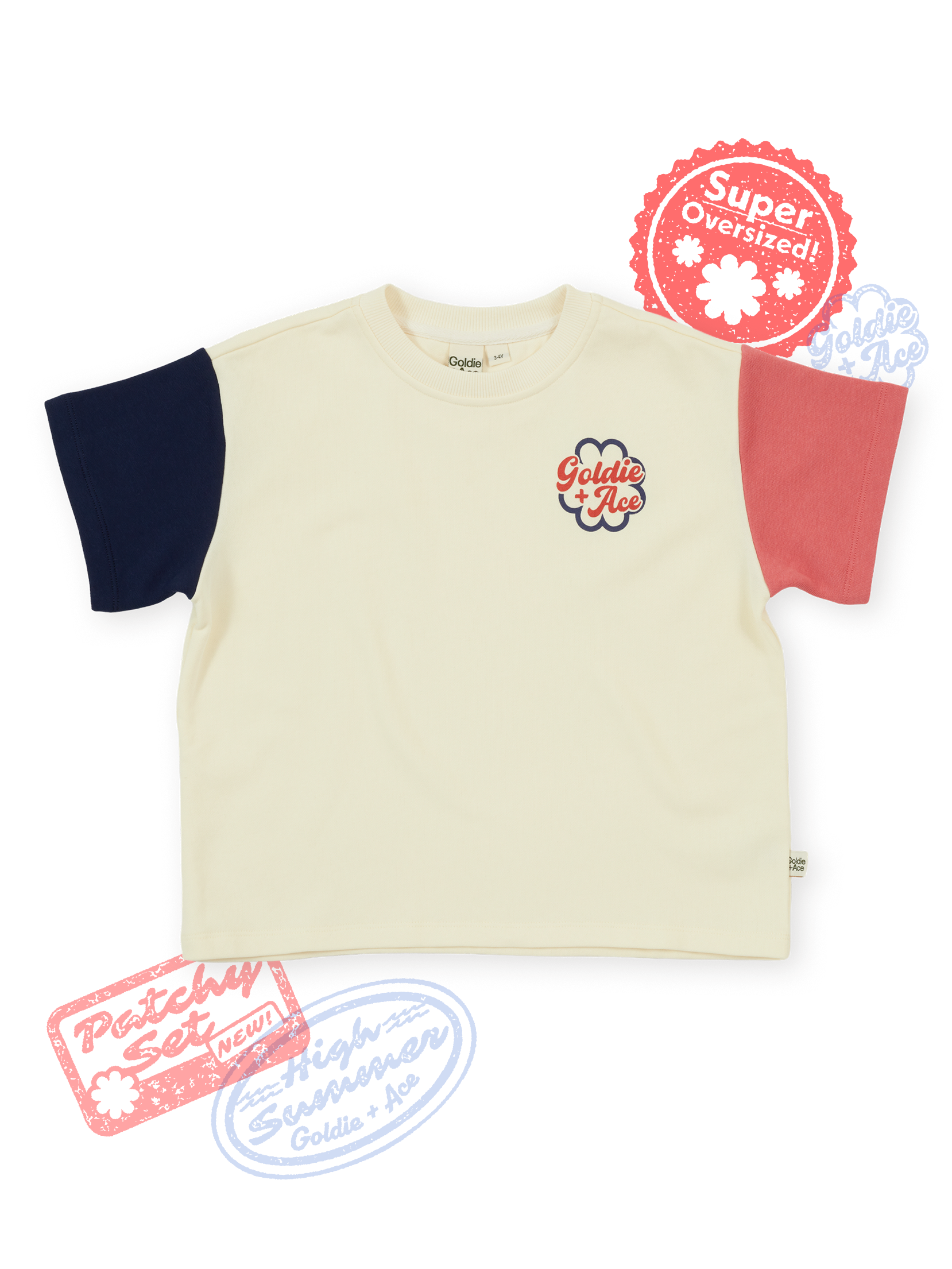 Creamy comfort with colourblocked sleeves - oversized just enough to look cool, move freely, and survive snack attacks.