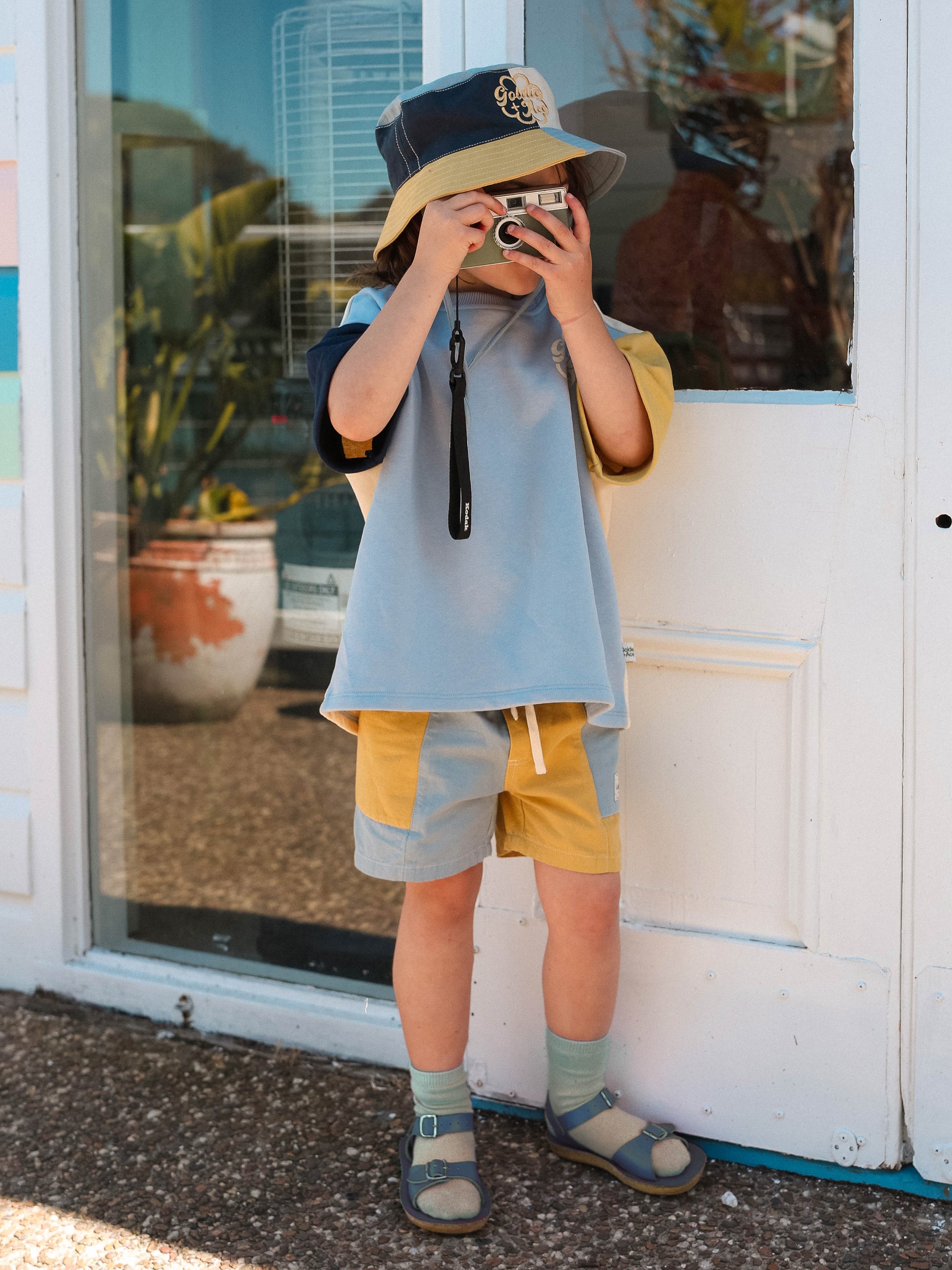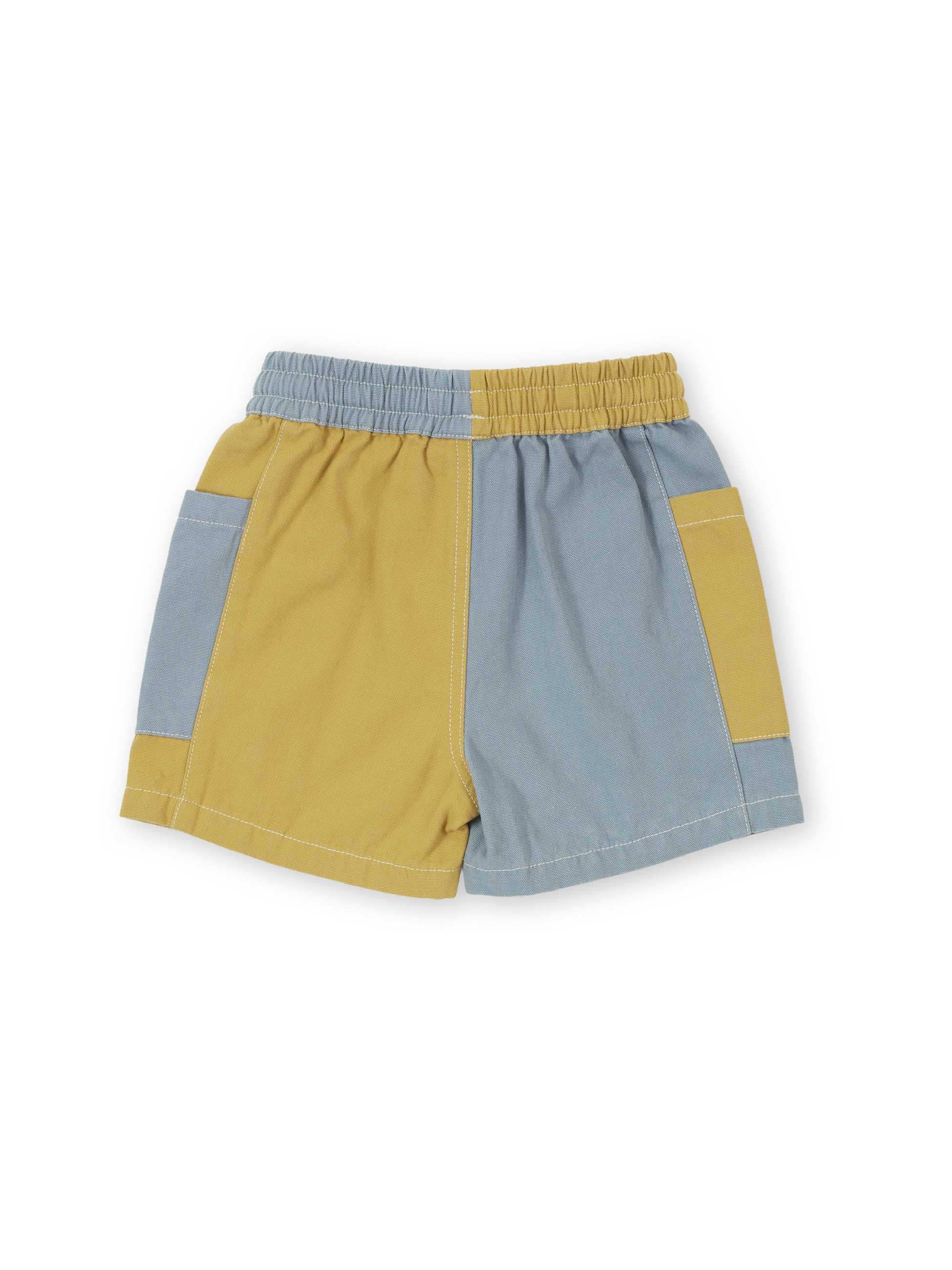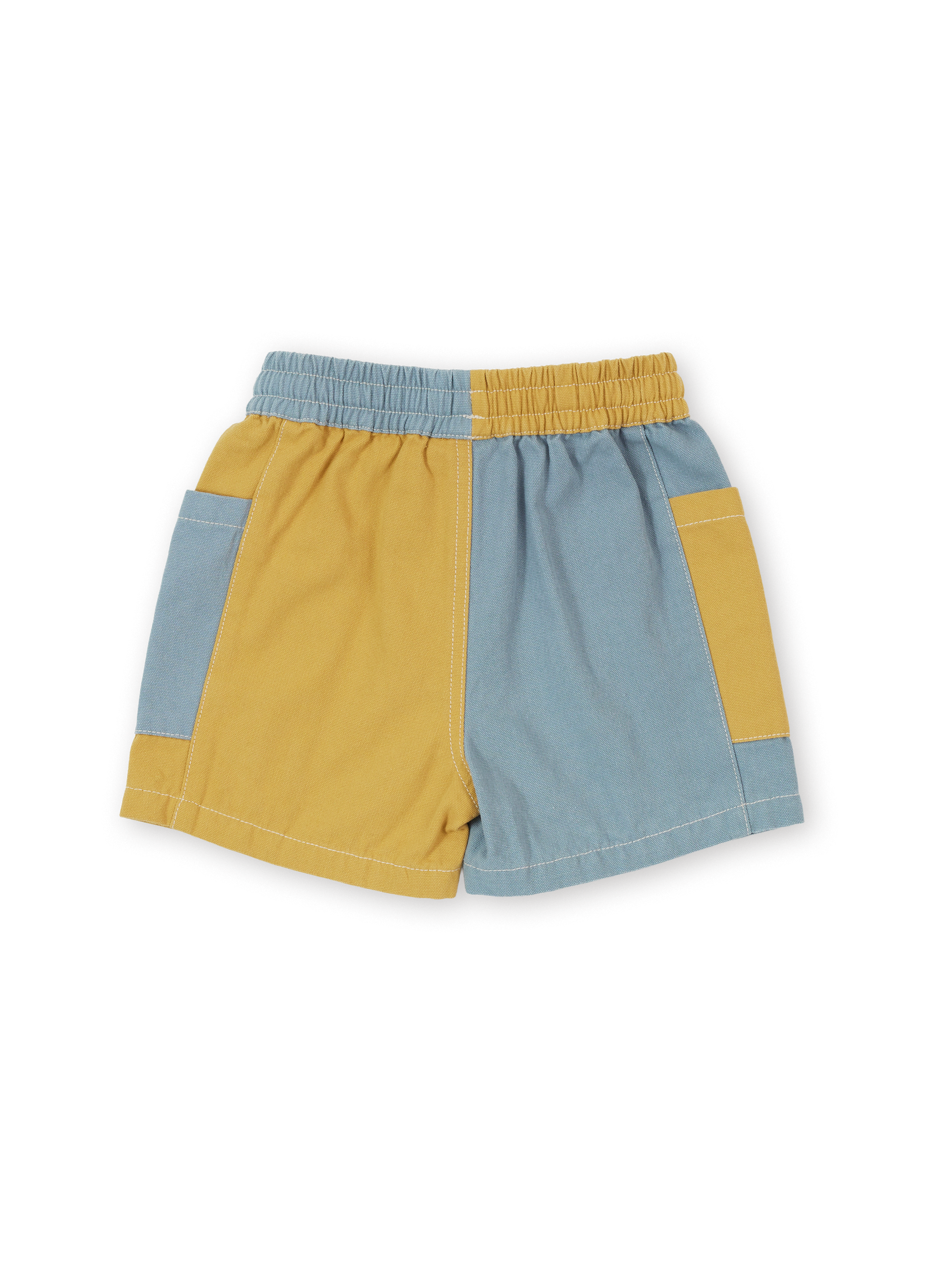 Sky blue meets mustard in these colourblocked shorts with big pockets. Lightweight, soft, and ready for your kid to conquer the backyard (or the living room) without fuss.