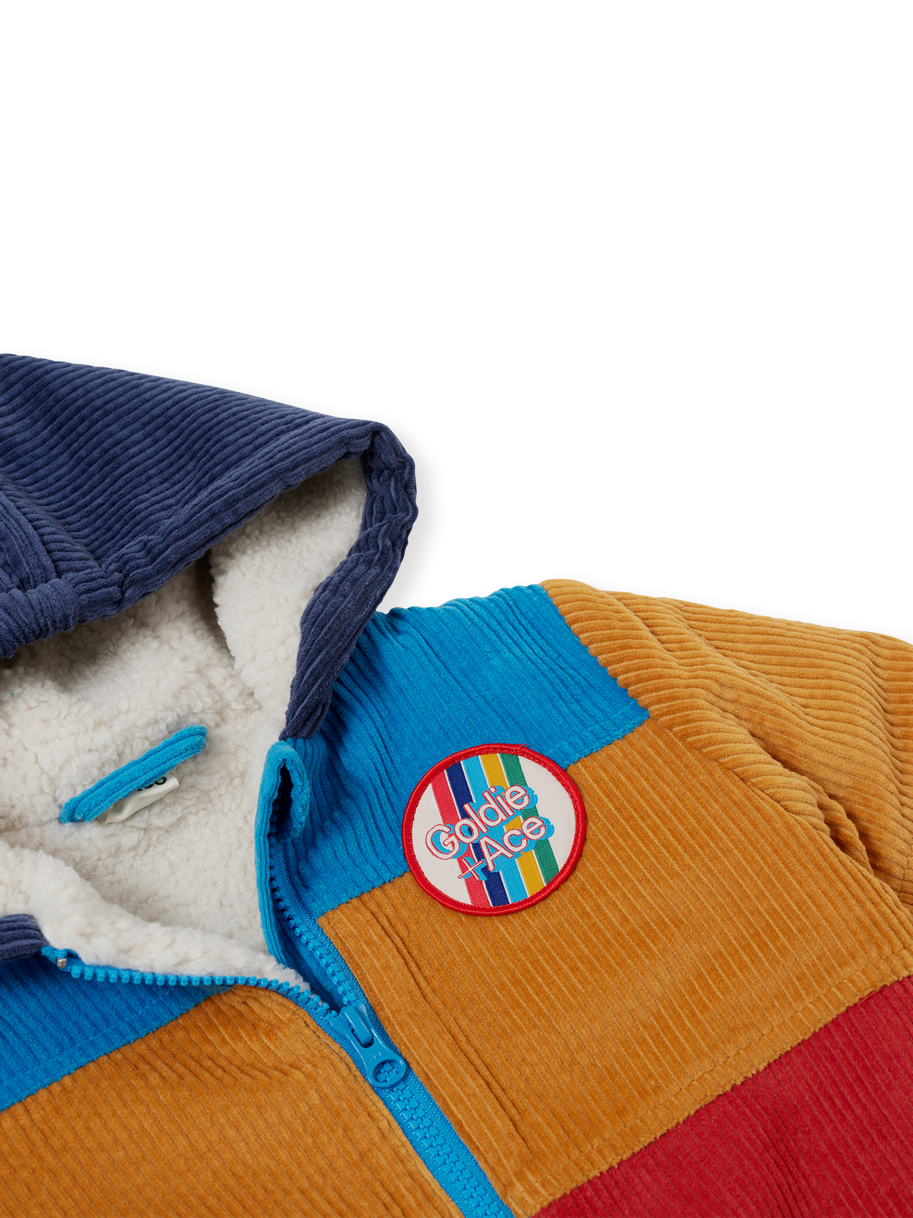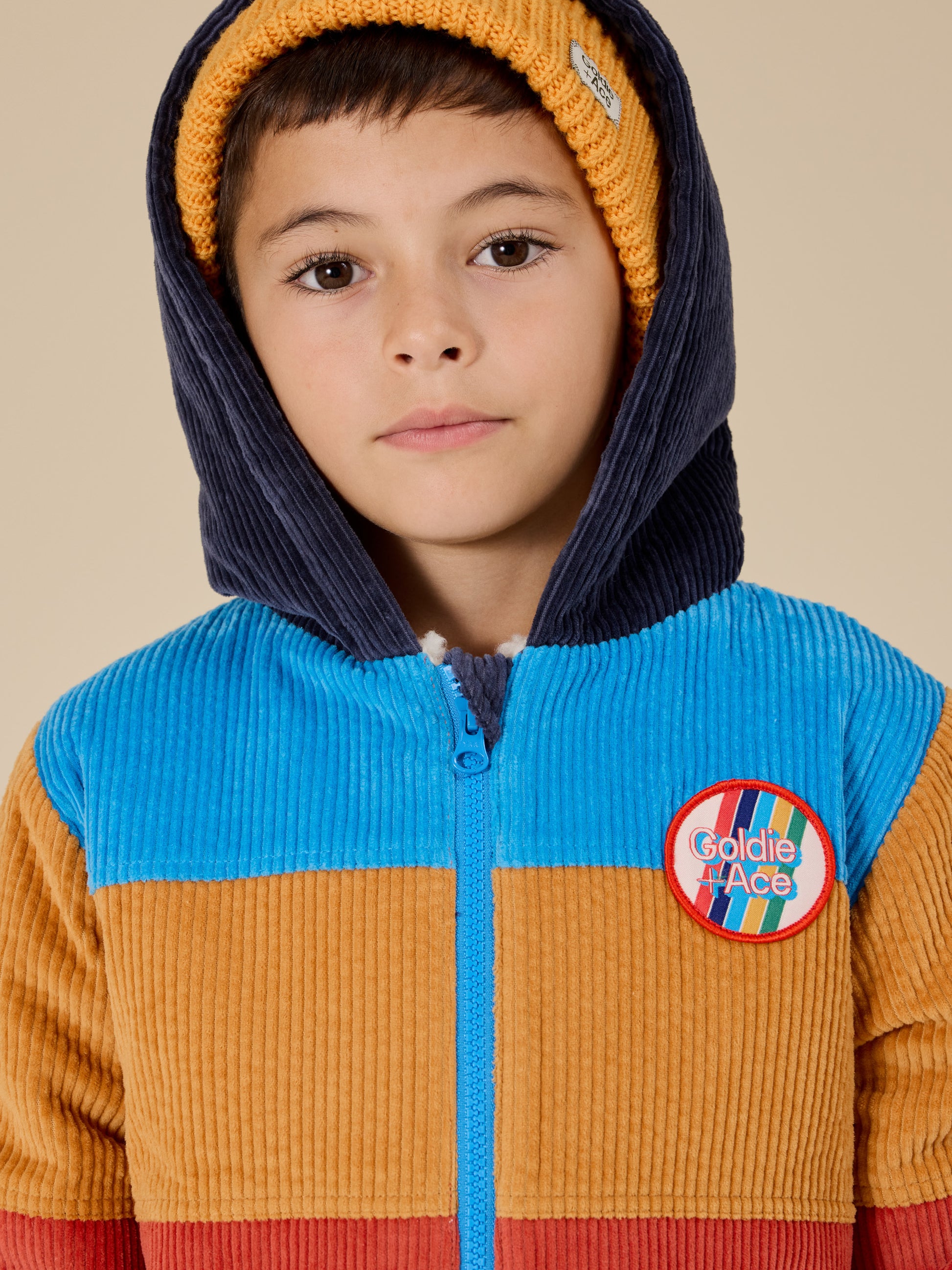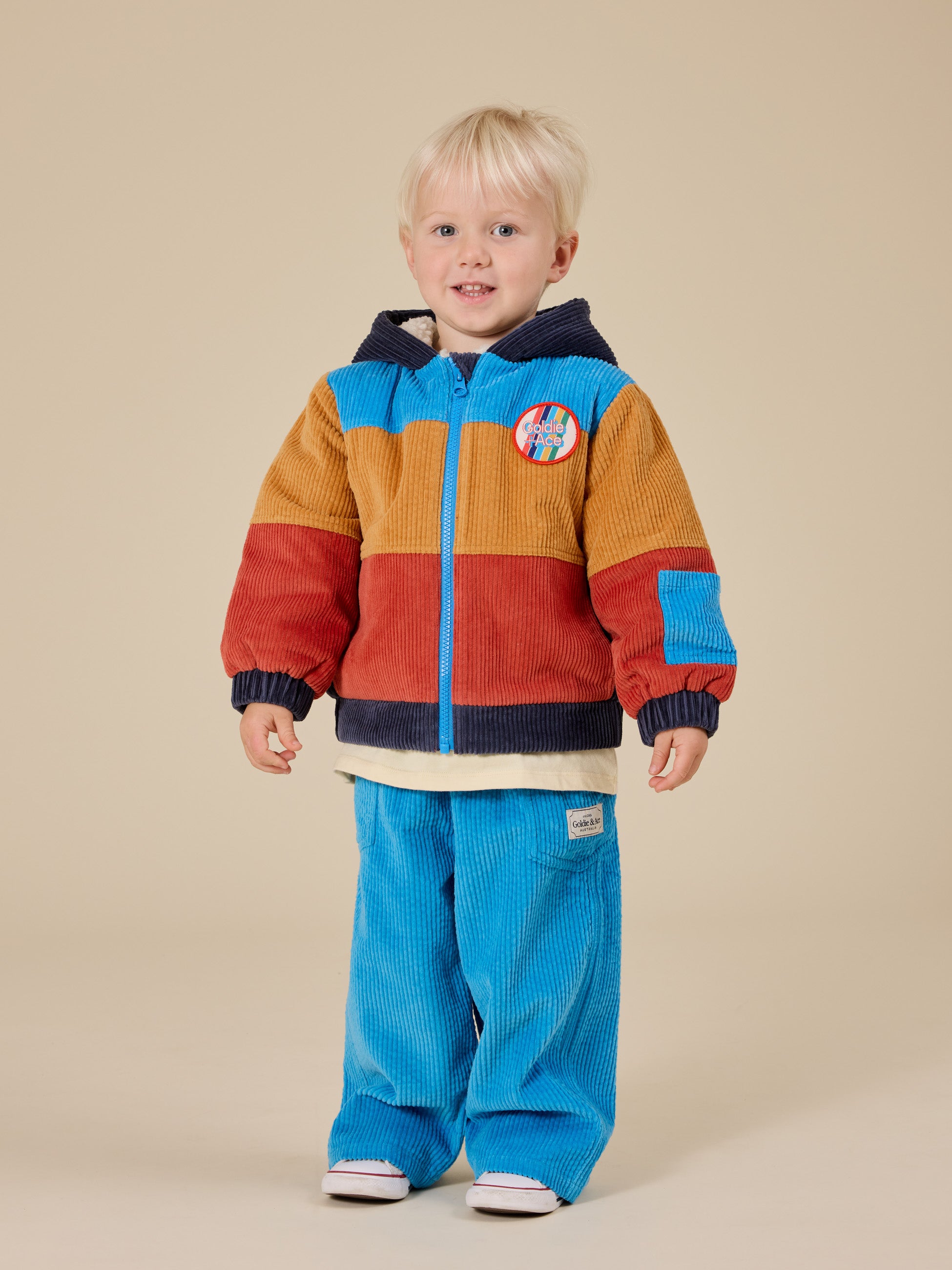A corduroy jacket that means business - bold panels, a snug hood, and a front zip to dodge the morning meltdown. Sherpa lining to keep them super cozy,. Sleeve pocket included, because every kid needs a secret stash spot.