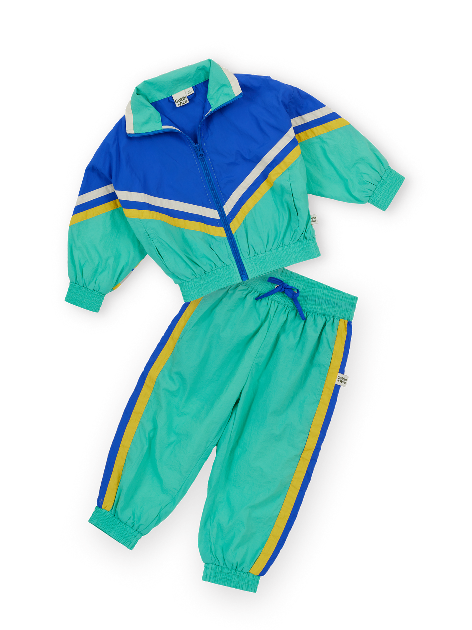 Full 90s energy. Swishy blue-and-green spray jacket with matching lightweight sporty pants—made for zooming down imaginary ski slopes and maximum throwback flair. Warning: may cause dramatic slow-motion running.