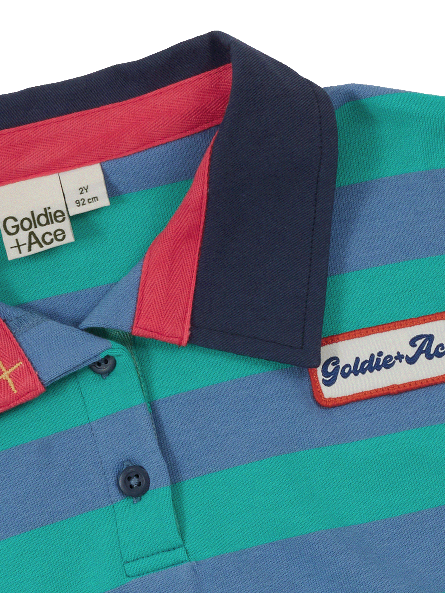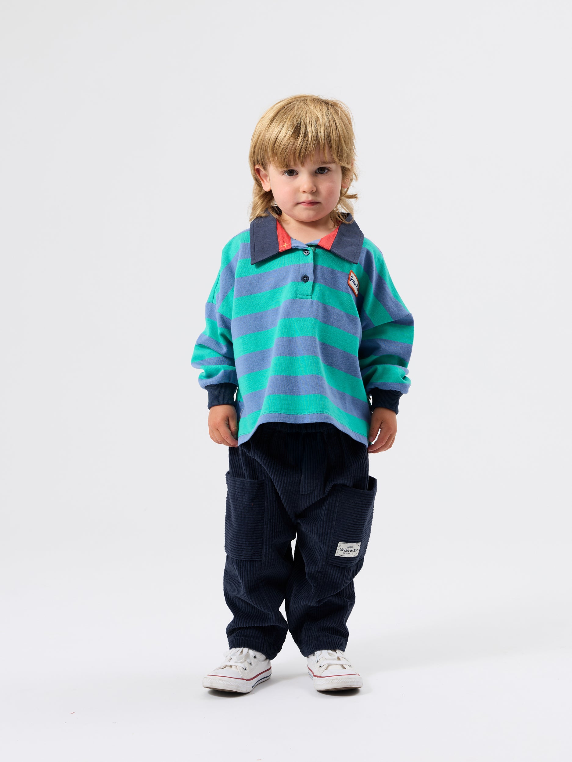 An ultra cool, boxy rugby-style top in soft blue terry cotton, with a classic woven collar and vintage Goldie + Ace badge. The relaxed fit makes it ready to throw on and keep up with every playground mission.