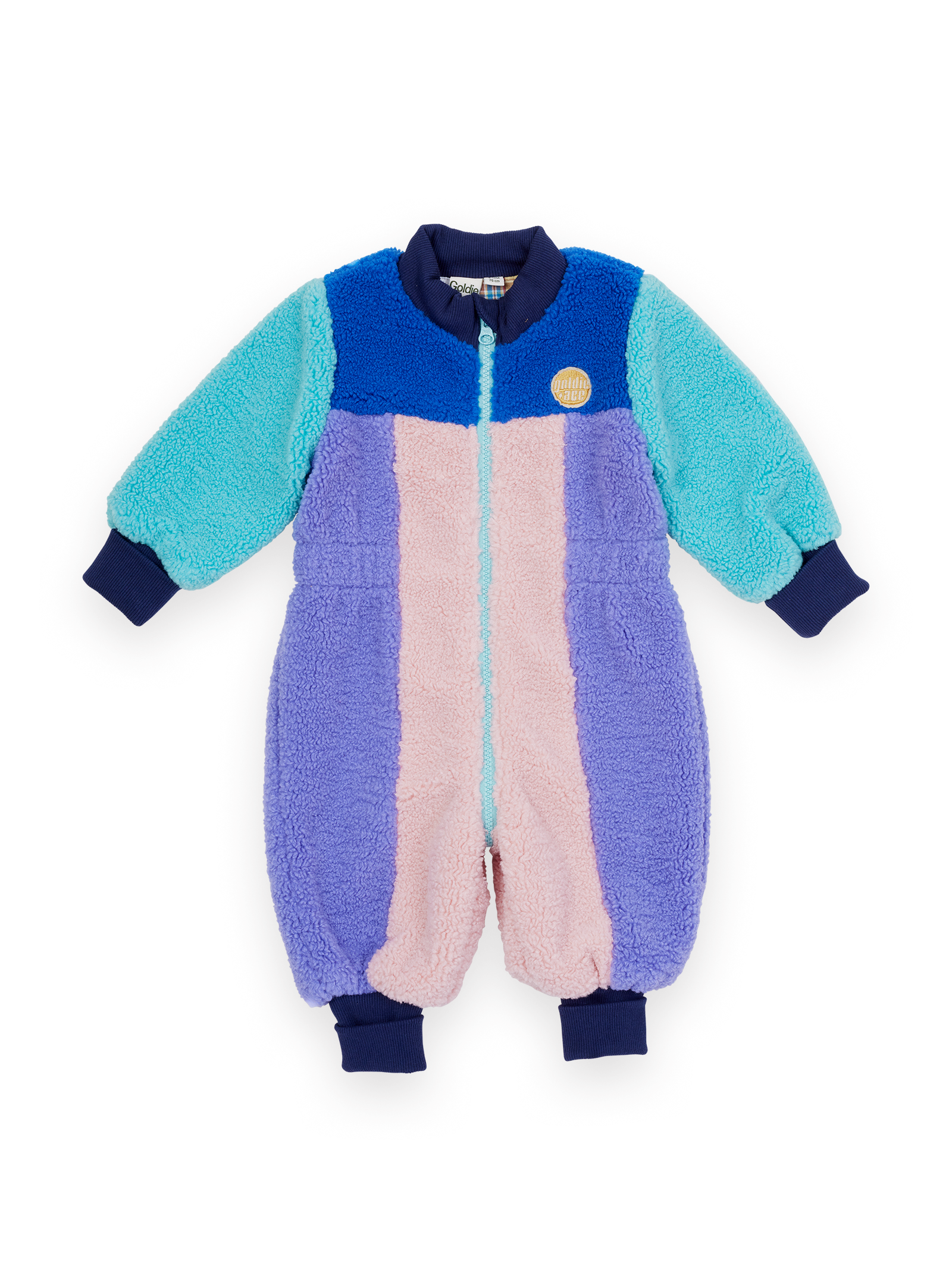 A multi-coloured sherpa suit in snug faux shearling, with a zip front and inner leg snaps for easy changes. Fluffy, retro, and serving serious ski-lodge vibes – like a tiny walking cuddle on a snow day.