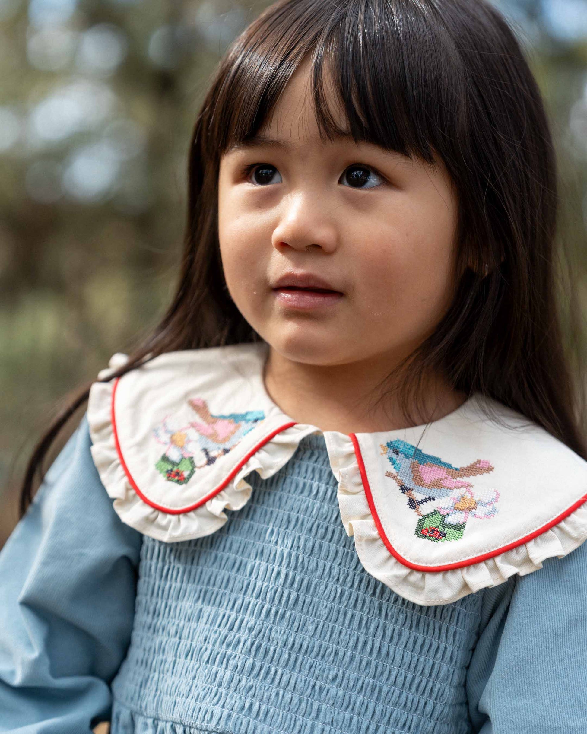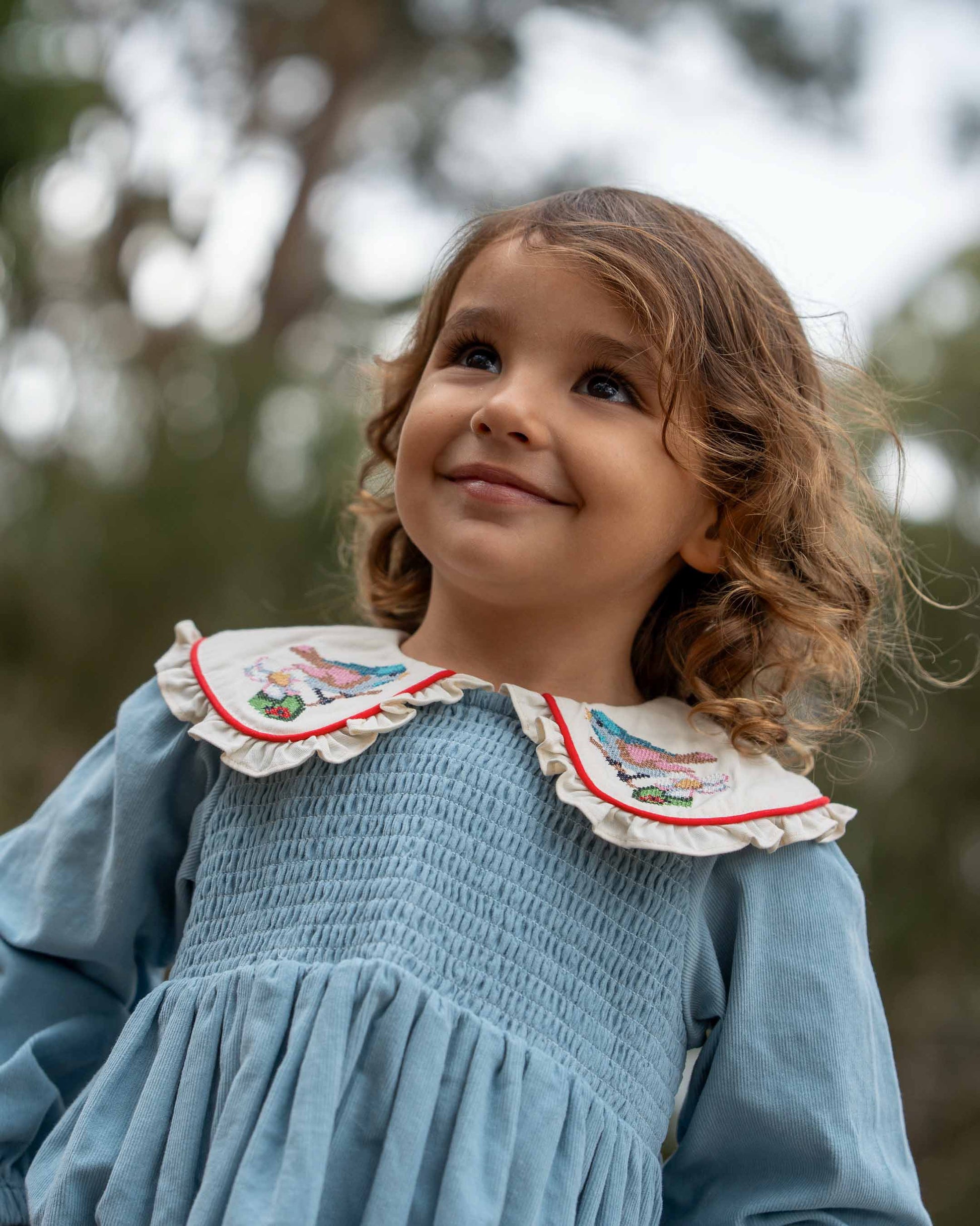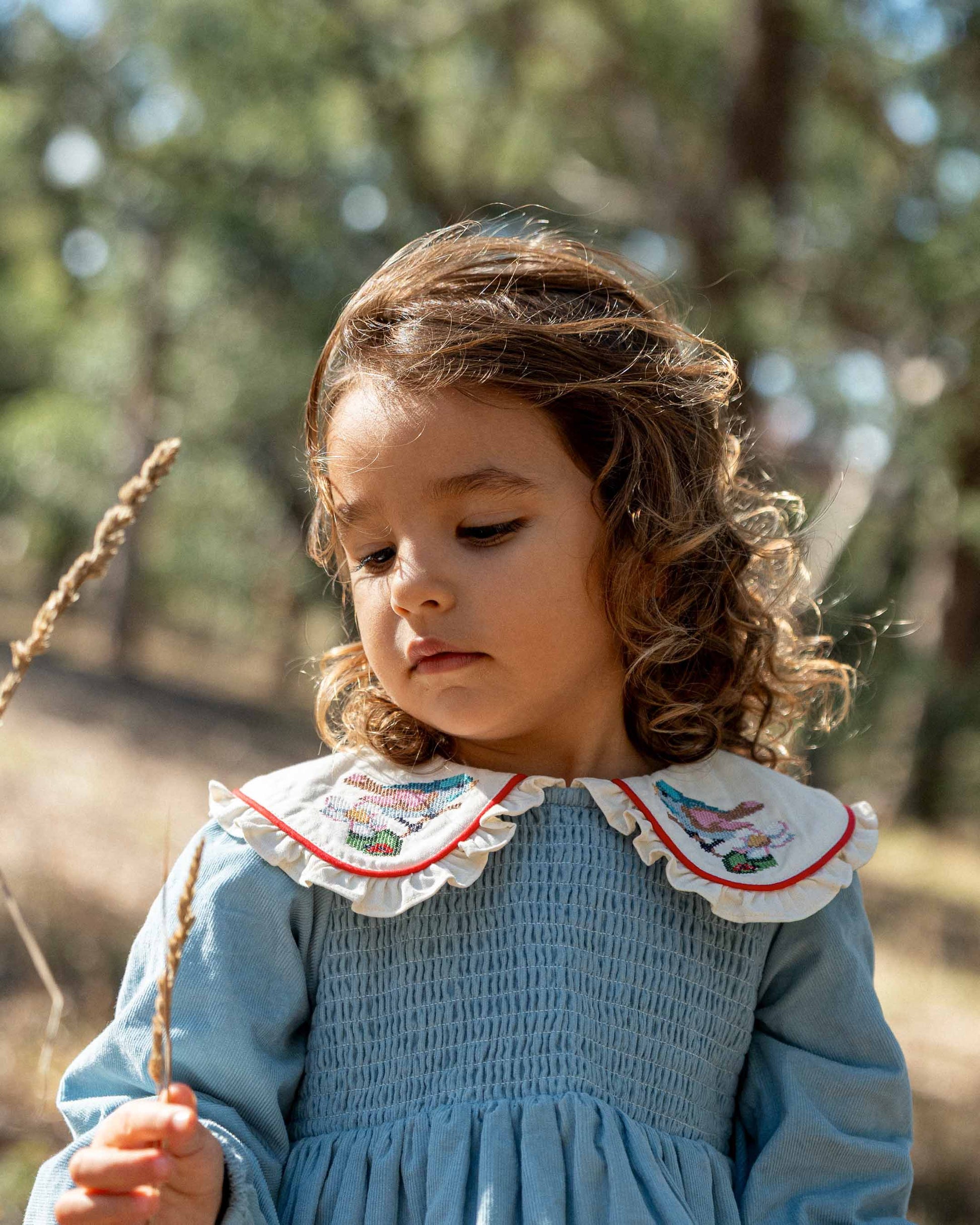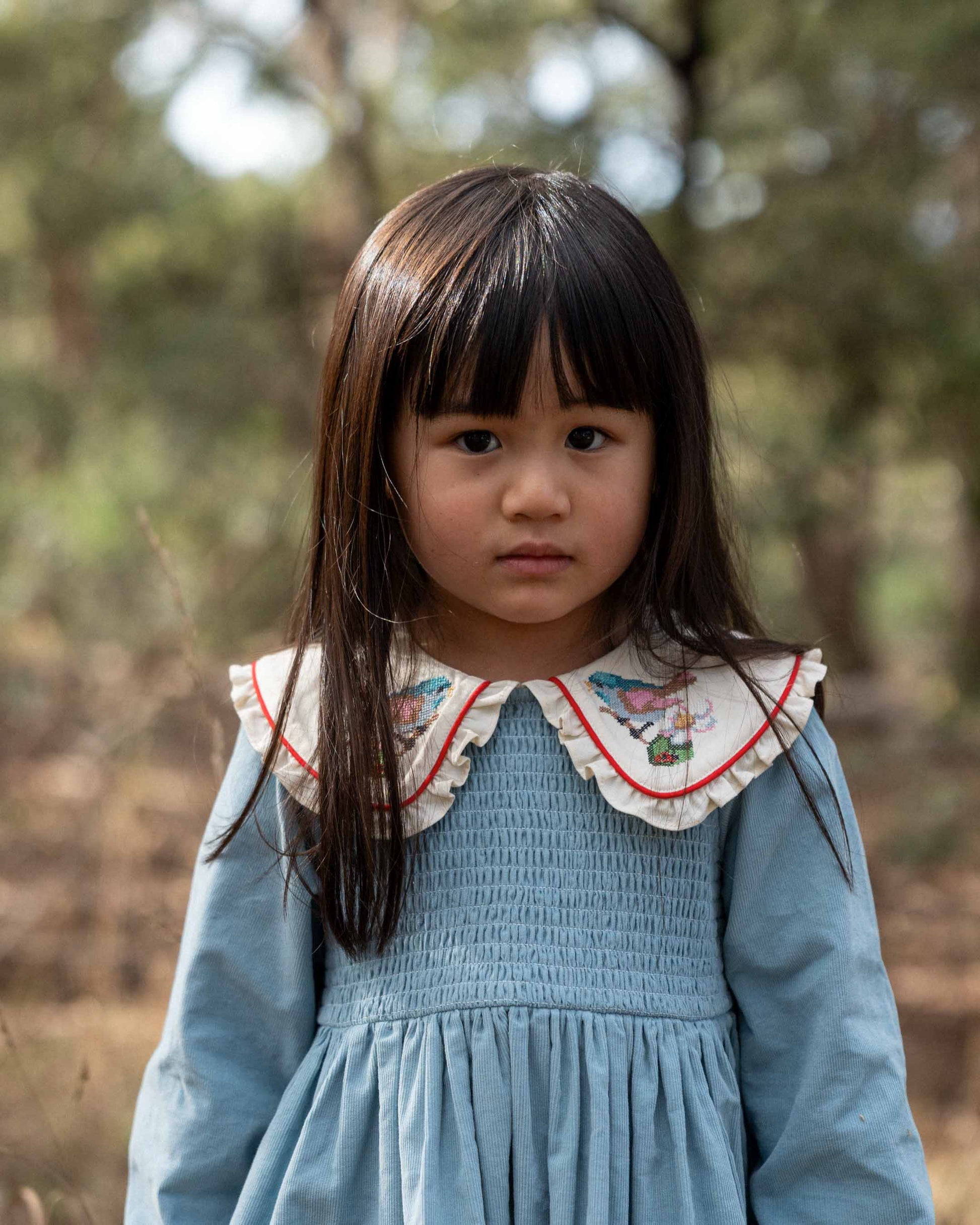 This misty blue pincord dress with an oversized white collar trimmed in bright crimson piping, and delicate cross-stitched finches, is a sure to become treasured heirloom piece — ideal for the most special days of your little ones lives.