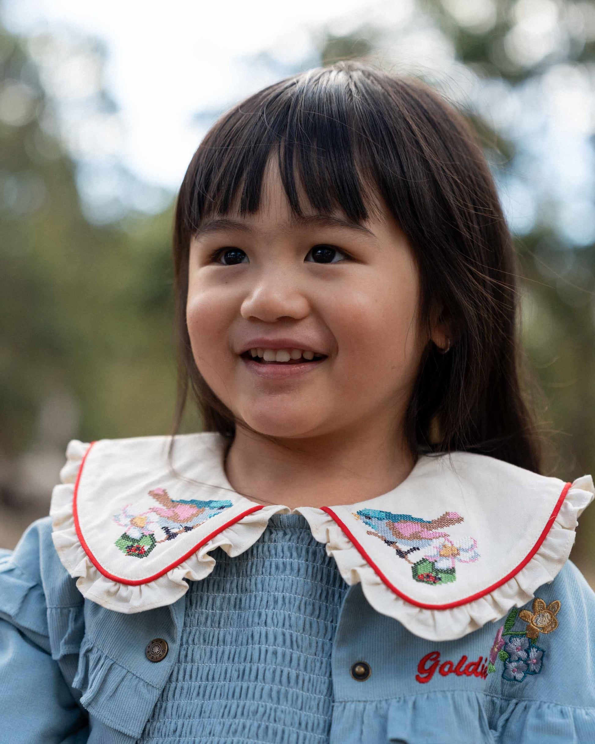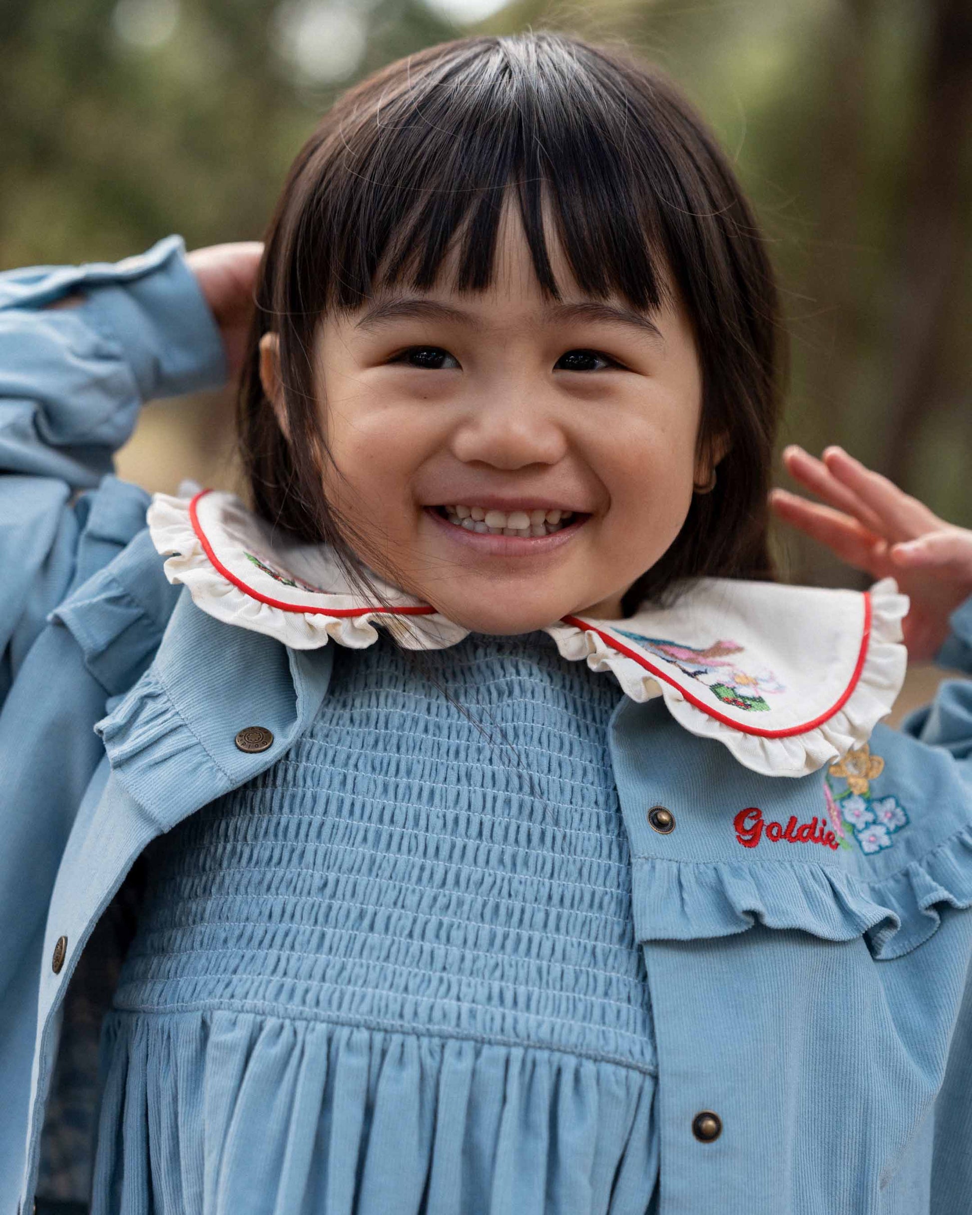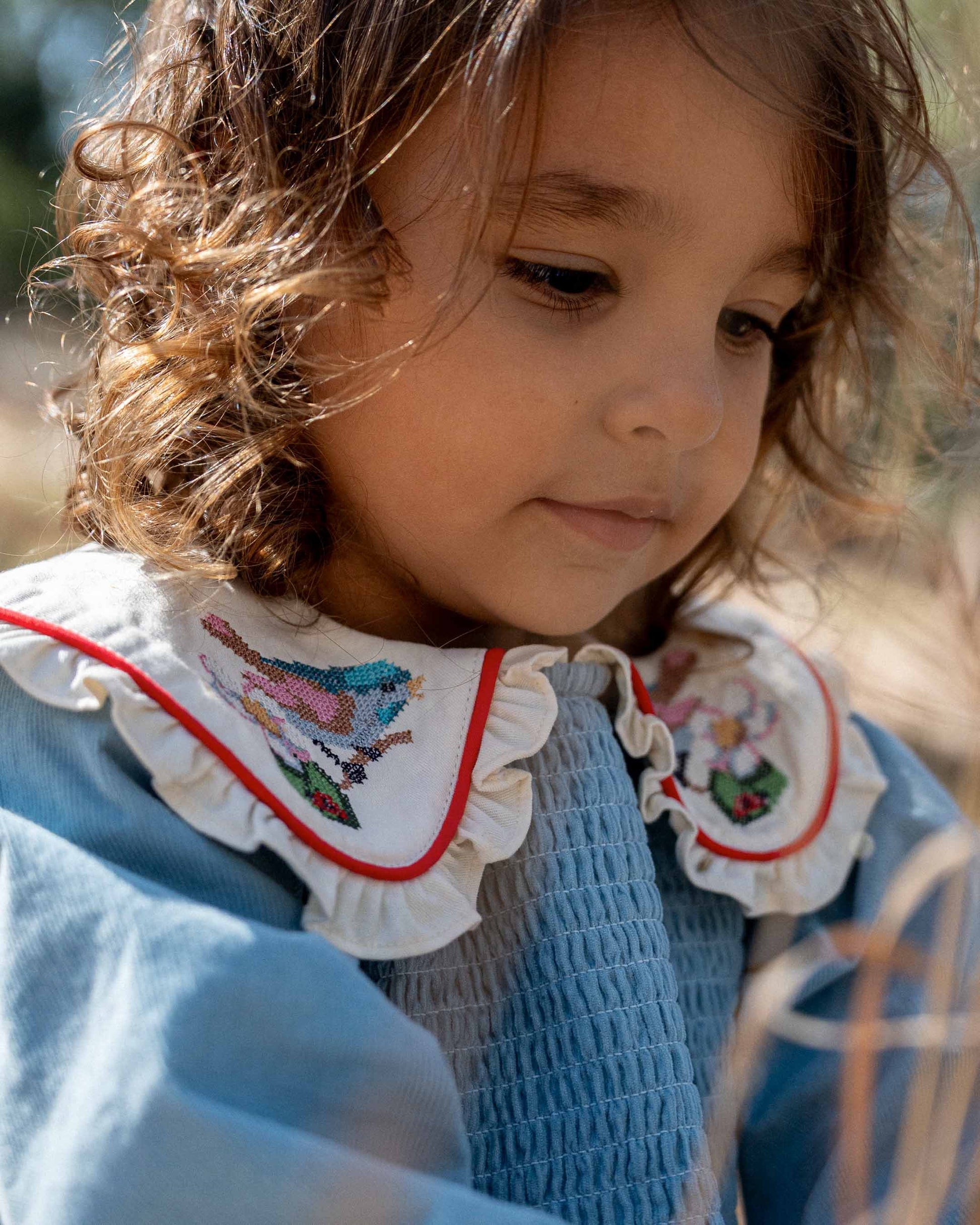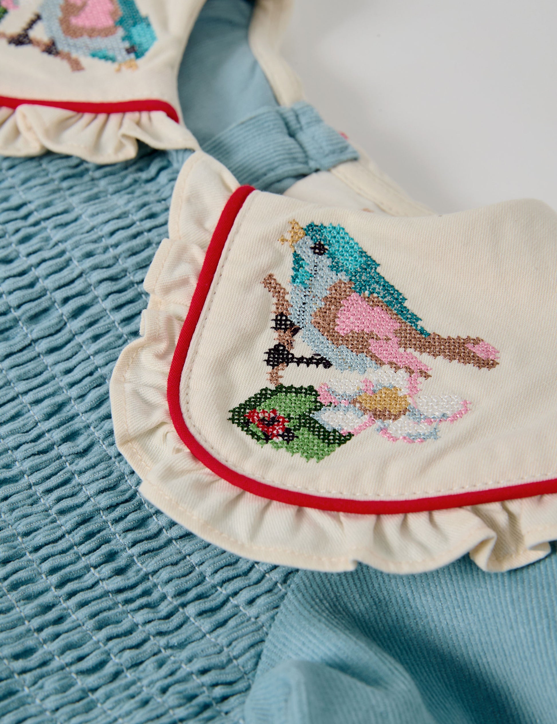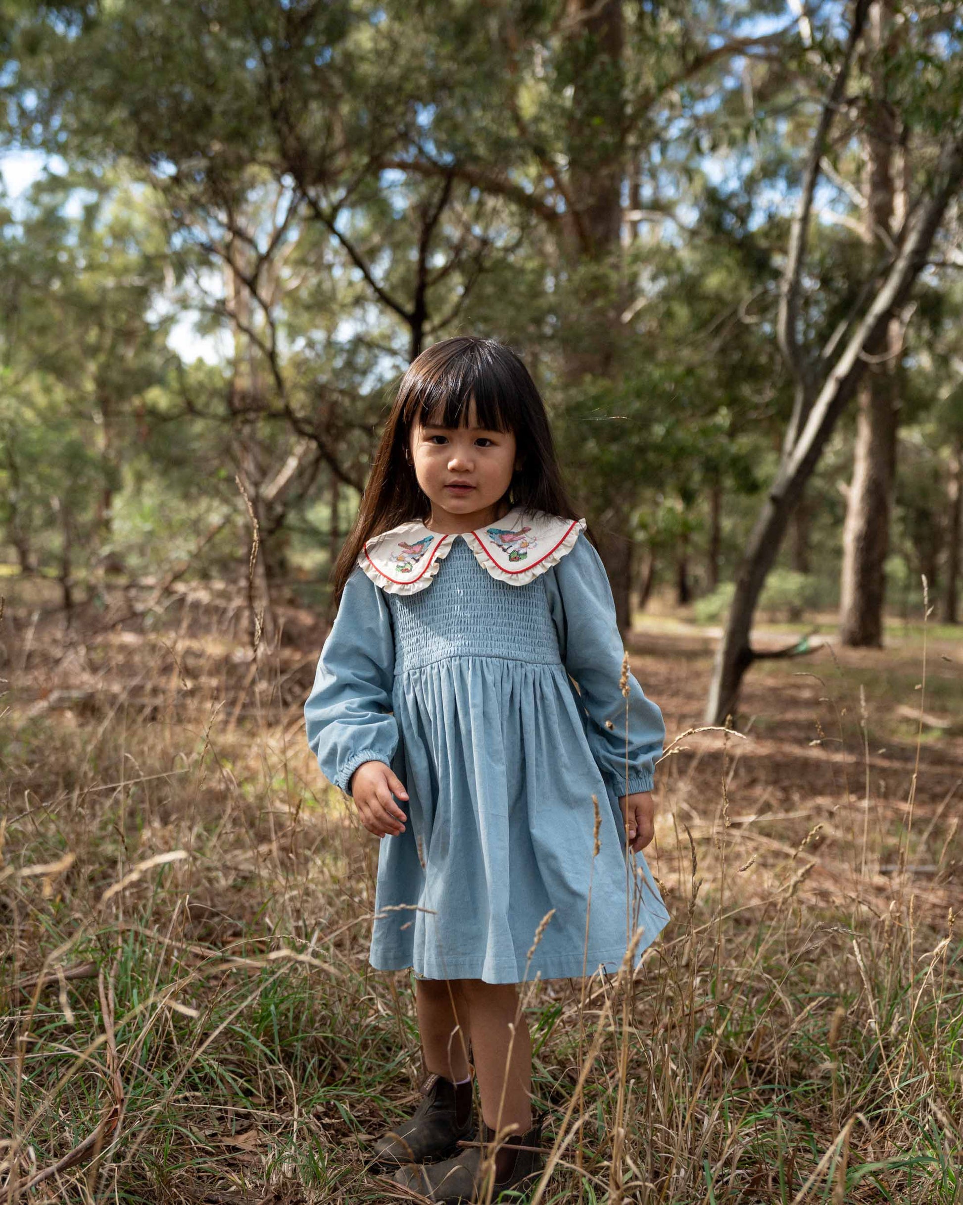 This misty blue pincord dress with an oversized white collar trimmed in bright crimson piping, and delicate cross-stitched finches, is a sure to become treasured heirloom piece — ideal for the most special days of your little ones lives.