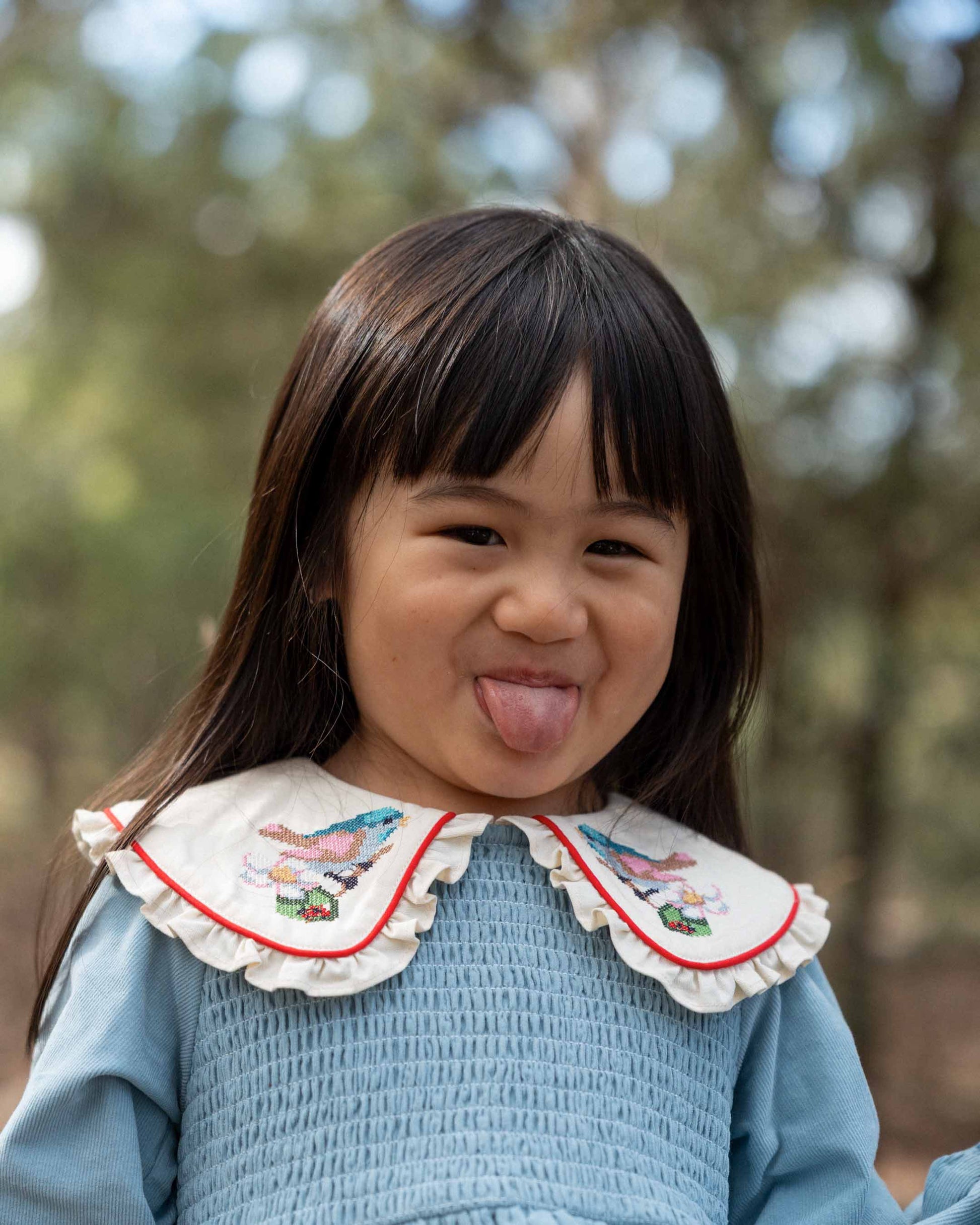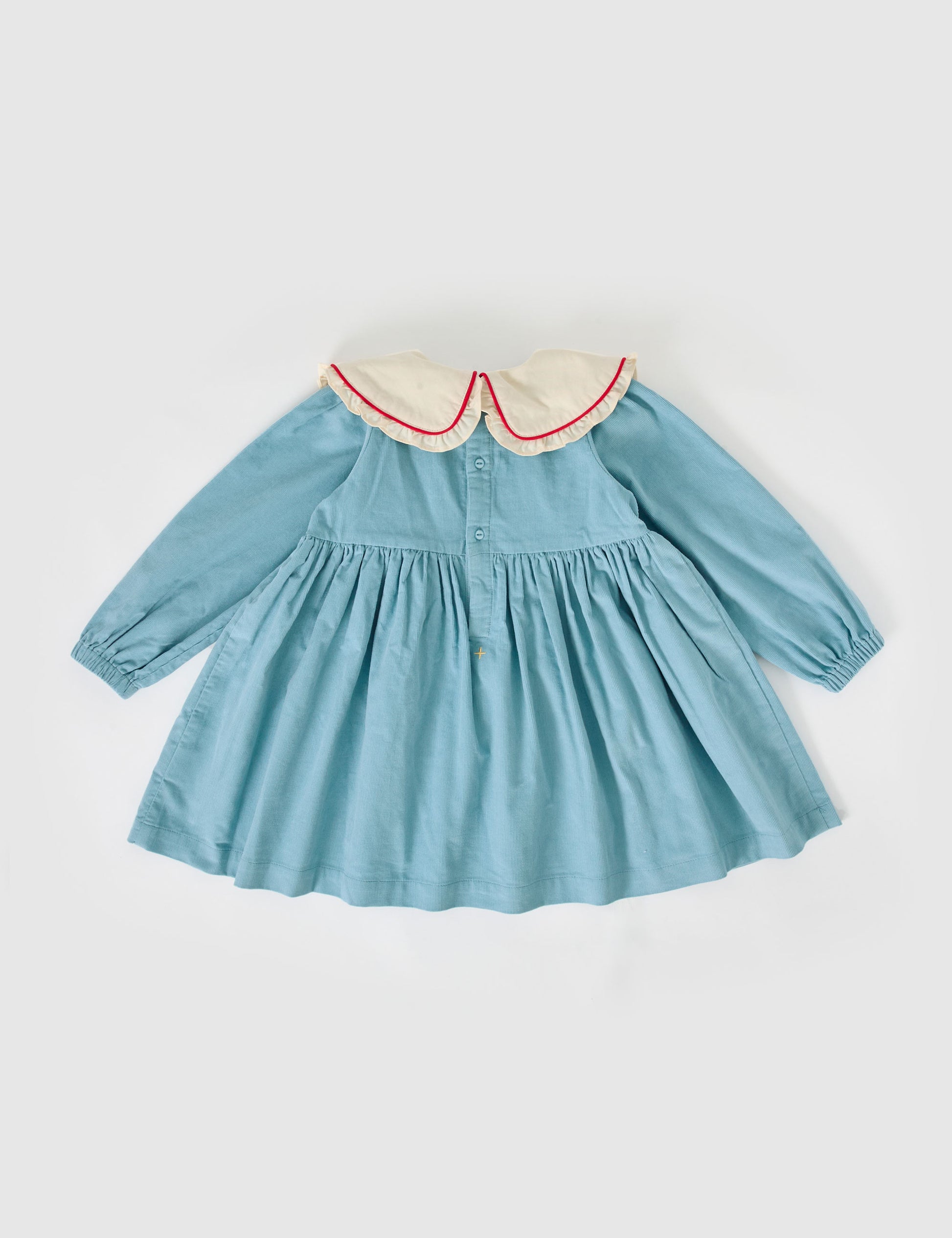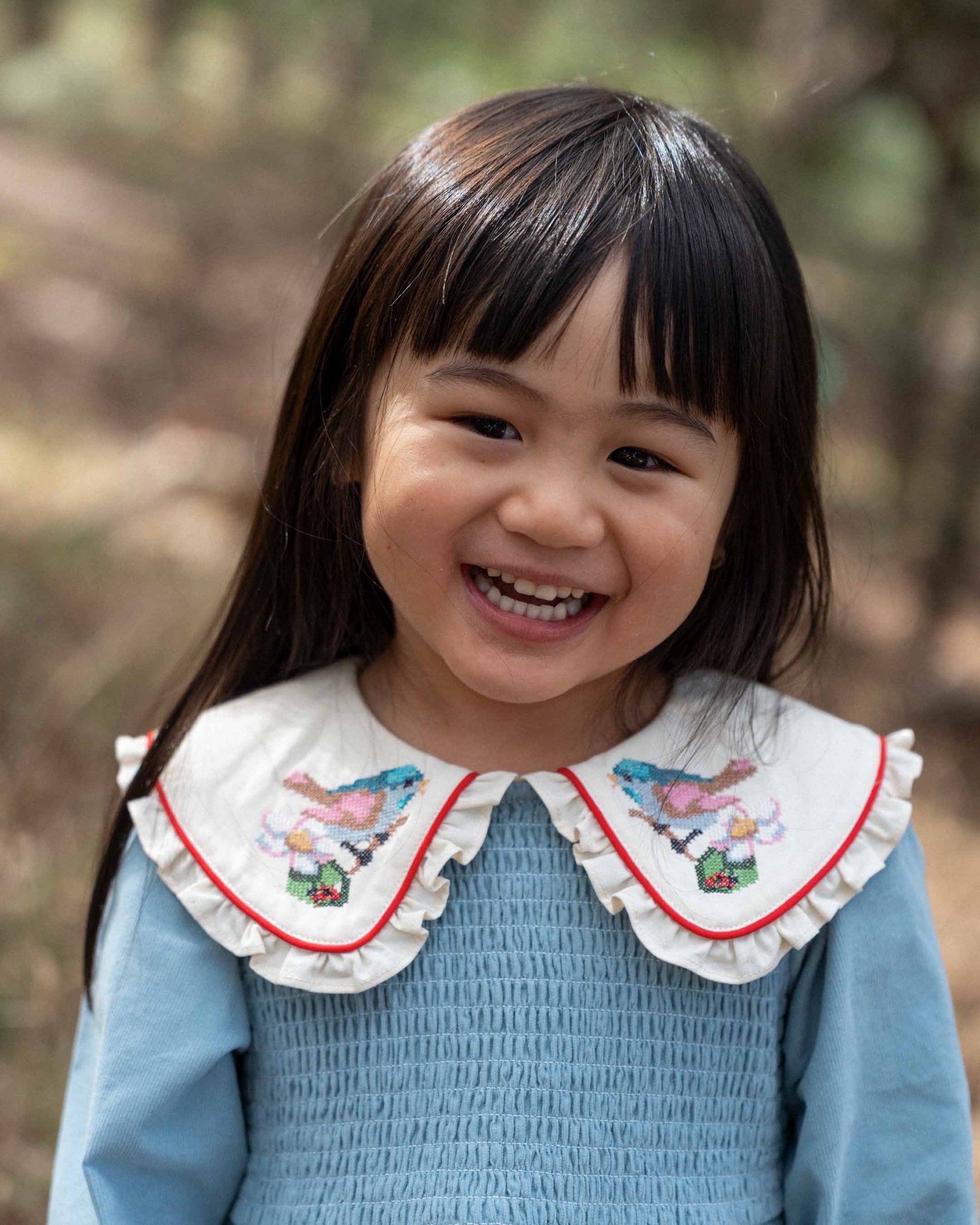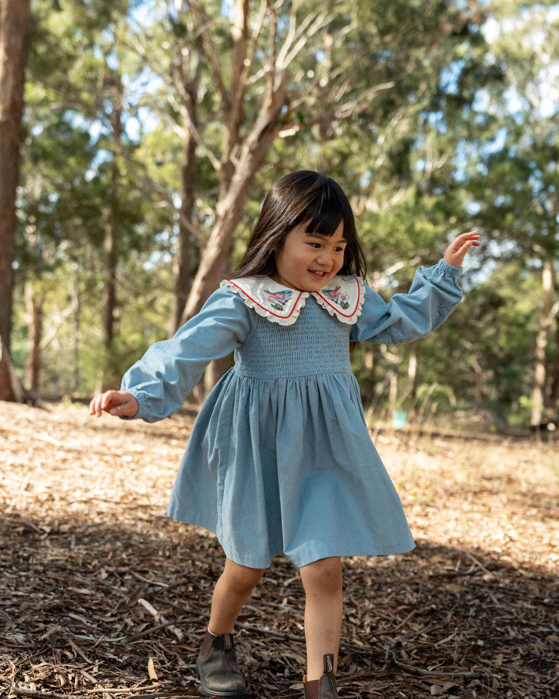 This misty blue pincord dress with an oversized white collar trimmed in bright crimson piping, and delicate cross-stitched finches, is a sure to become treasured heirloom piece — ideal for the most special days of your little ones lives.