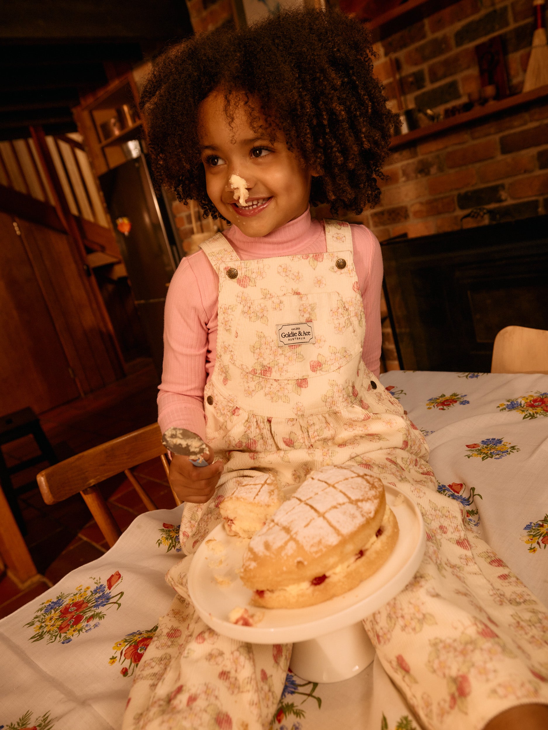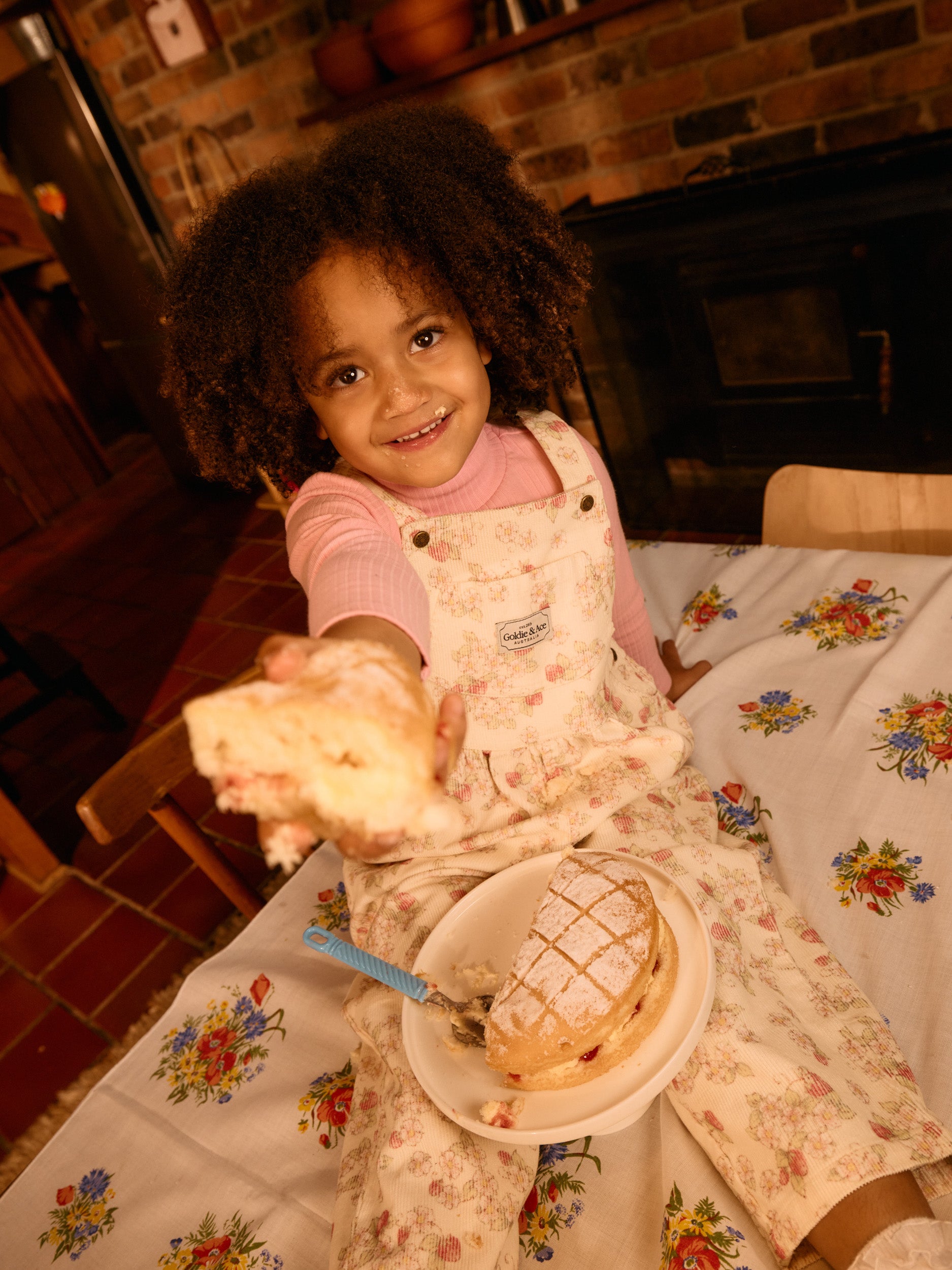 Cream cotton corduroy overalls with a vintage strawberry print and adjustable straps – a playful little number made for climbing, collecting treasures, and exploring strawberry fields.