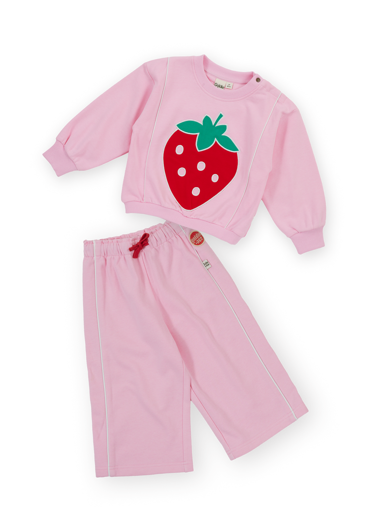 Go big or go home. Giant strawberry energy up top, fun piped wide-leg sweats down below. Sweet, bold, and ready for playground shenanigans.