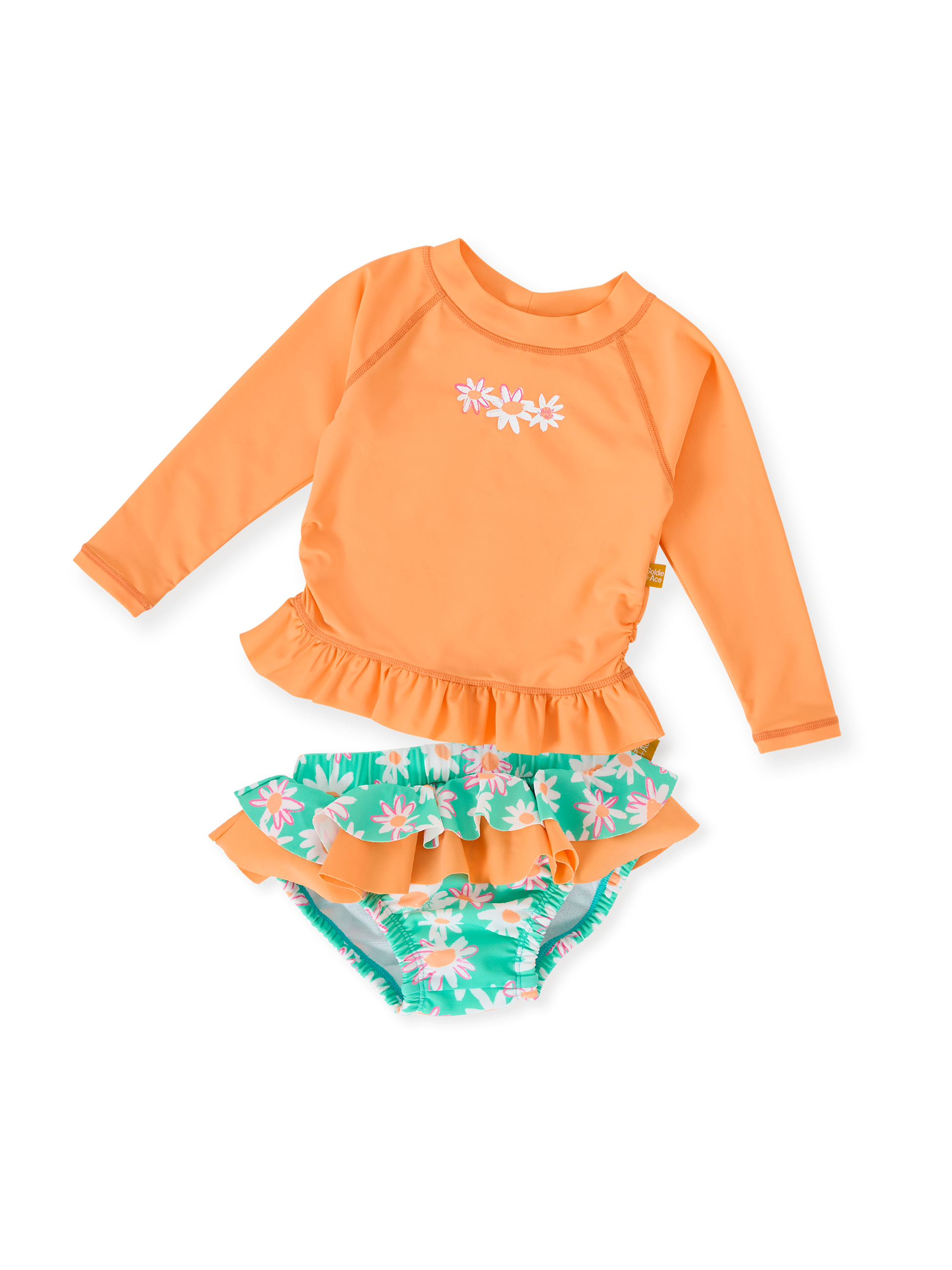 Sunny days, sorted. A bright orange rashguard with a daisy chain up top, and a cheeky turquoise swim nappy with a pop of orange down below. Made for long swims, big splashes, and babies who refuse to get out of the water until they’re wrinkly as raisins.
