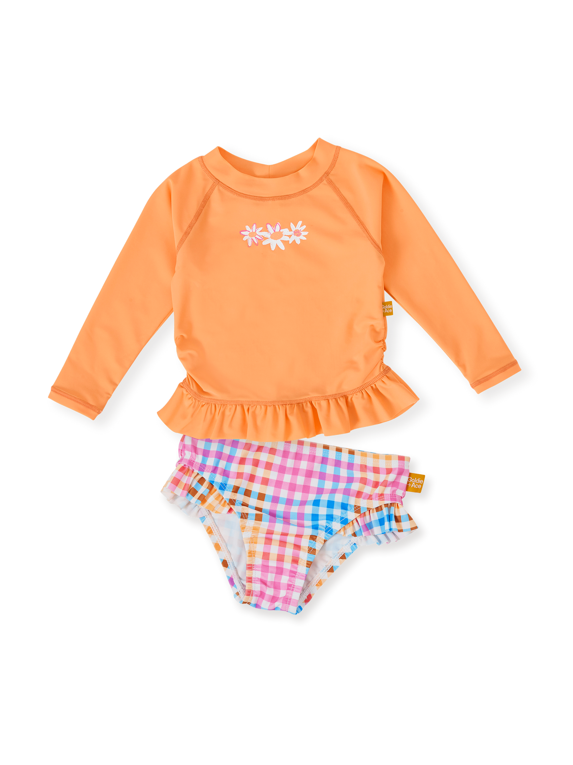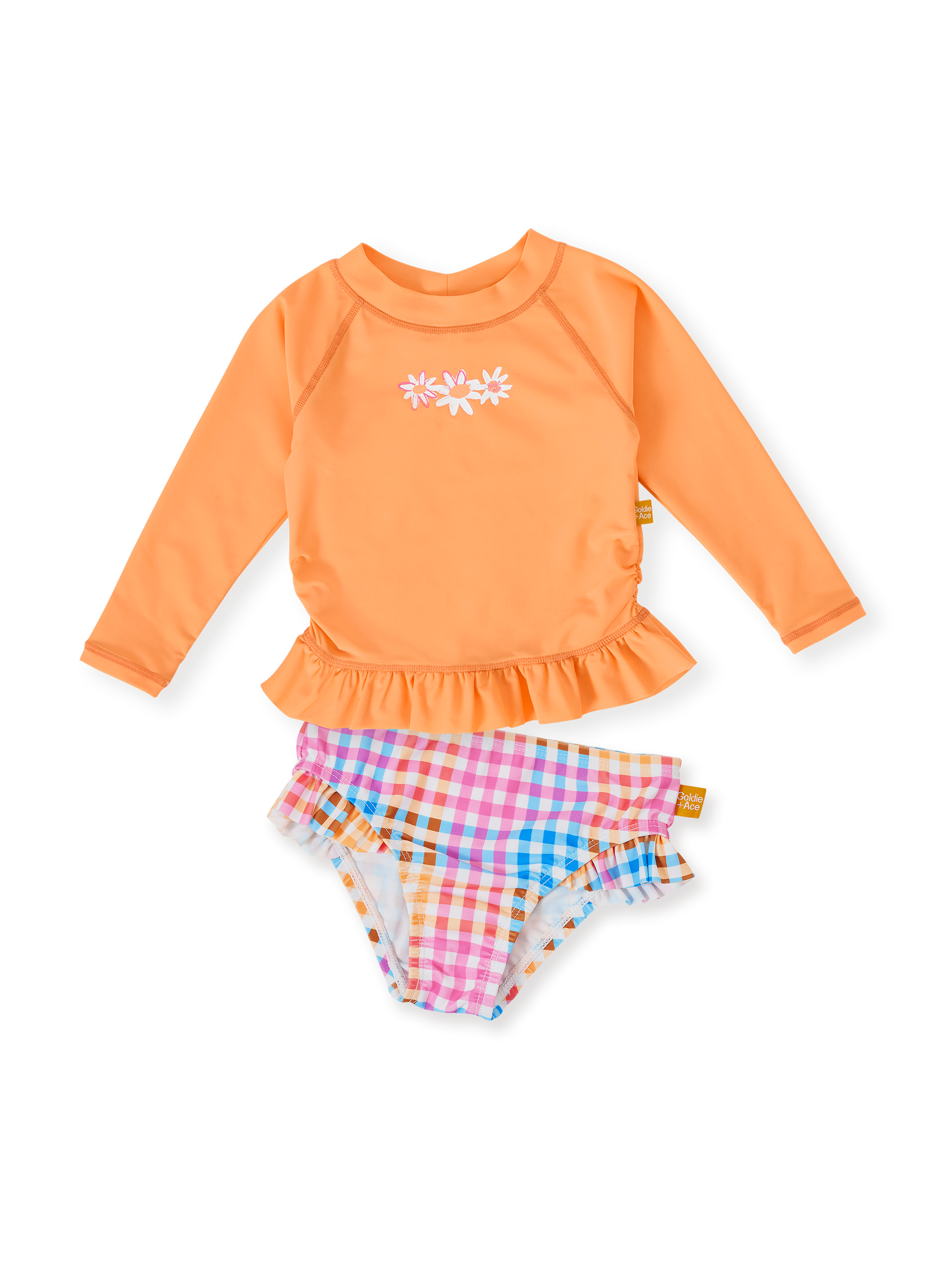 Sunny days, sorted. A bright orange rashguard with a daisy chain up top, and a colourful rainbow bottom. Made for long swims, big splashes, and kids who refuse to get out of the water until they’re wrinkly as raisins.