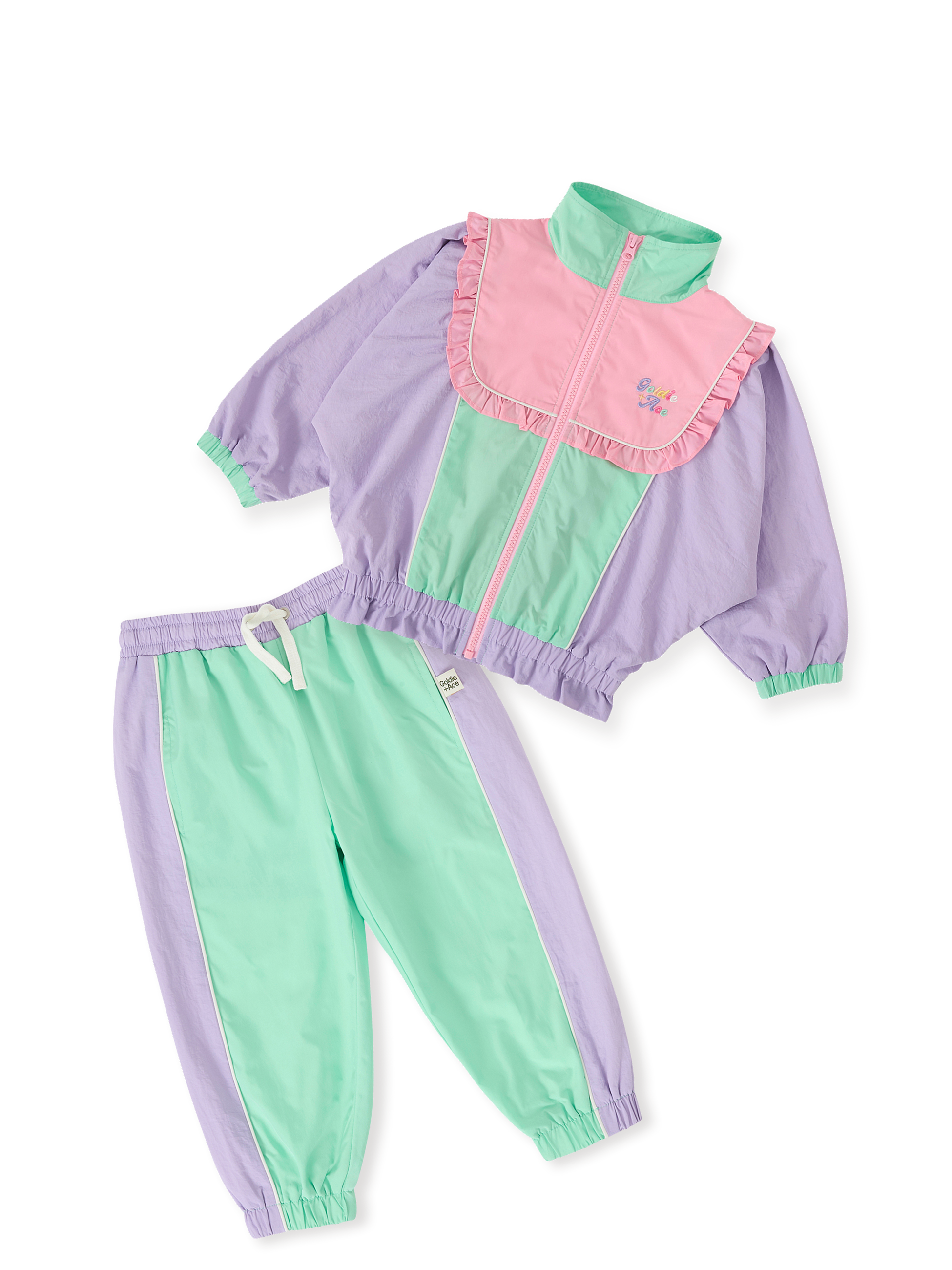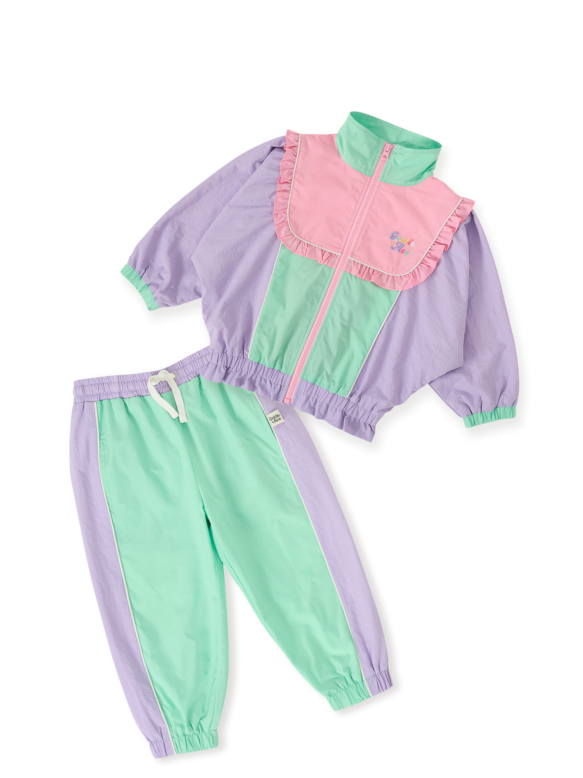 All the retro vibes, all the comfort — this frilled-up jacket and matching sporty pants bring pastel pops, colour block cool, and move-all-day freedom. For the high-climbers, the cartwheel-champions, and every little frill-seeker in between.