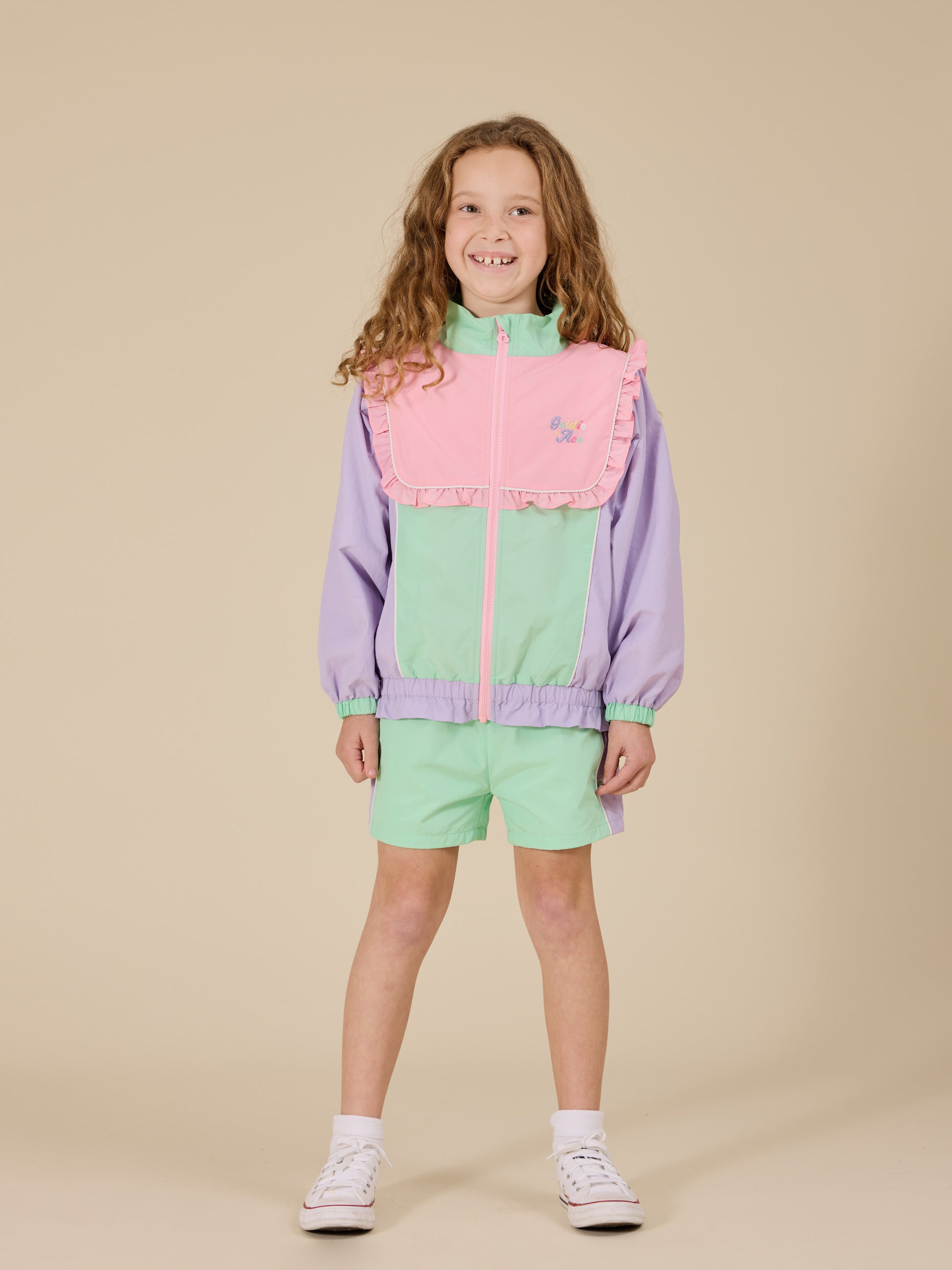 Retro energy, pastel pops, and just the right amount of frill — this jacket-and-shorts combo is made for kids who move fast and stand out doing it. From colour block climbs to 80s-inspired sprints, this is playwear turned power outfit.
