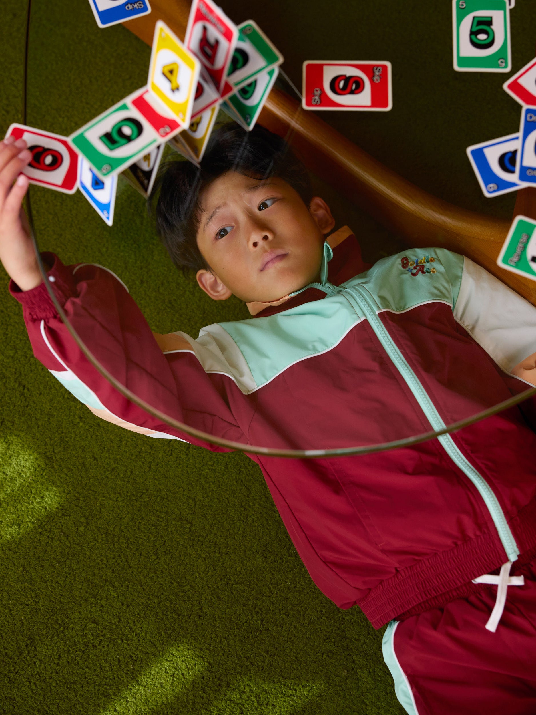 From the playground dash to the victory lap home, this jacket-and-pants combo is all about retro cool and all-day comfort. Striped sleeves, a maroon–mint colour pop, and lightweight sporty fabric mean they’ll look ready for the podium — even if they’re just racing to snack time.