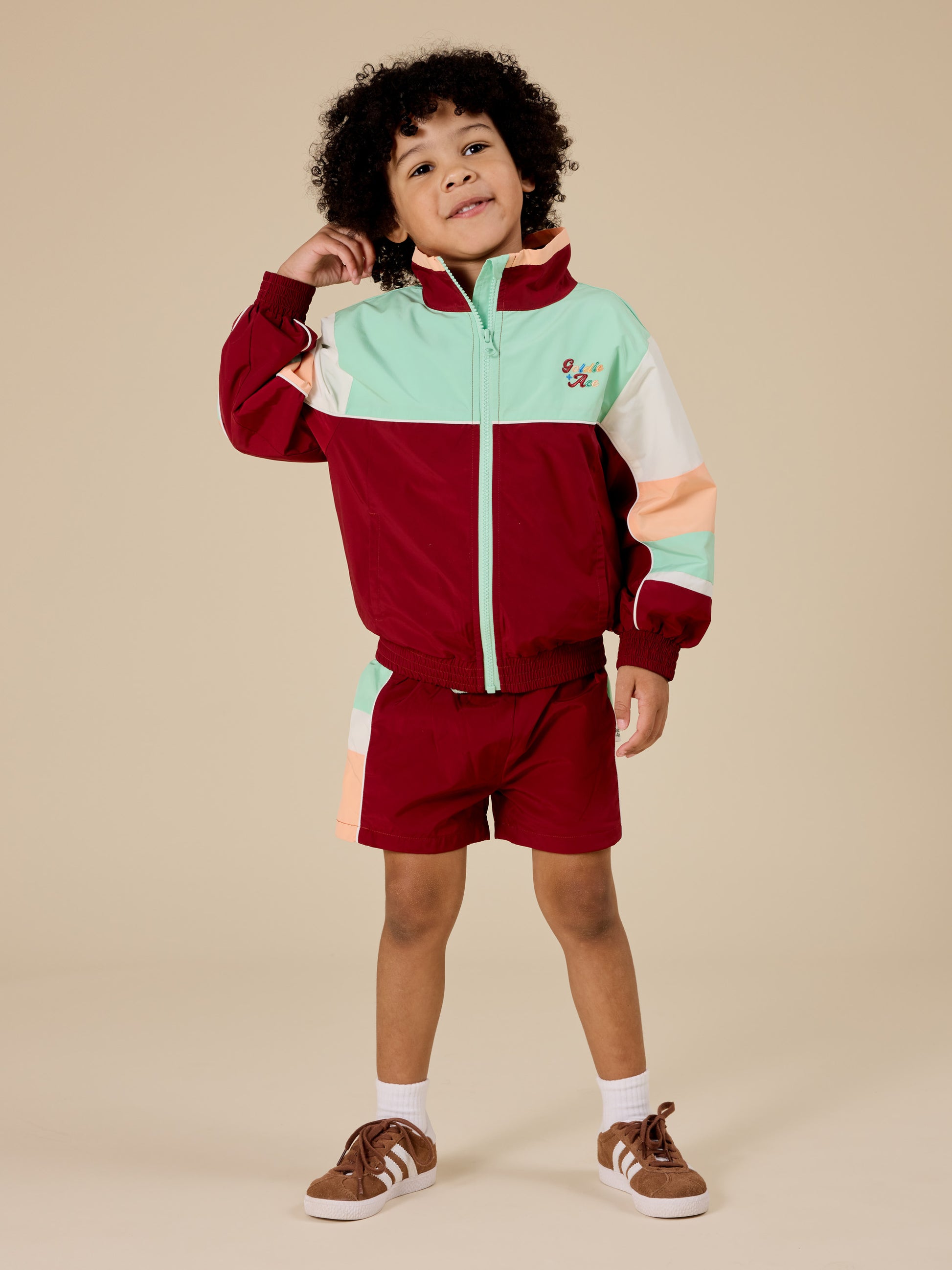 Perfect for little legends in training. This retro jacket and sporty shorts combo packs in the maroon-mint vibes and stripes, ready for everything from playground sprints to last-minute snack chases — all while looking way cooler than they actually feel at 3pm.