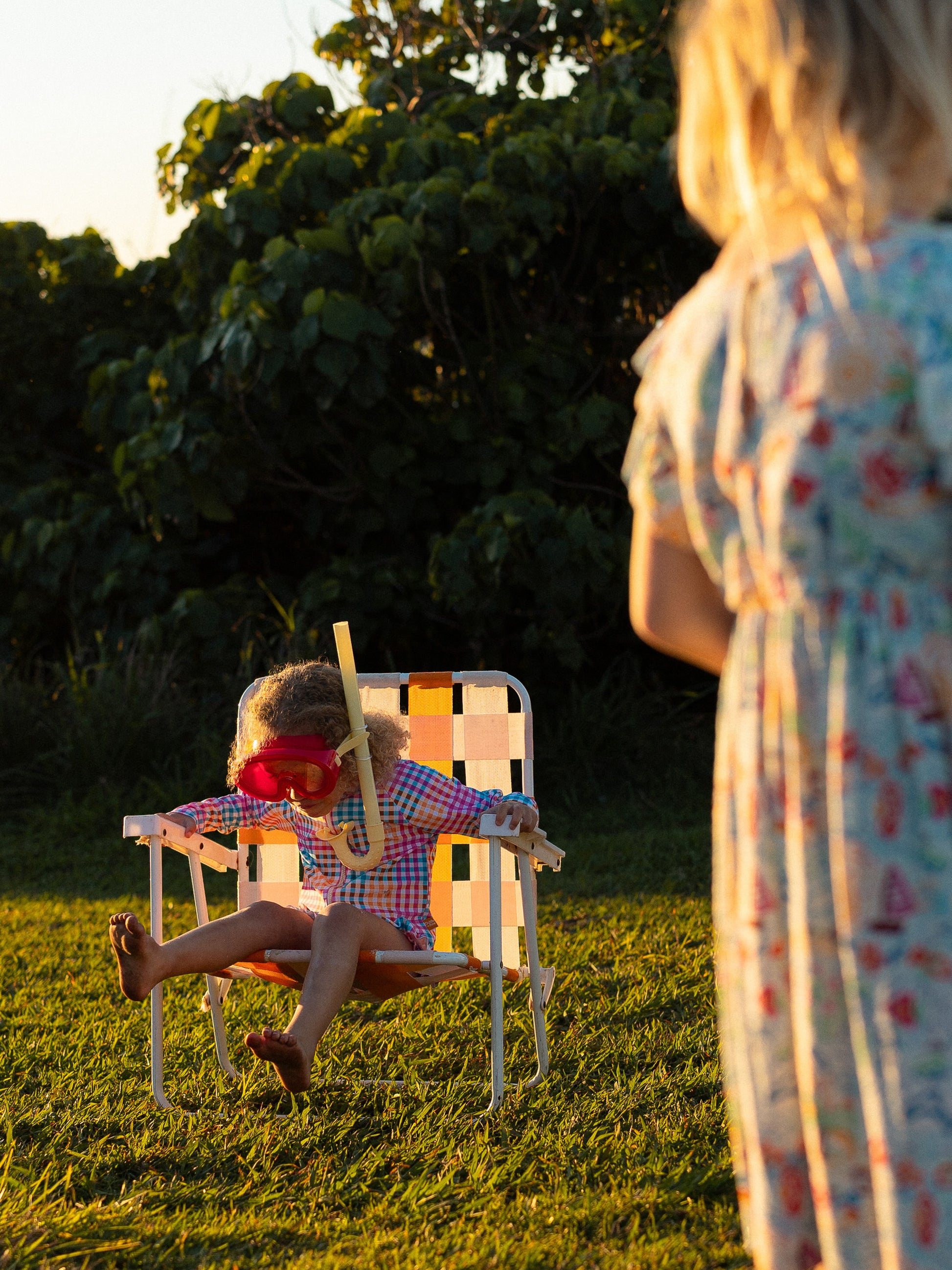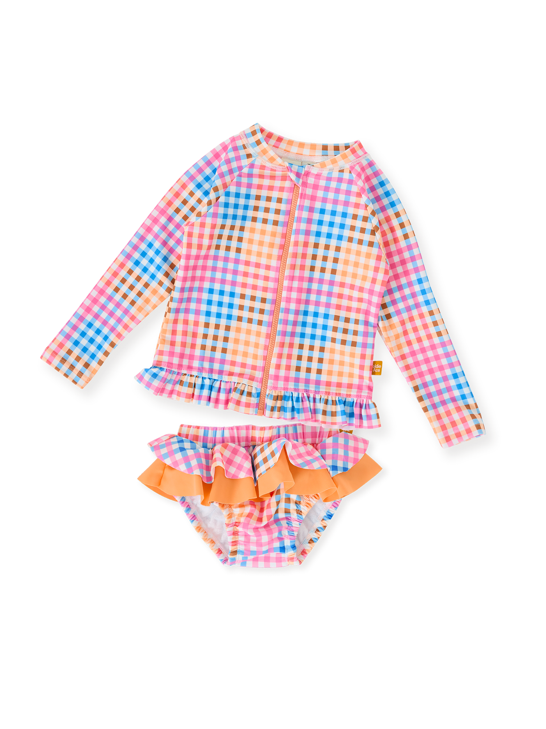 Rainbow checks from top to toe - with a zip-up rashie that keeps things easy and frilly nappy bottoms built for serious sandcastle business. Sun, surf, and a whole lot of colour, all in one go.