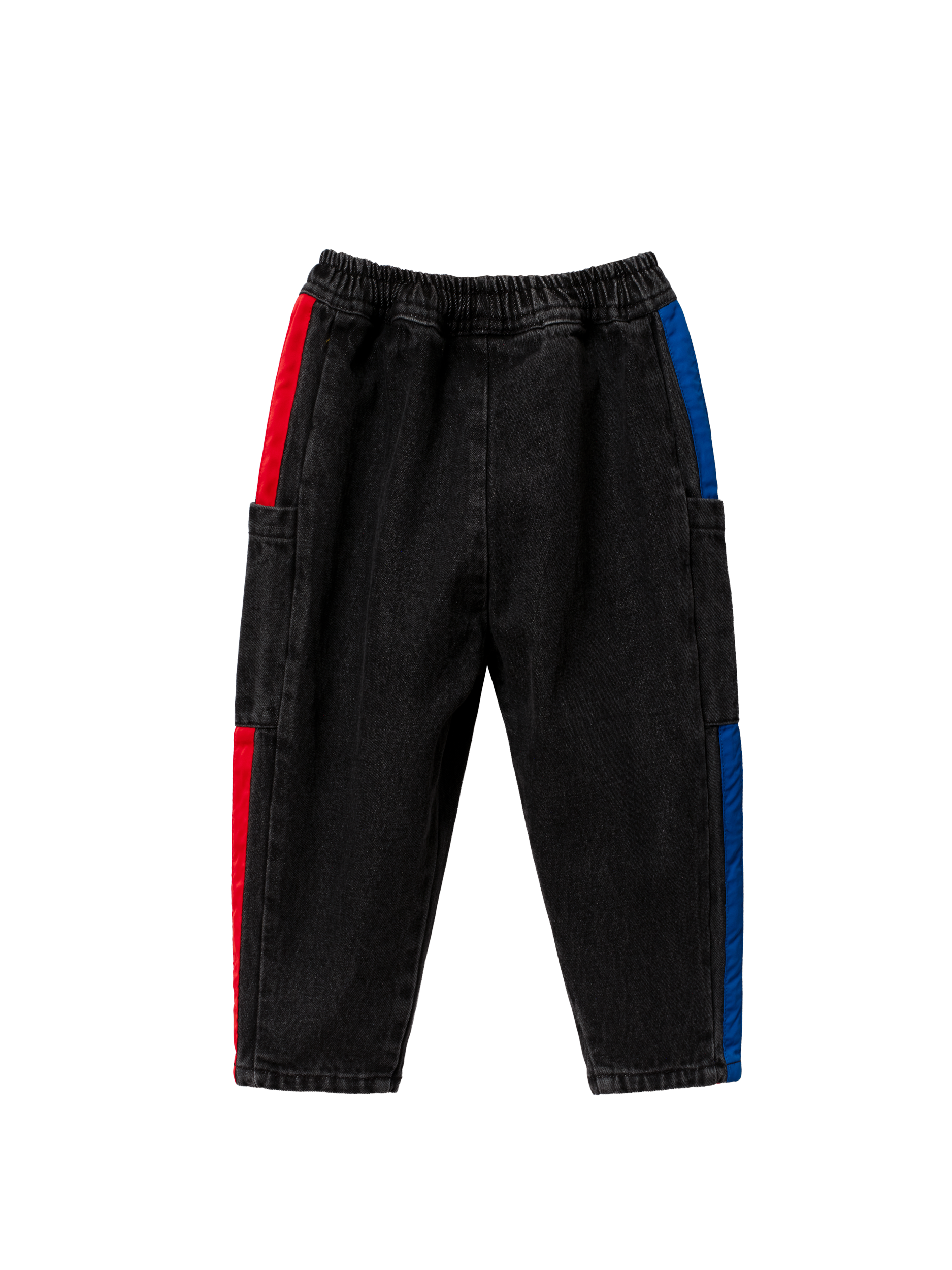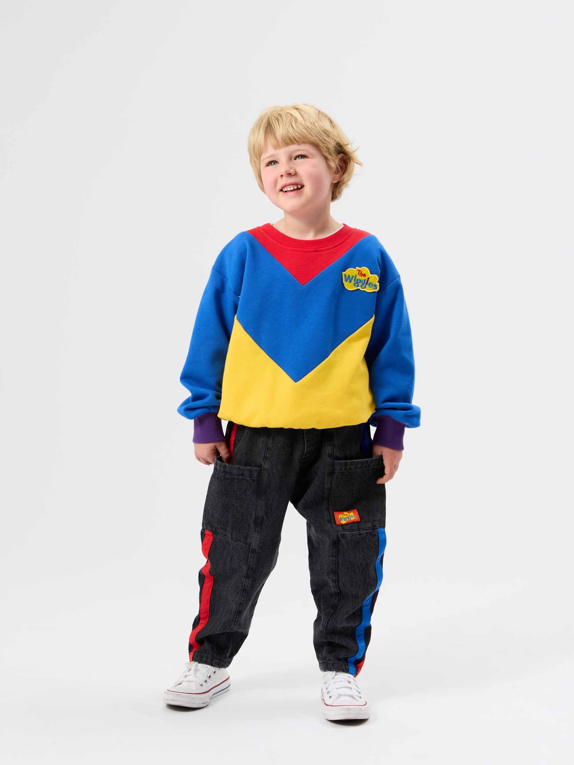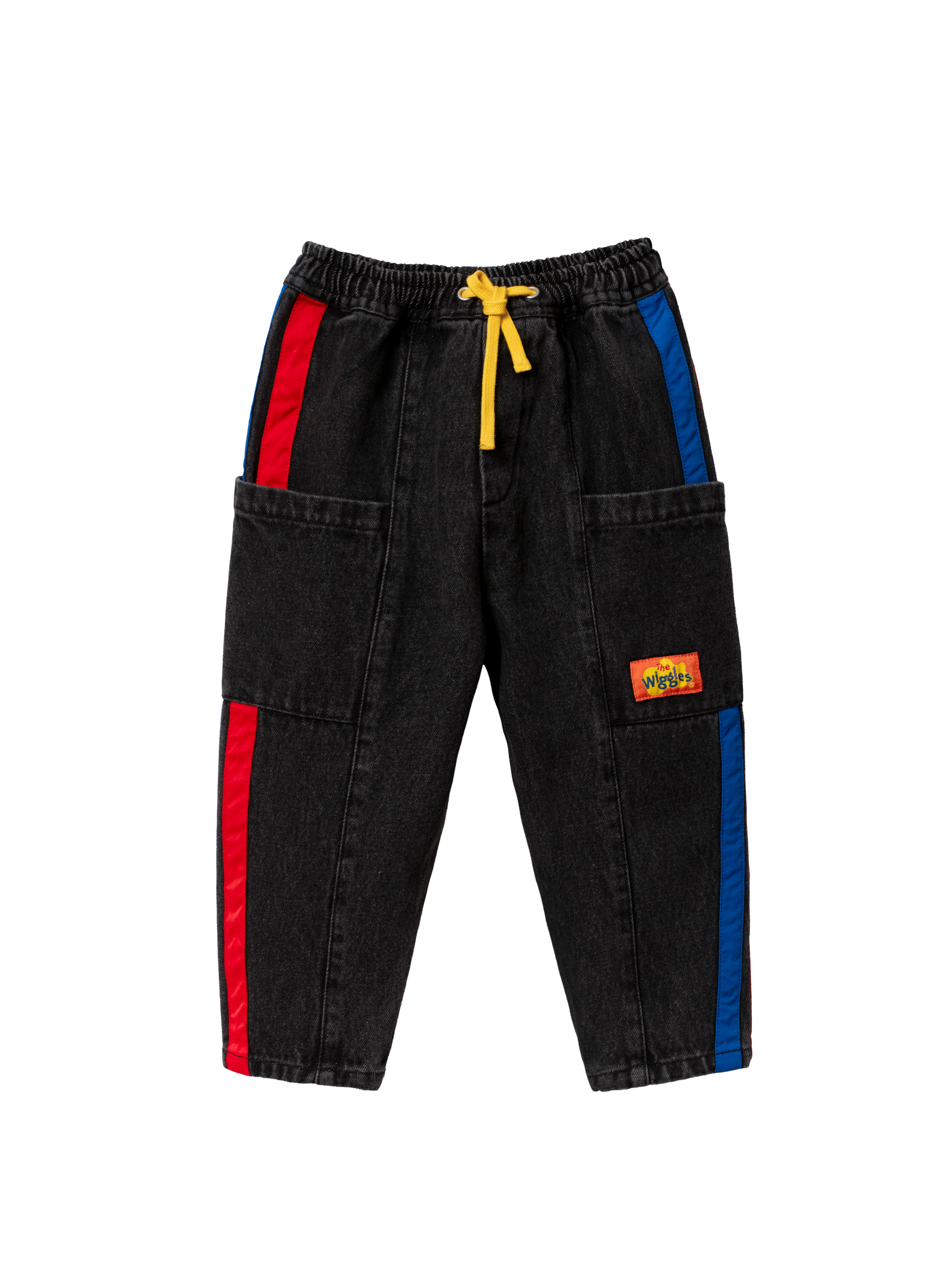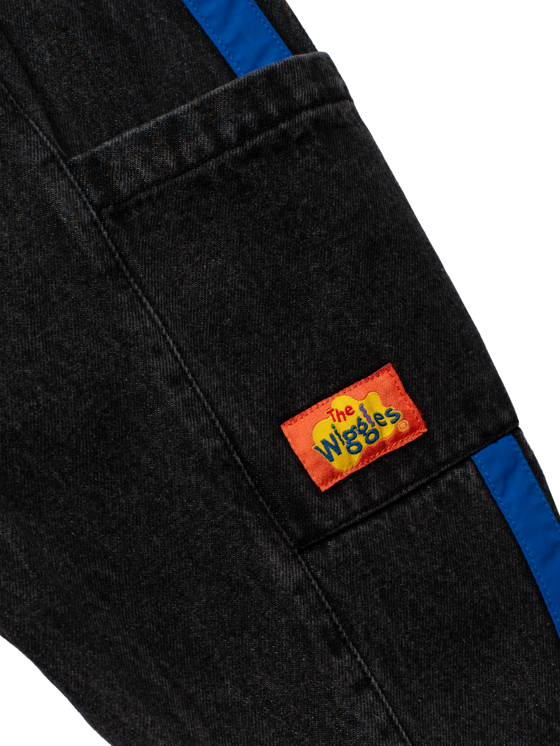 These vintage-washed black denim pants feature sporty blue and red side stripes and a signature Wiggles logo badge, blending everyday comfort with Wiggles-worthy style.