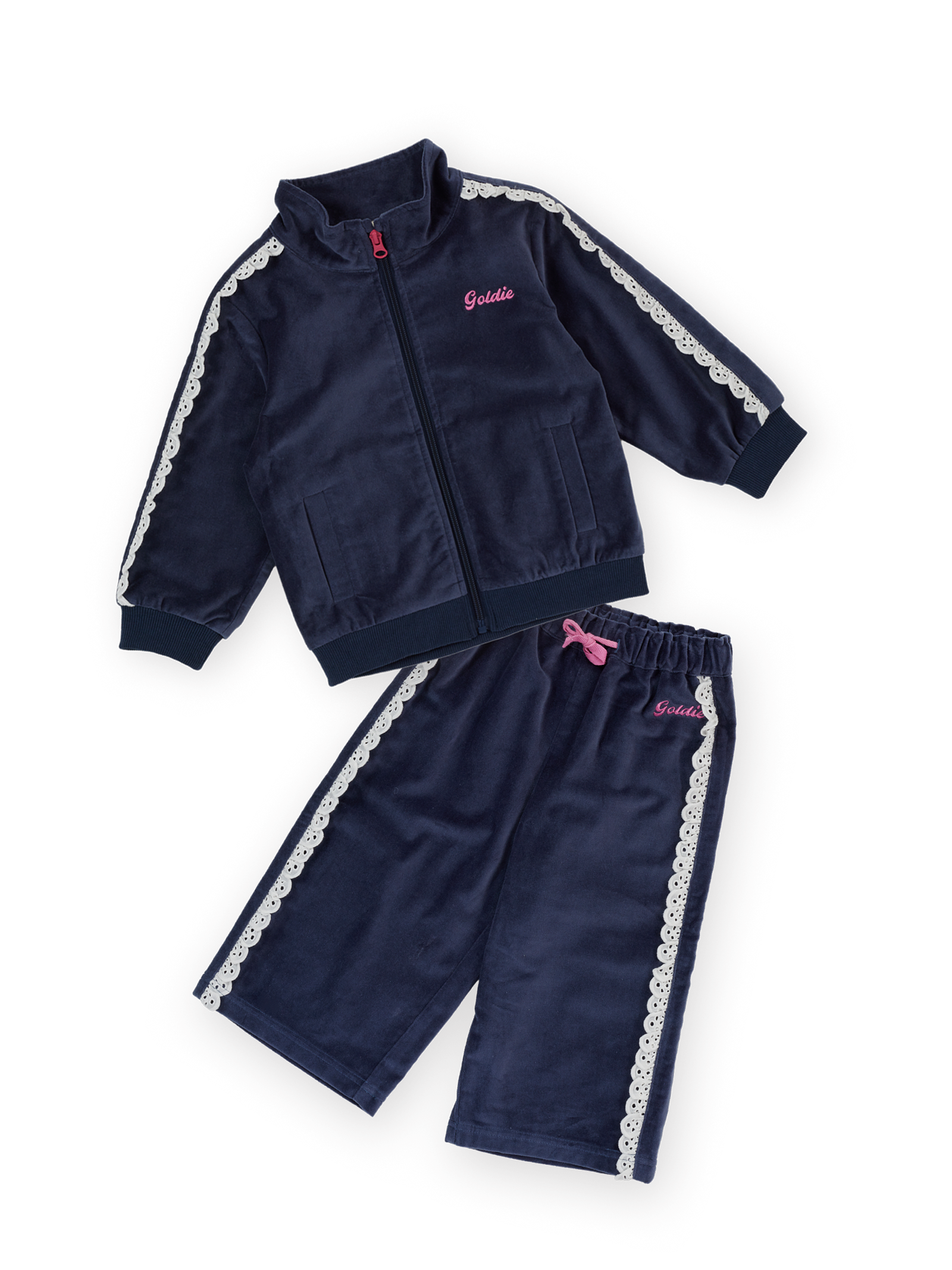 Velour with a little extra flair. Soft, plush, and finished with broderie details—equal parts comfy and fancy (but still ready for mischief).