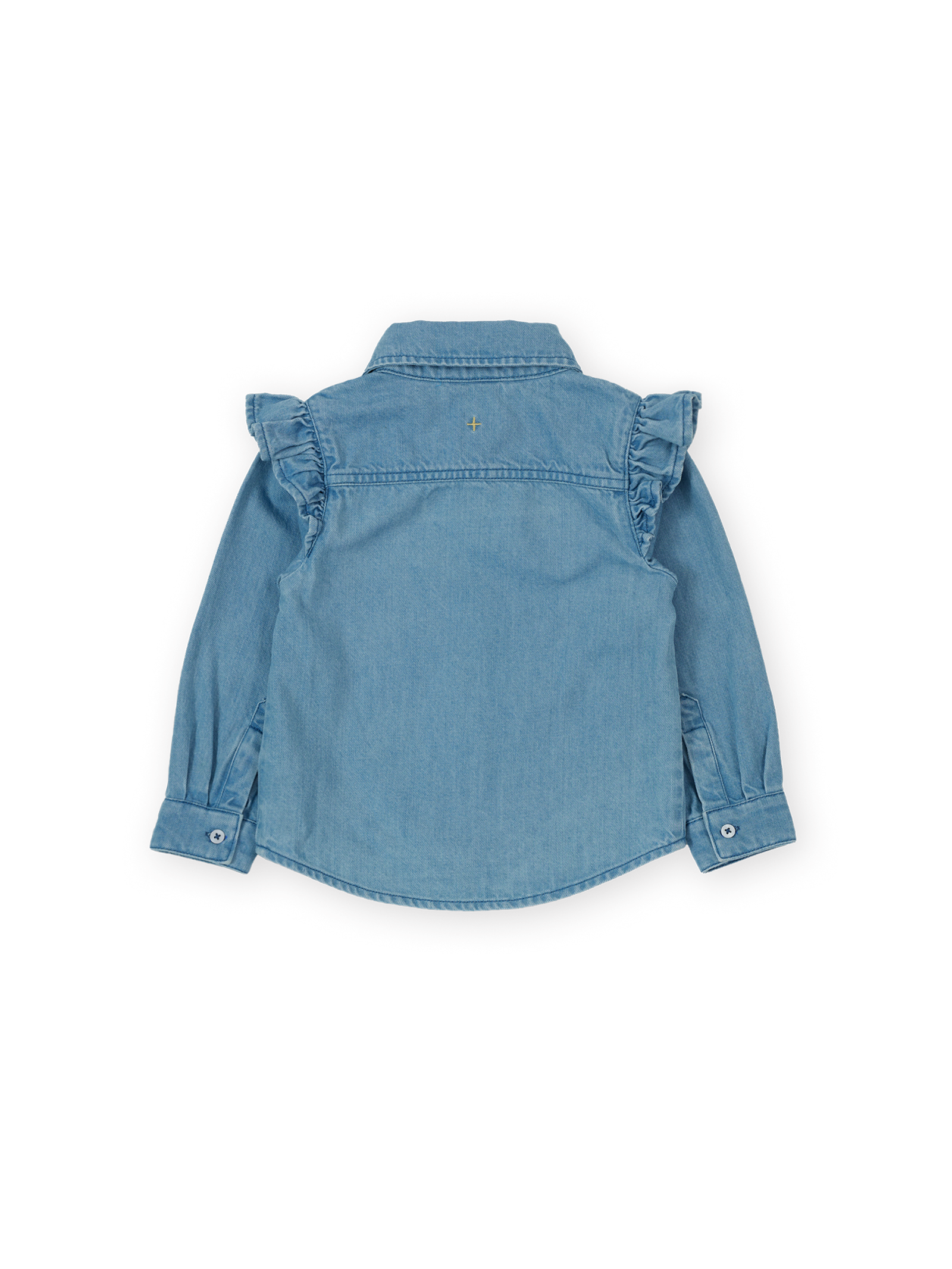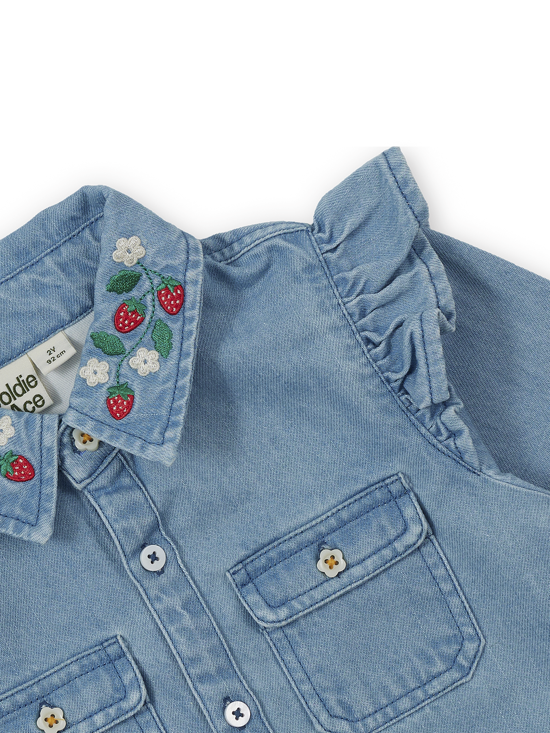Vintage-style blue chambray shirt with a button-through front and daisy icon buttons, finished with sweet strawberry embroidery on the collar.