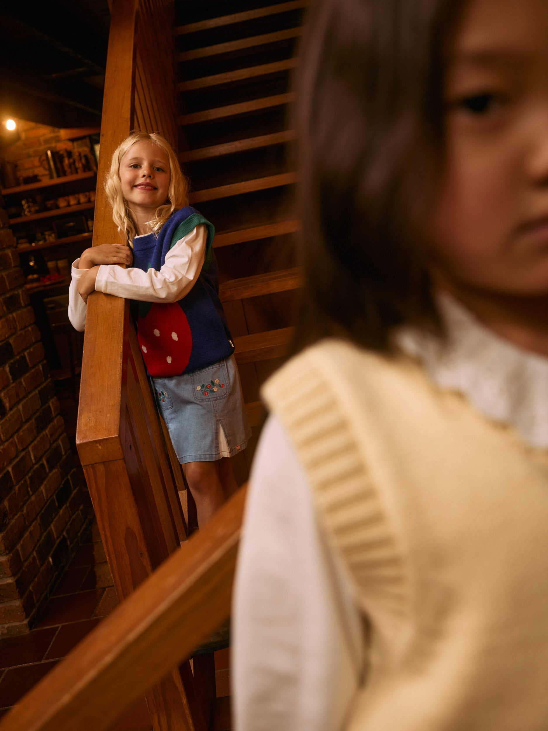 Vintage blue denim chambray skirt with little strawberry embroidery on the back pockets – a sweet surprise when they spin around. With an adjustable waist and functional pockets, it’s an easy, throw-on-and-go piece with plenty of charm.